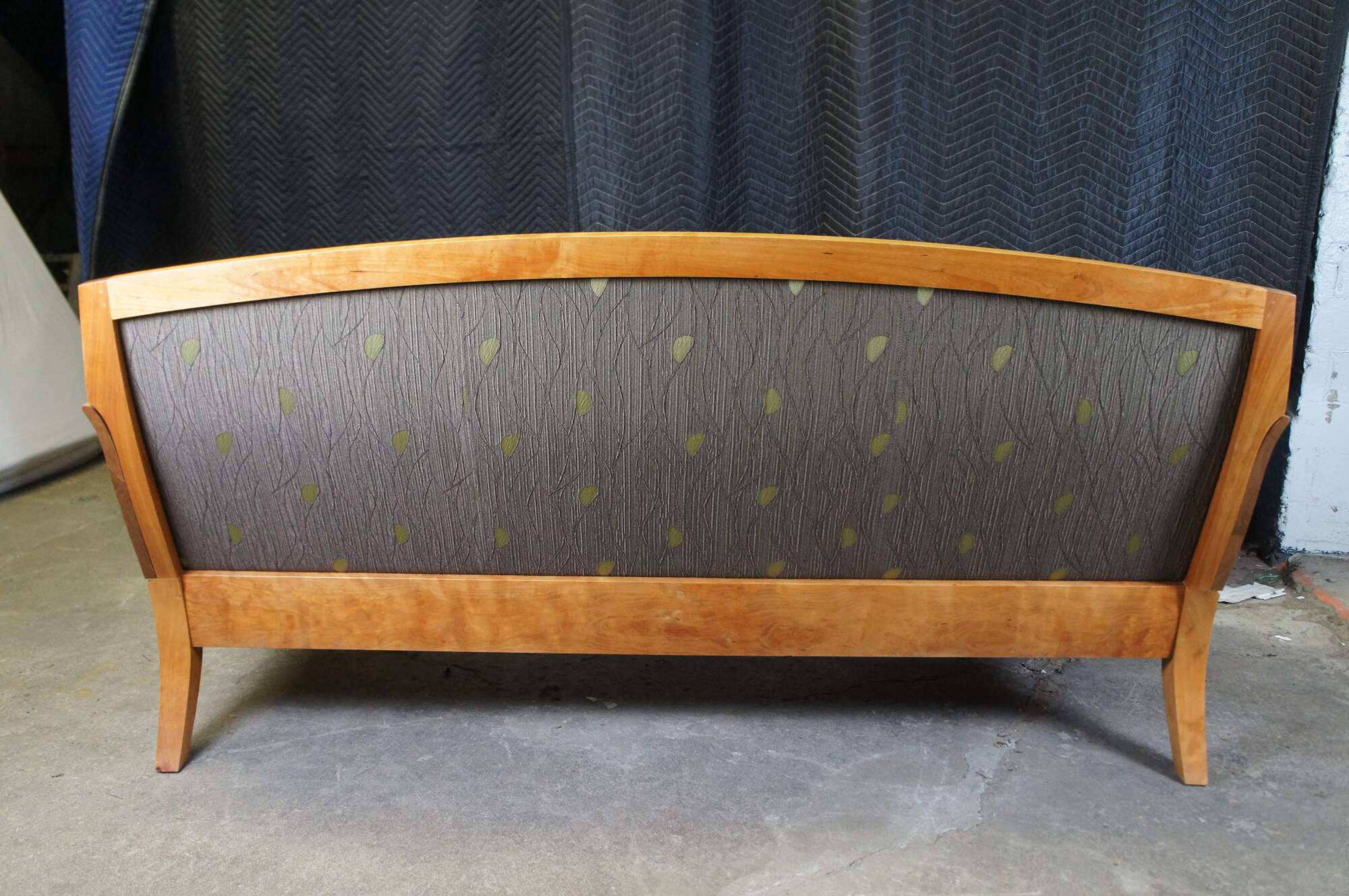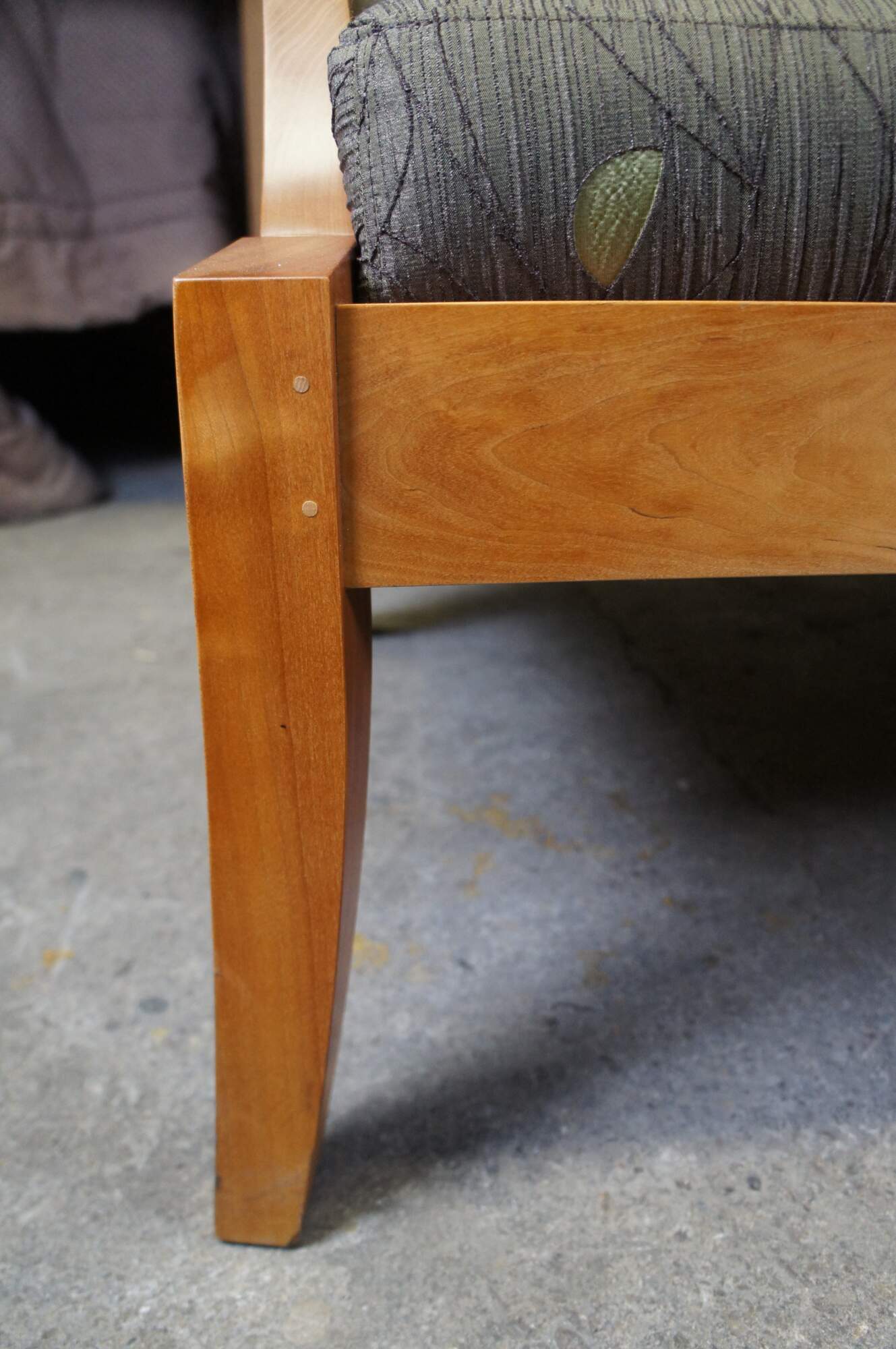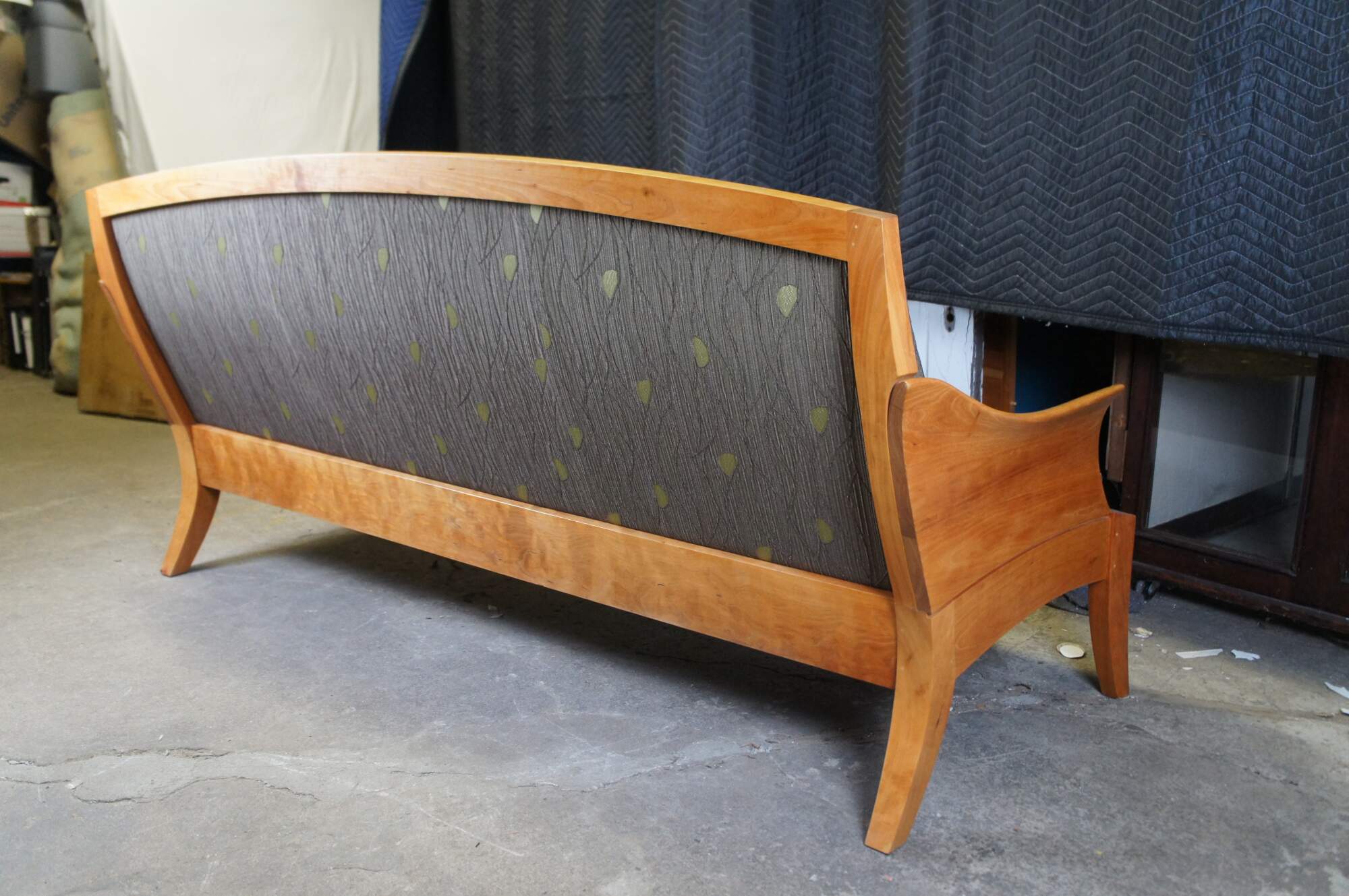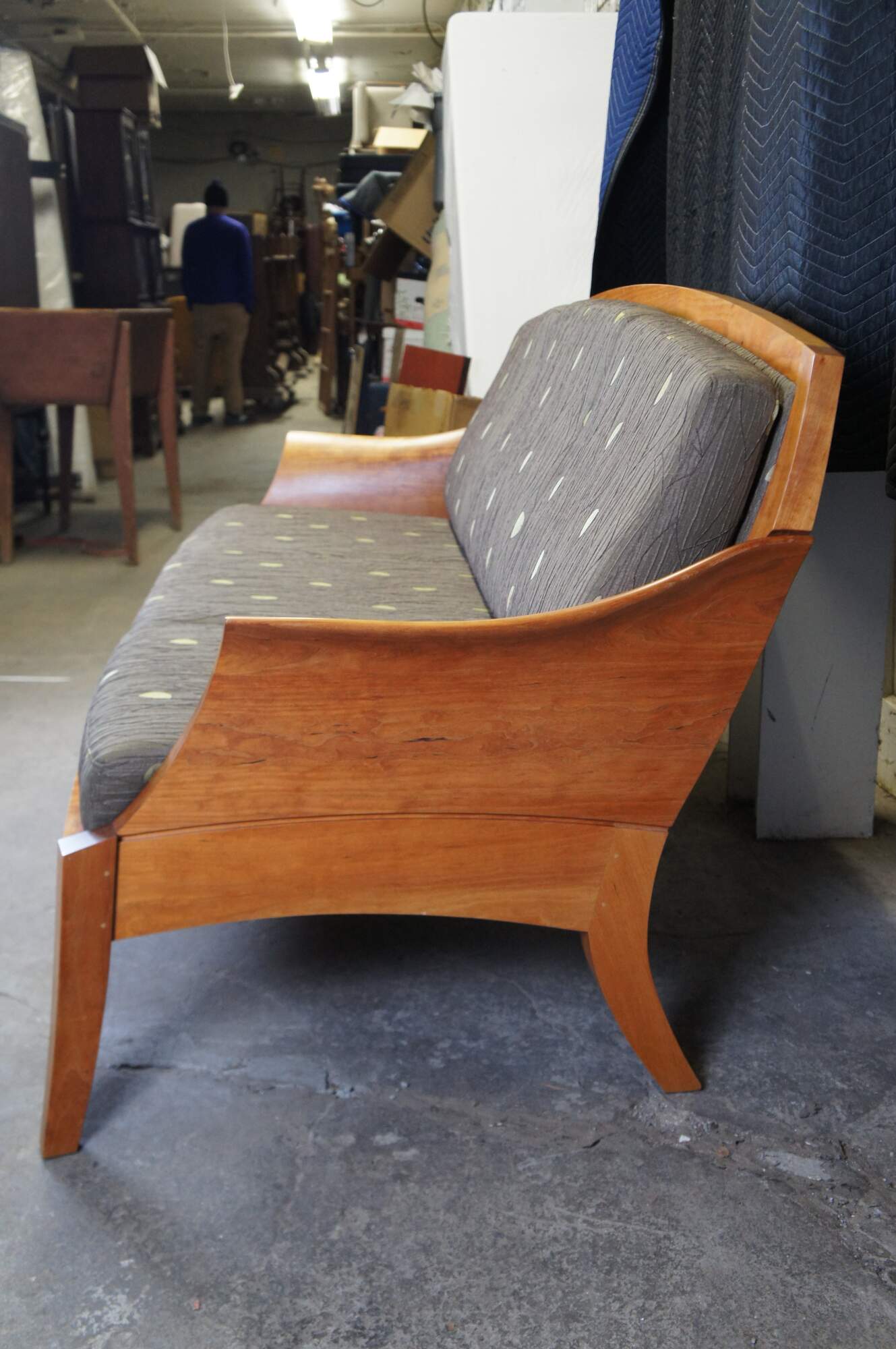 Vintage Thos Moser cherry Three Place Wing Sofa. With curved arms sculpted from grain matched solid wood, the Wing Three Place Sofa marries our handcraft and hallmark aesthetics with true comfort. Tracing its lineage back to an 18th-century Queen Anne chair, the sofa brings new relevance to old forms, coaxing solid cherry into freestanding art. The Wing Three Place Sofa is the satisfying result of artfully integrating both wood and upholstery to create a piece that both complements and defines the space it occupies. Made by Jasper Brann circa 2007. Thomas Moser Cabinetmakers Auburn, Maine.