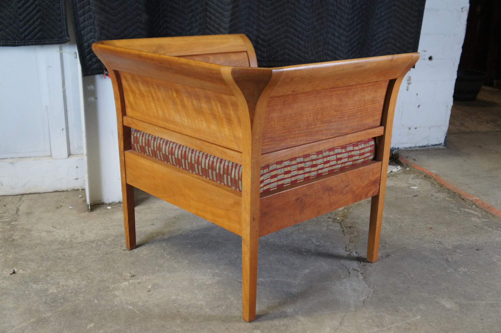 Two vintage large Thos Moser Sofia office / lounge armchairs. Made of cherry featuring modern styling with square and flared form, and paneled accents. Perhaps no other piece we've designed better celebrates the natural glory of cherry and our desire to create objects of timeless grace than the Sofia chair. One's eye is drawn along the swirling cherry patterns of its side panels to the darker, delicately tapered corner joint framed between. The long cherry panels and wine-glass-shaped corner joints remind us of the graceful lines of an old wooden boat transom. Circa 2007. Signed on base. Thomas Moser Cabinetmakers Auburn, Maine.