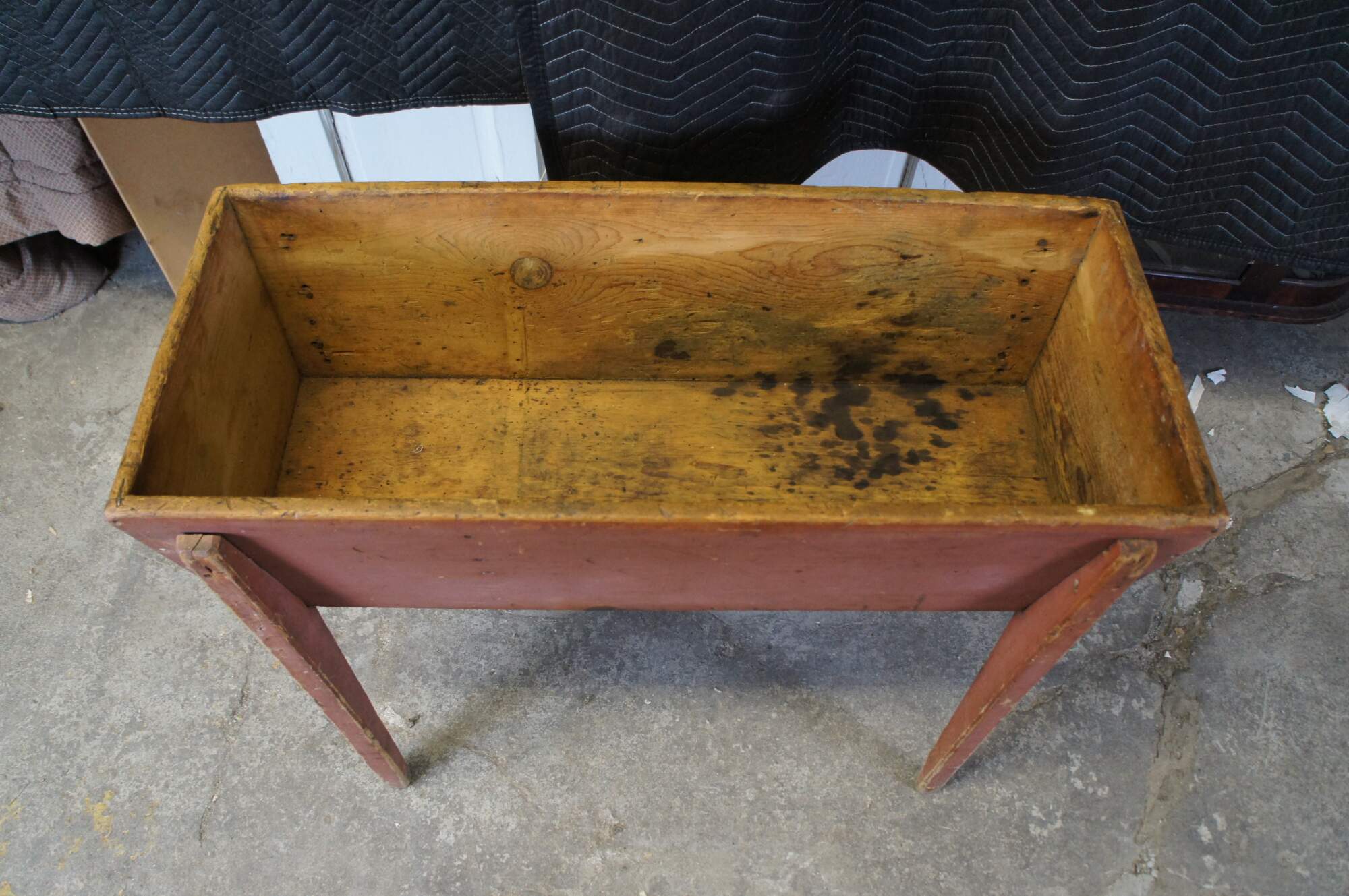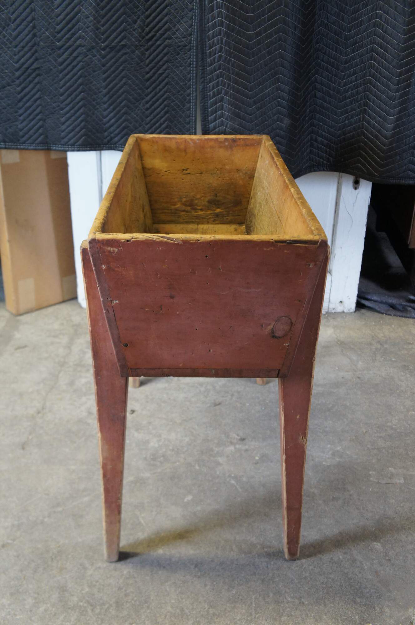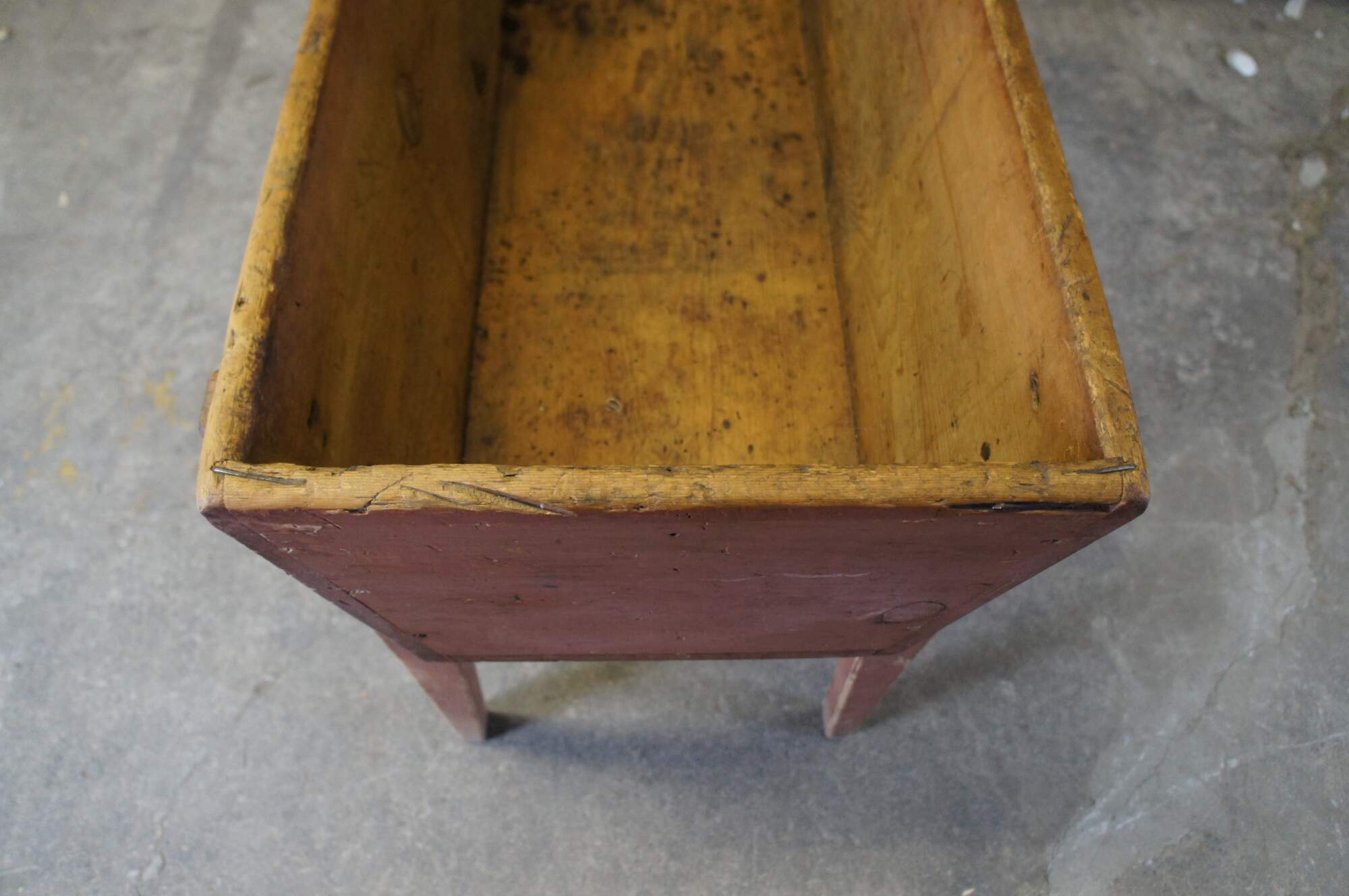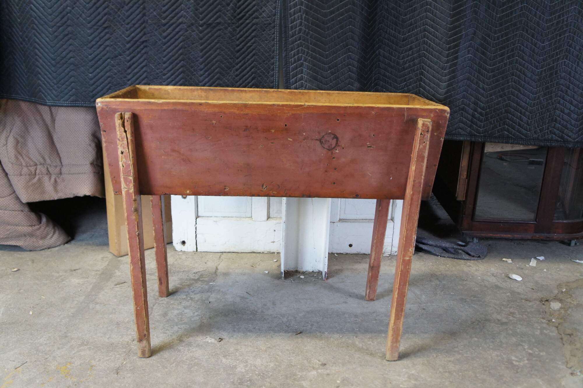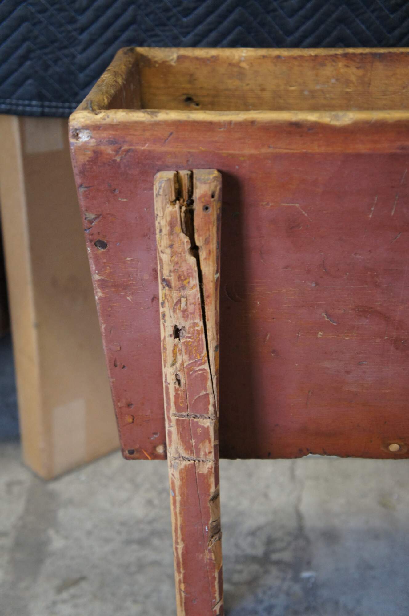 Antique primitive pine country / kitchen / farmhouse dough box / bin / trough stand. It features rectangular form with red painted exterior.