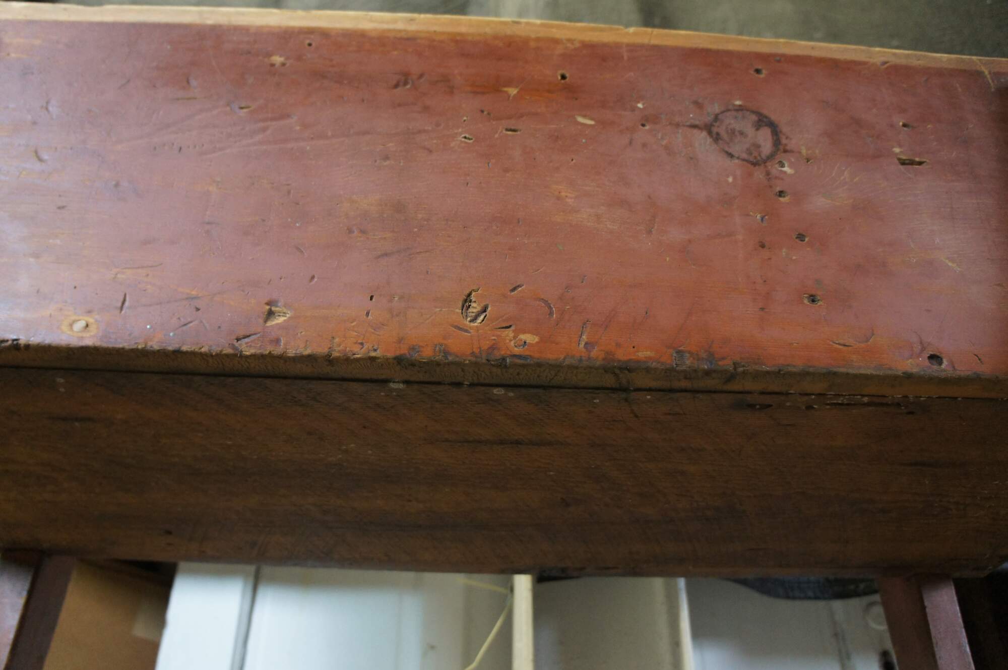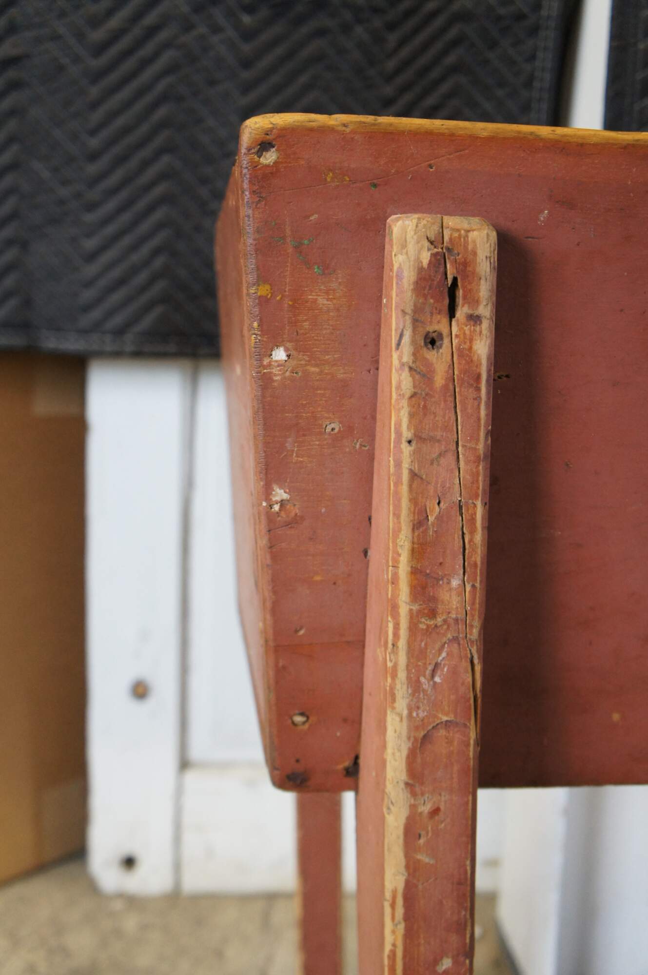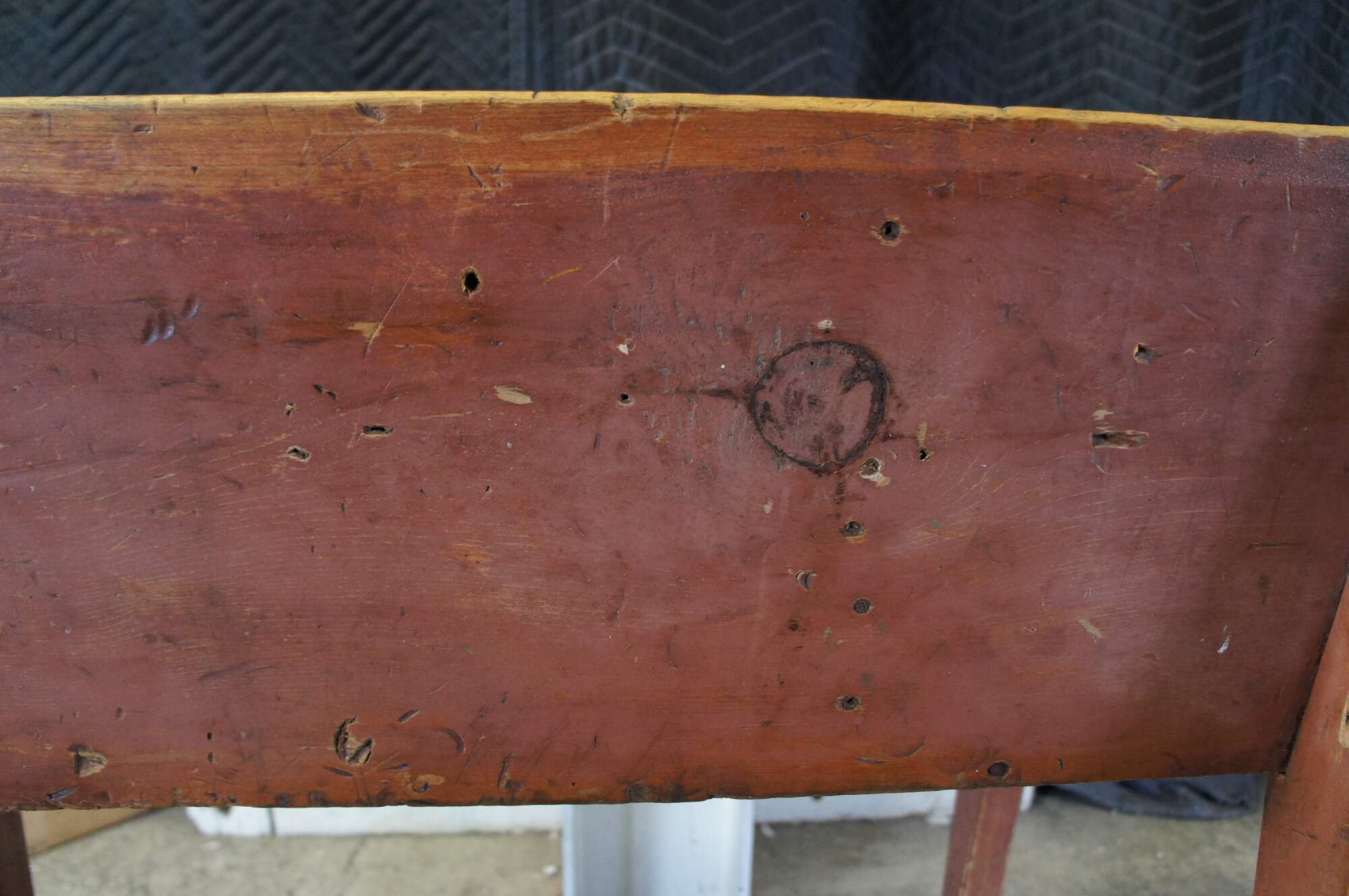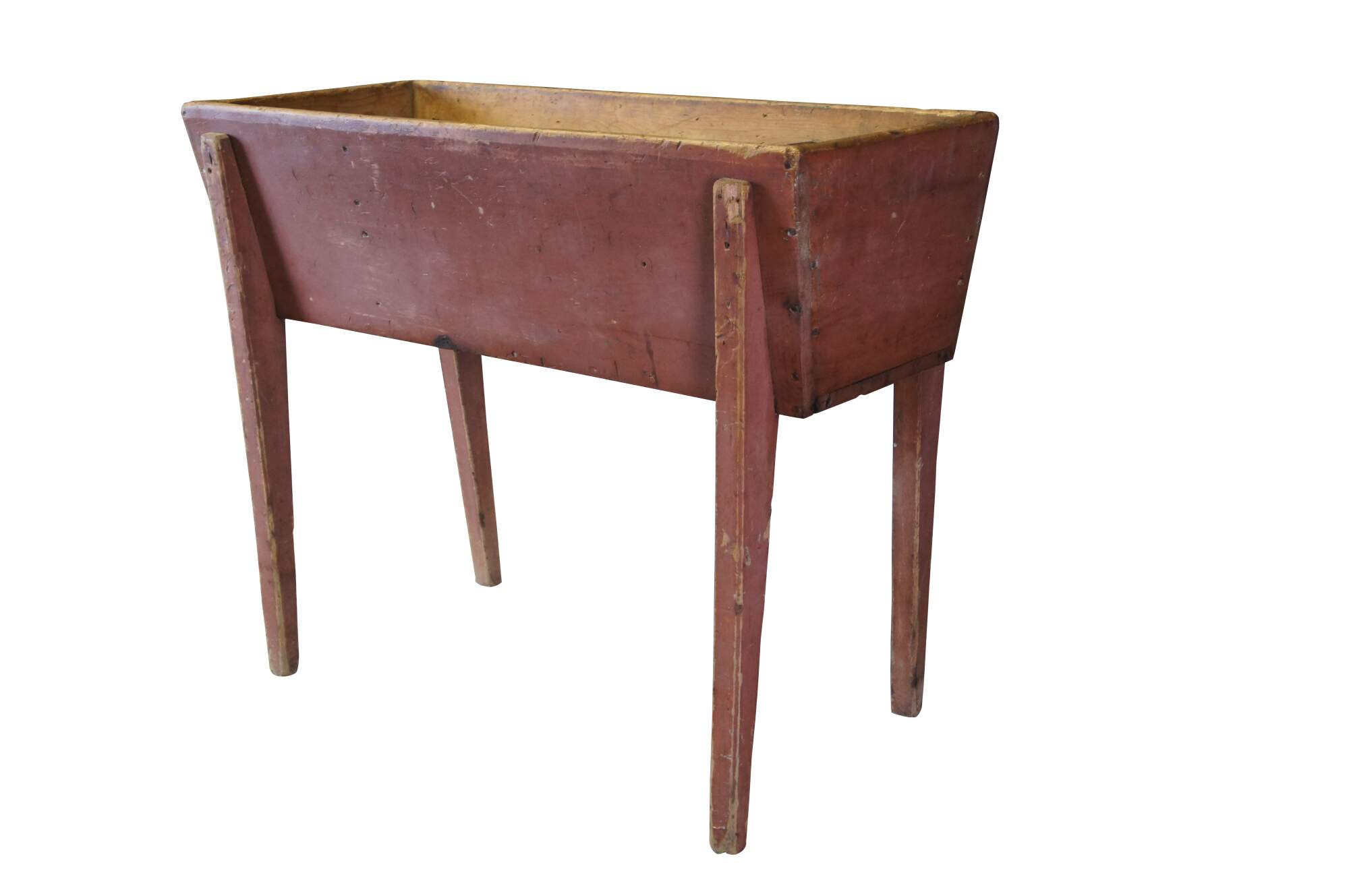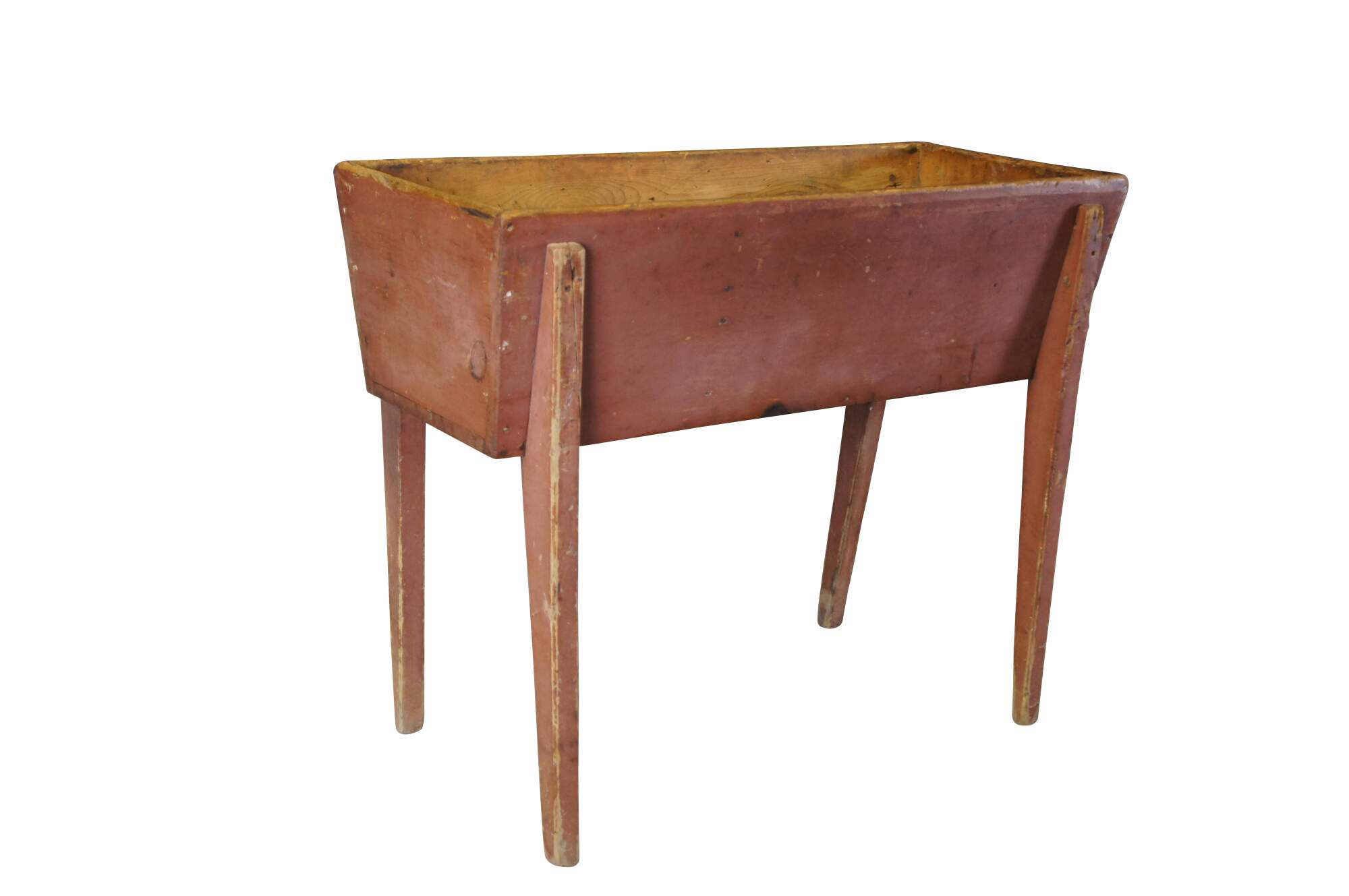 Antique primitive pine country / kitchen / farmhouse dough box / bin / trough stand. It features rectangular form with red painted exterior.