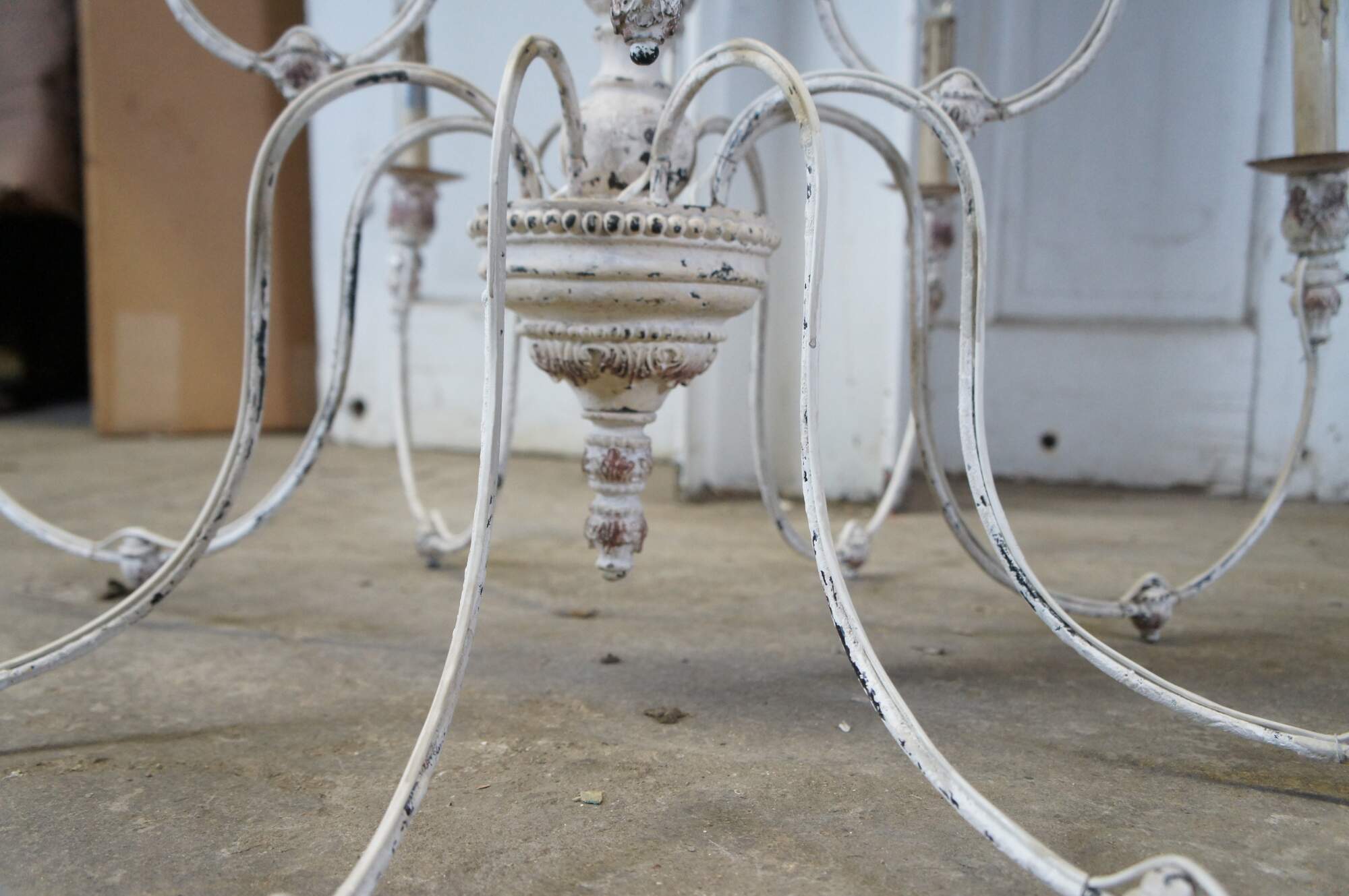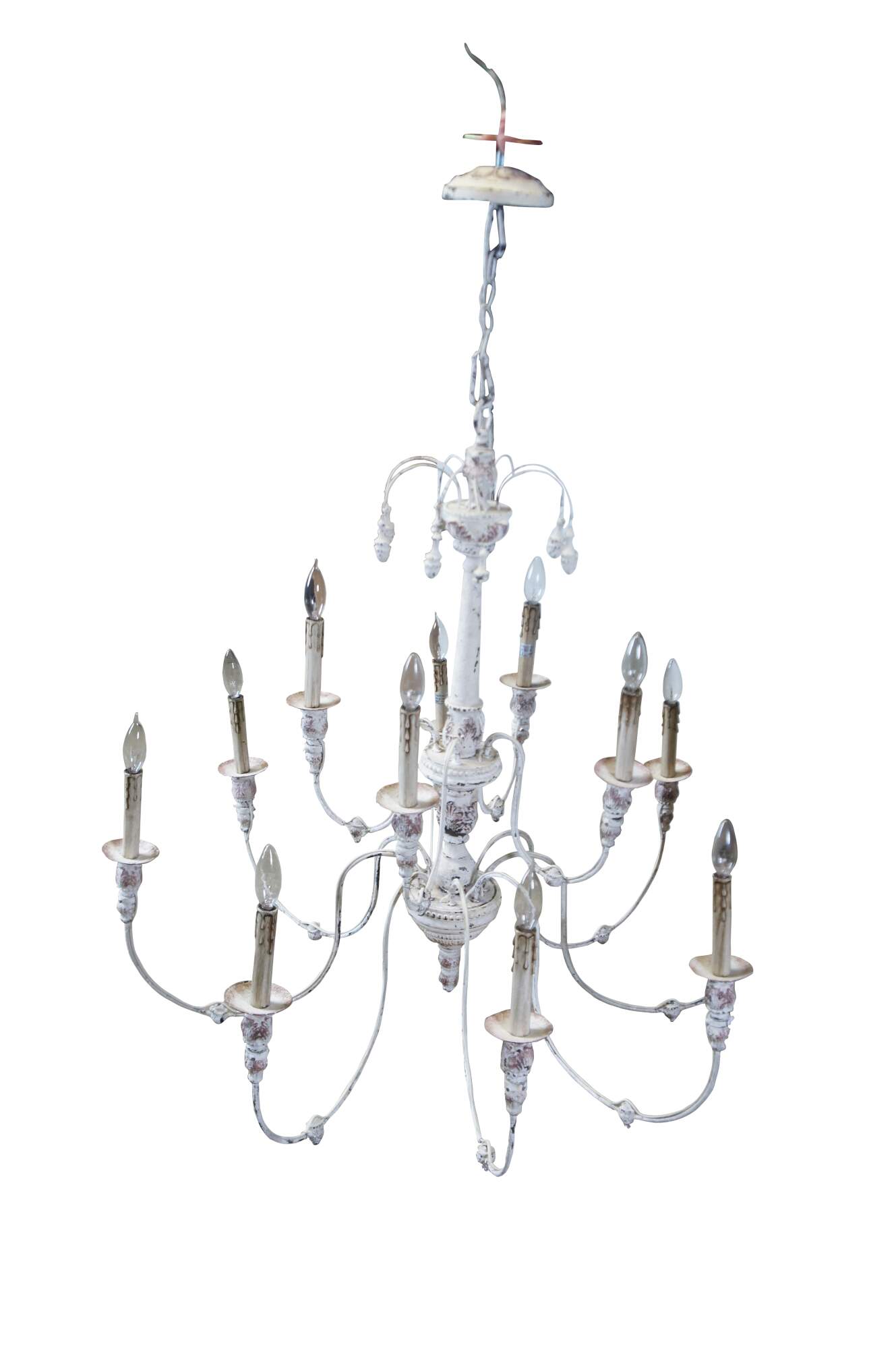 This Horchow Farmhouse two tier twelve arm Chandelier showcases a fine French Country styling and offers an elegant lighting addition to the dining room, living room, or foyer. Crafted with an off white painted acanthus accented central column, this decadent chandelier features curvaceous metal arms that accommodate faux candlestick lights, resolving a chandelier that boasts an appealing, classical look, but with appropriate, modern convenience. Includes acorn drop finials. Circa 2012.