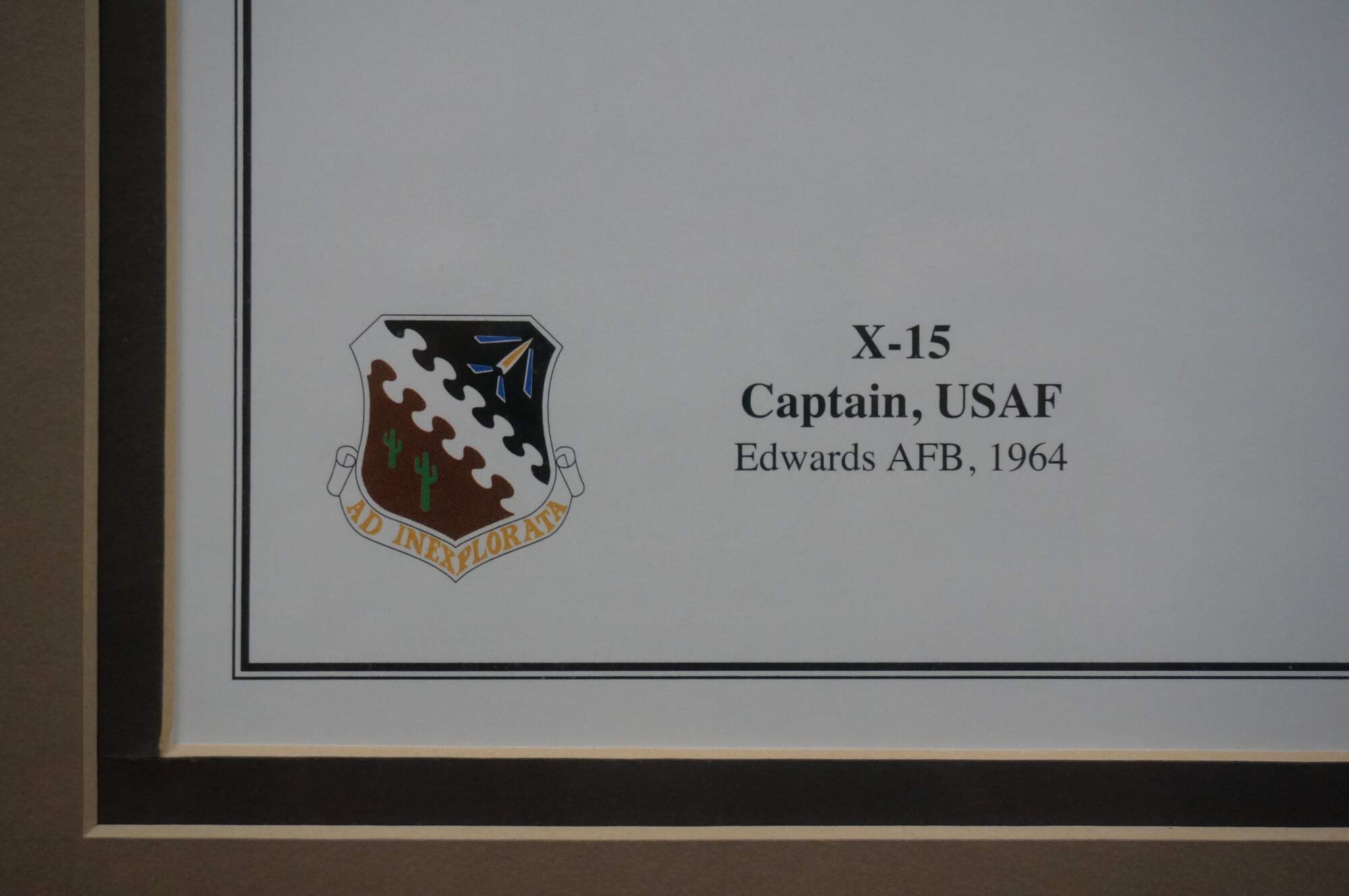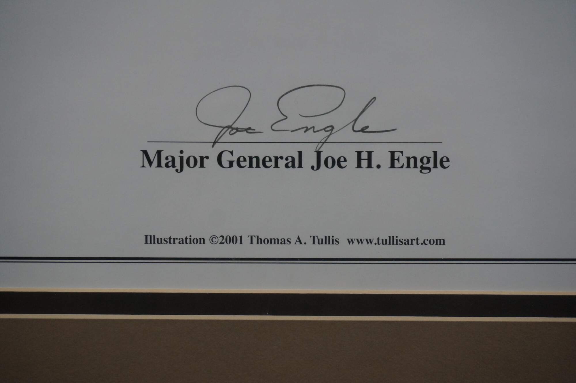 Vintage 2001 National Aviation Hall of Fame Limited Edition print depicting the 1964 X-15 and 1982 NASA Space Shuttle piloted by Major General Joe H. Engle of the United States Air Force, featuring his signature. Numbered 138/500. Art by Thomas A. Tullis. Beveled black wood frame; beige and gray layered mat. Mismatched COA on reverse.