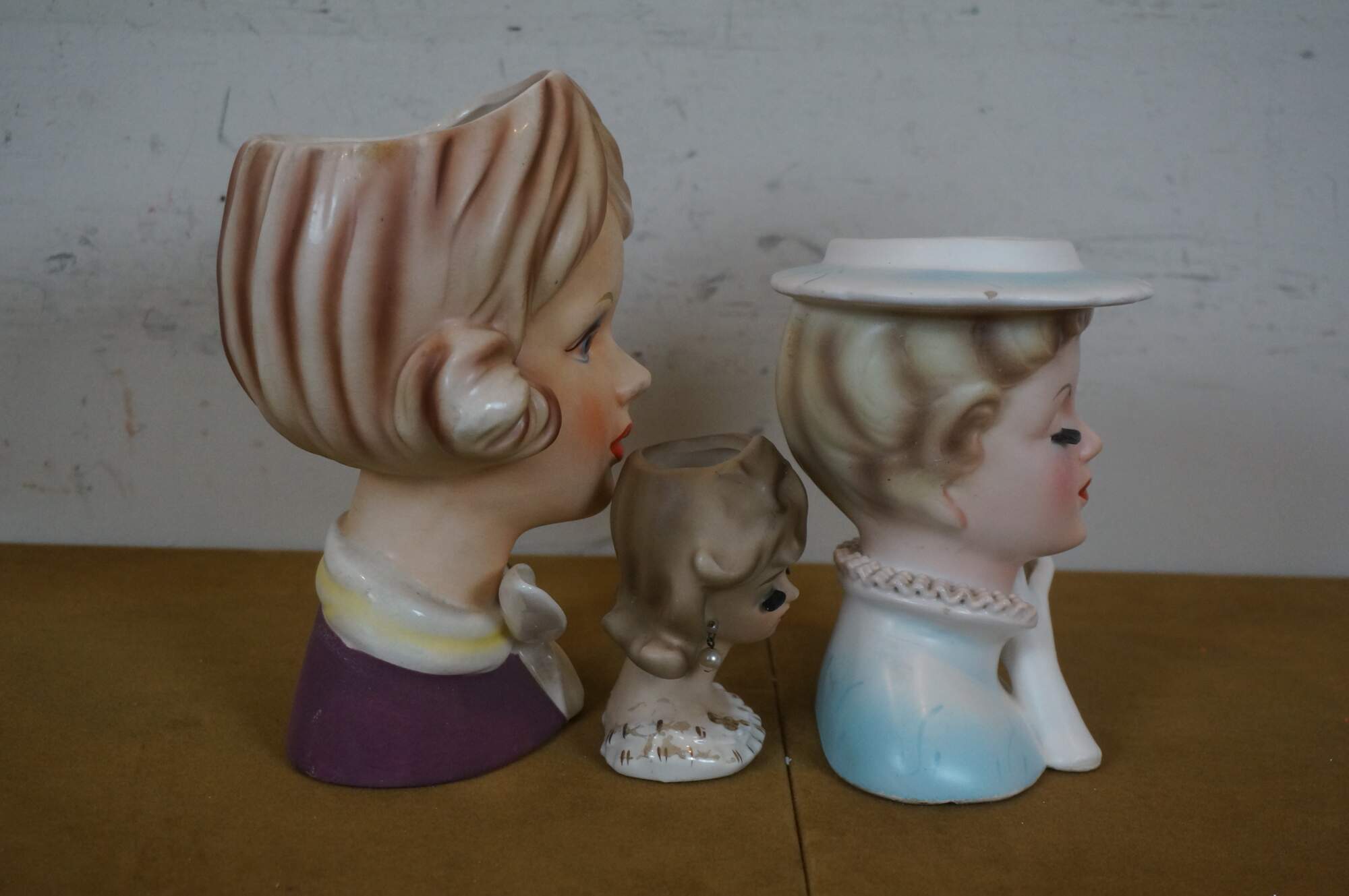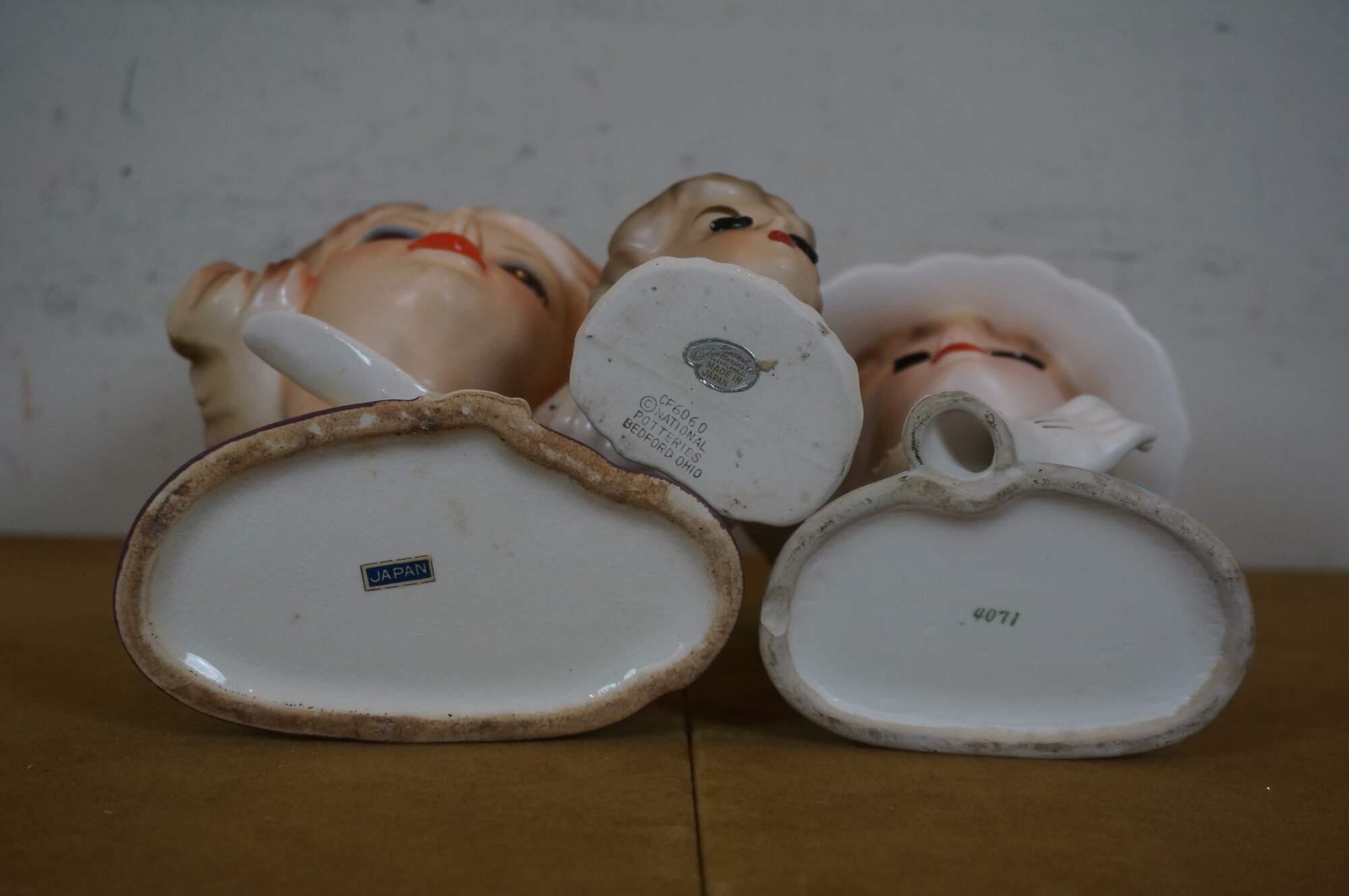 Set of three 1950s-1960s porcelain head vases attributed to Napco / National Potteries Company of Cleveland, Ohio, depicting three different stylish ladies, one with closed eyes and pearl earrings, one with closed eyes, raised glove and hat, and one with 60s eyeliner and ascot. Smallest explicitly marked with the Napco name and sticker. One marked 4071 and one with Japan sticker.