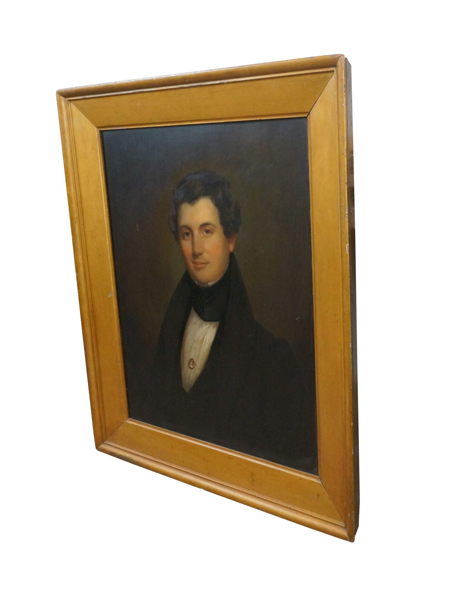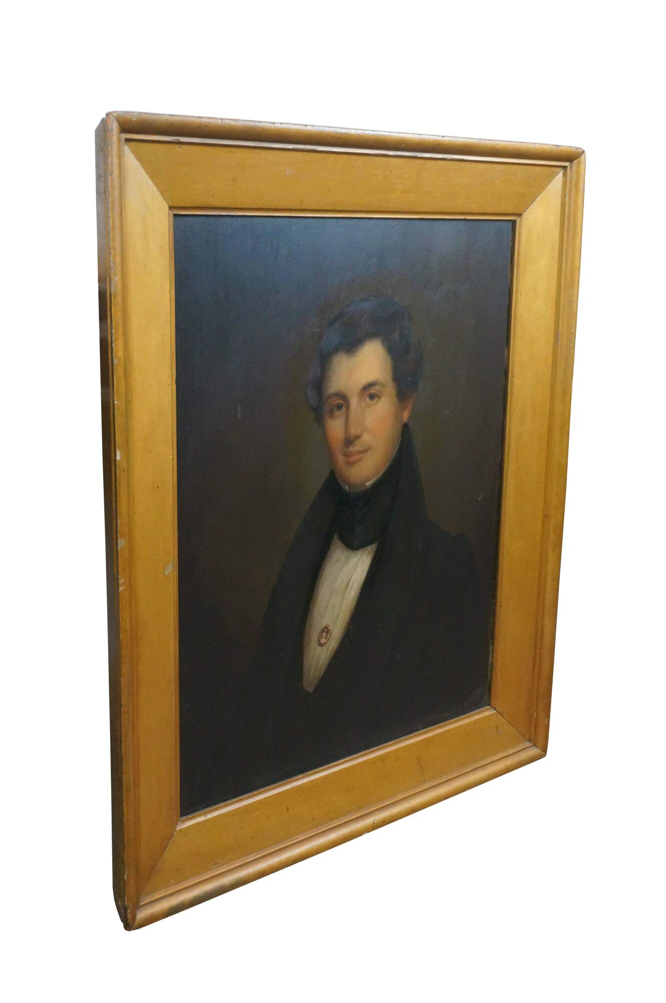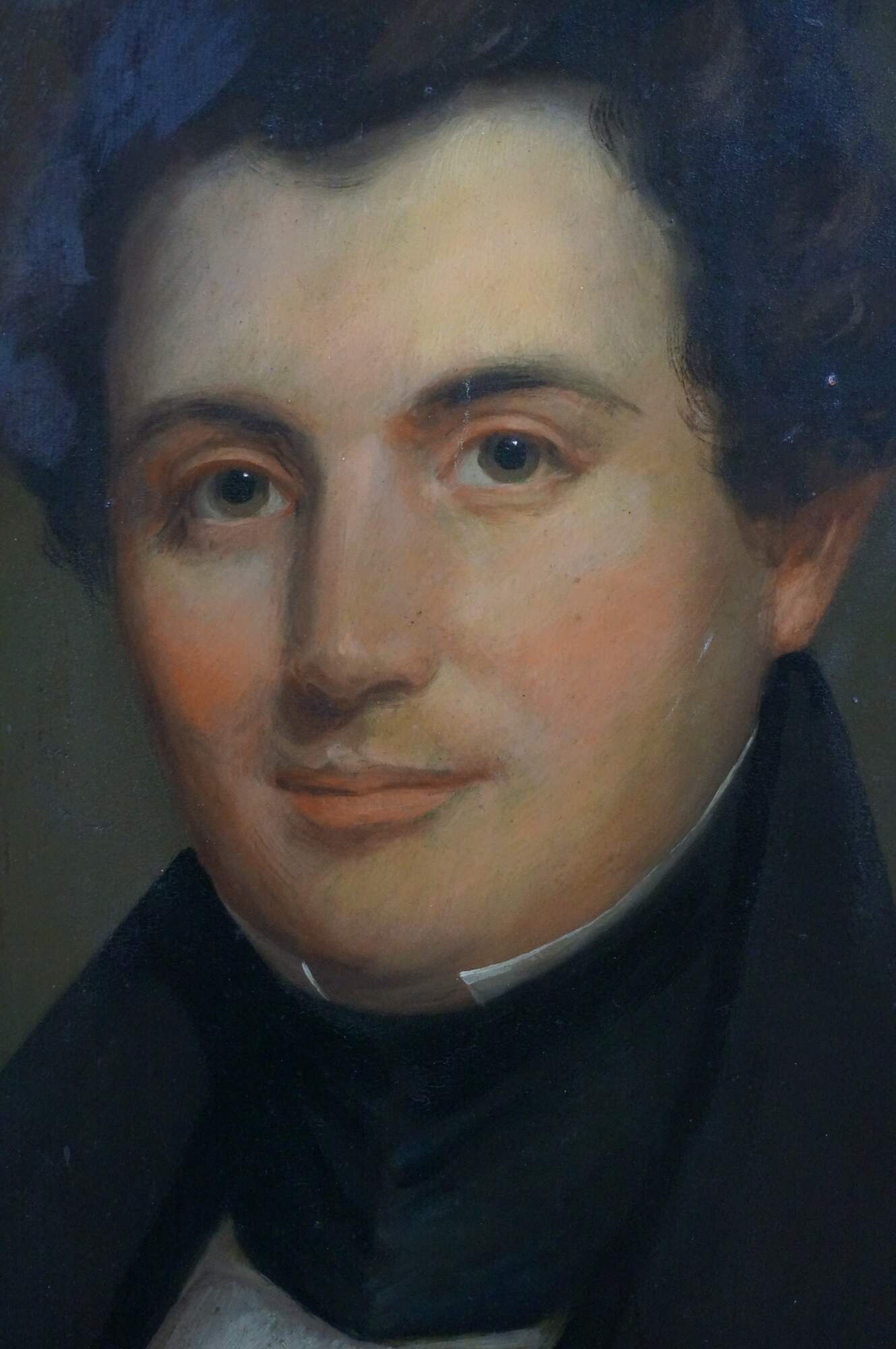 Antique 19th century c.1834 American School portrait oil painting on board by Abel B Moore, depicting a gentleman with a high collar, wearing a small painted cameo of a woman on his shirt front. Reverse of panel marked "A.B. Moore. Ptx 1834." Beveled gold-painted wood frame.