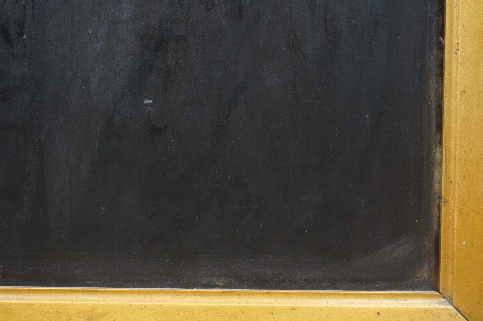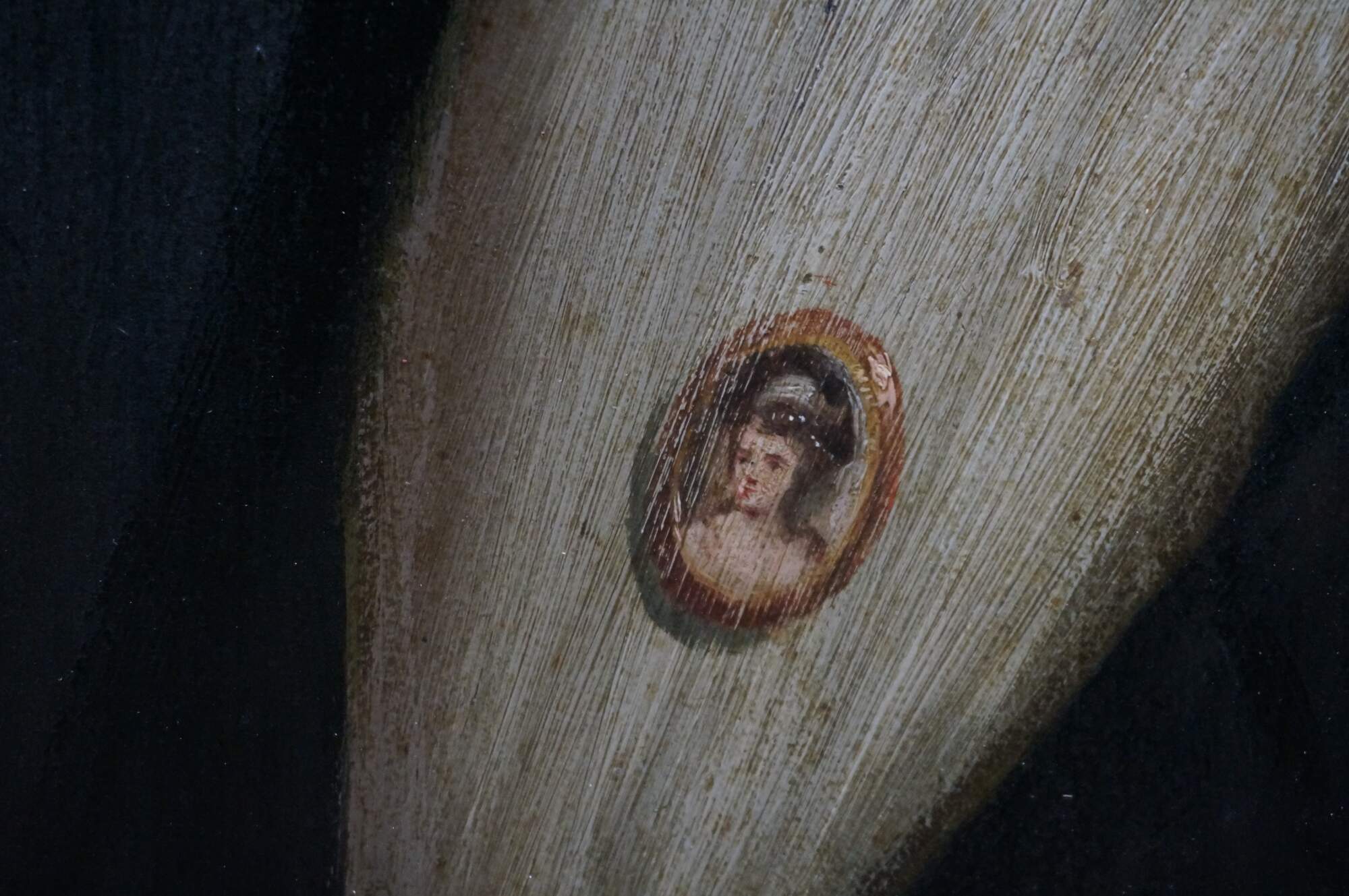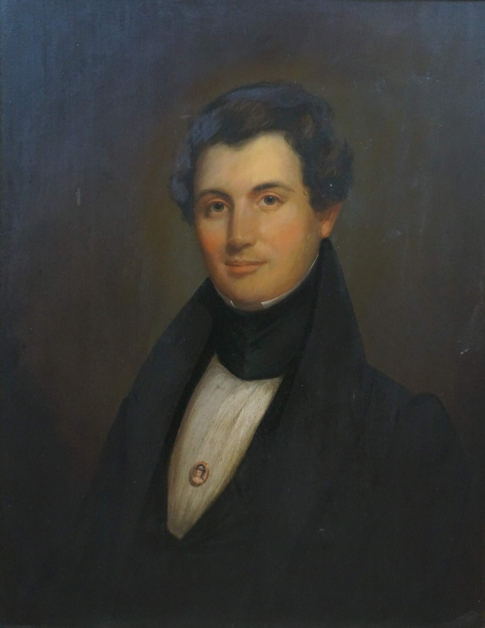Antique 19th century c.1834 American School portrait oil painting on board by Abel B Moore, depicting a gentleman with a high collar, wearing a small painted cameo of a woman on his shirt front. Reverse of panel marked "A.B. Moore. Ptx 1834." Beveled gold-painted wood frame.