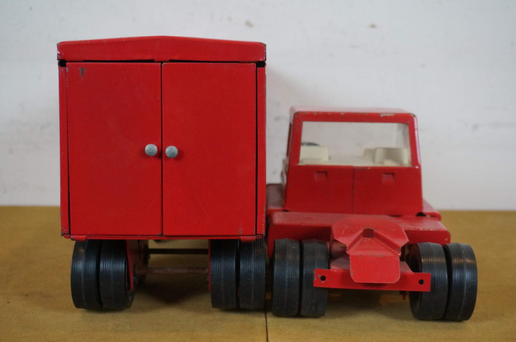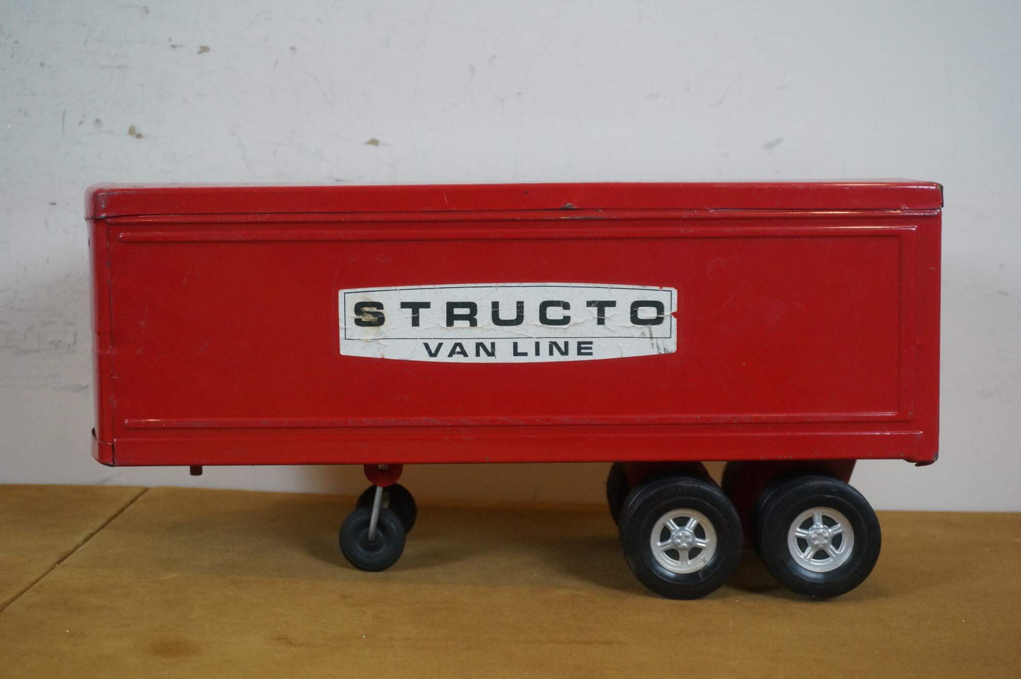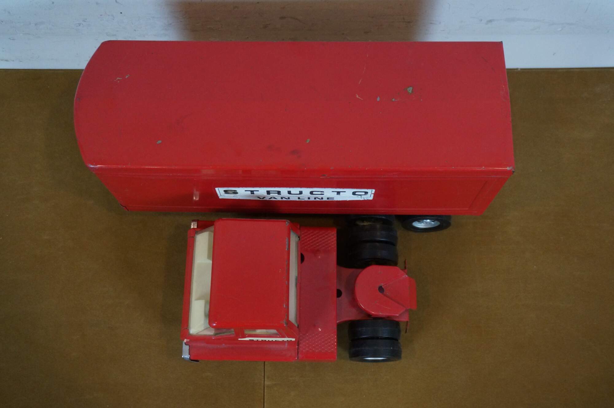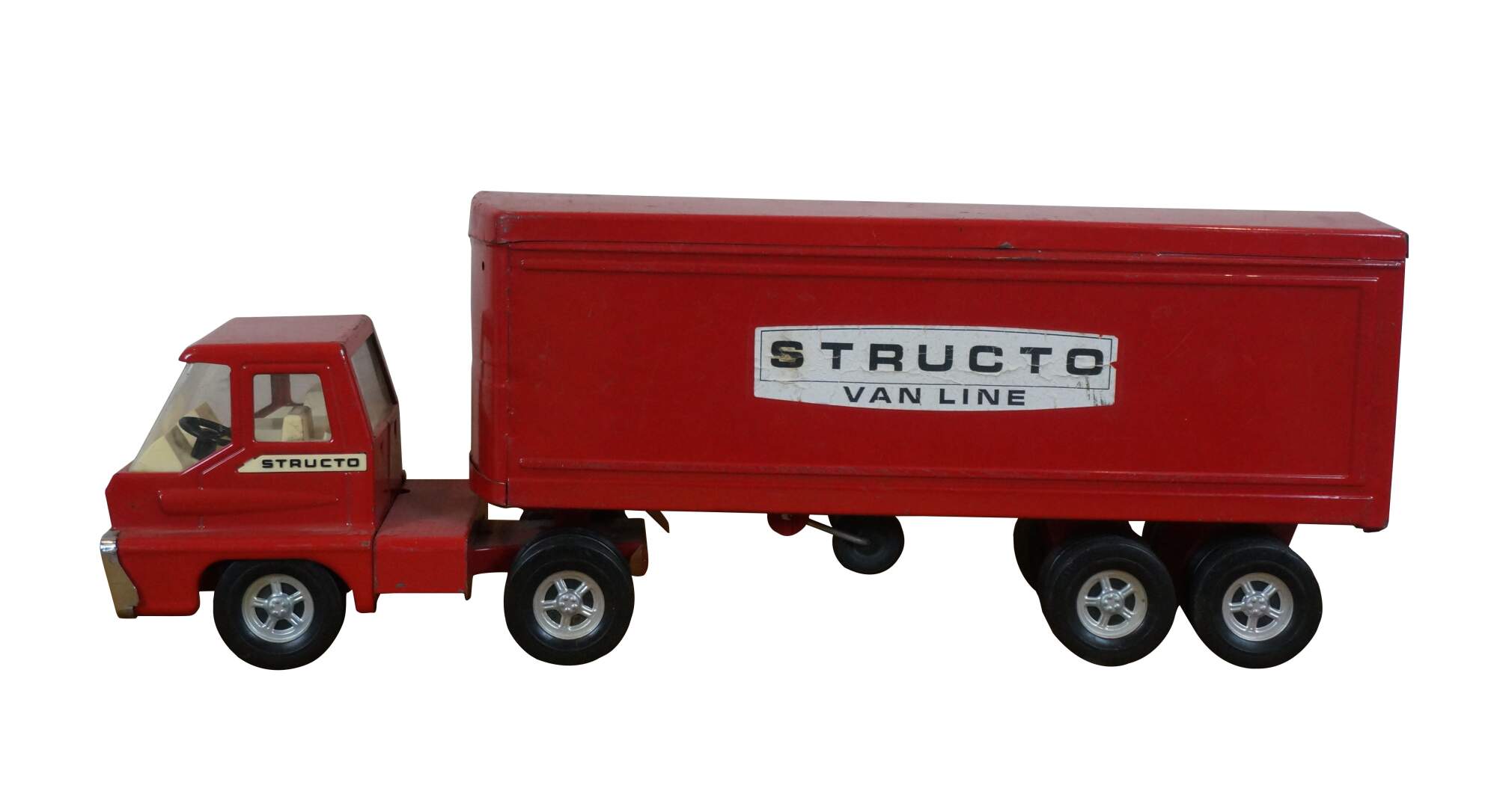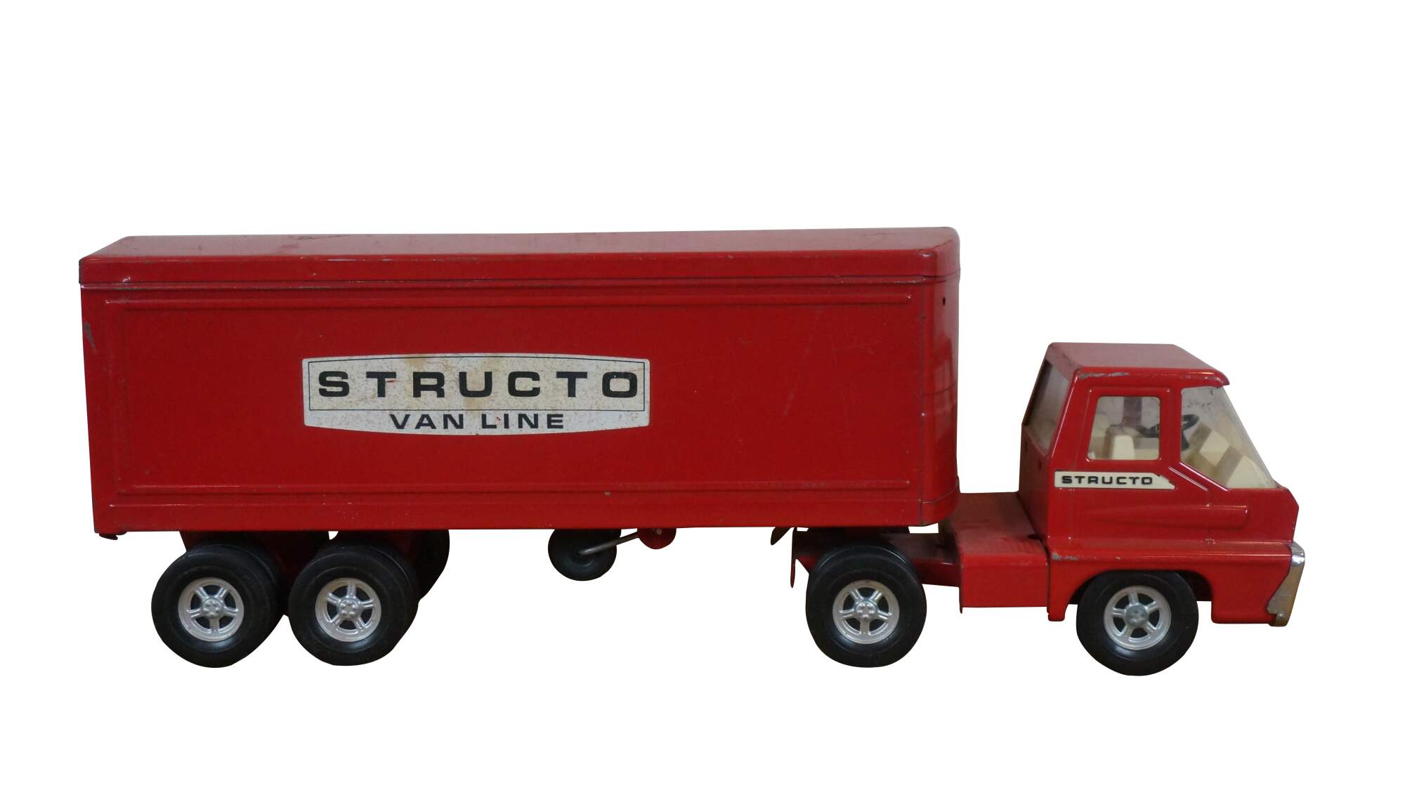Mid century 1966 Structo red pressed steel Van Line semi truck with Turbine cab and solid rubber tires.