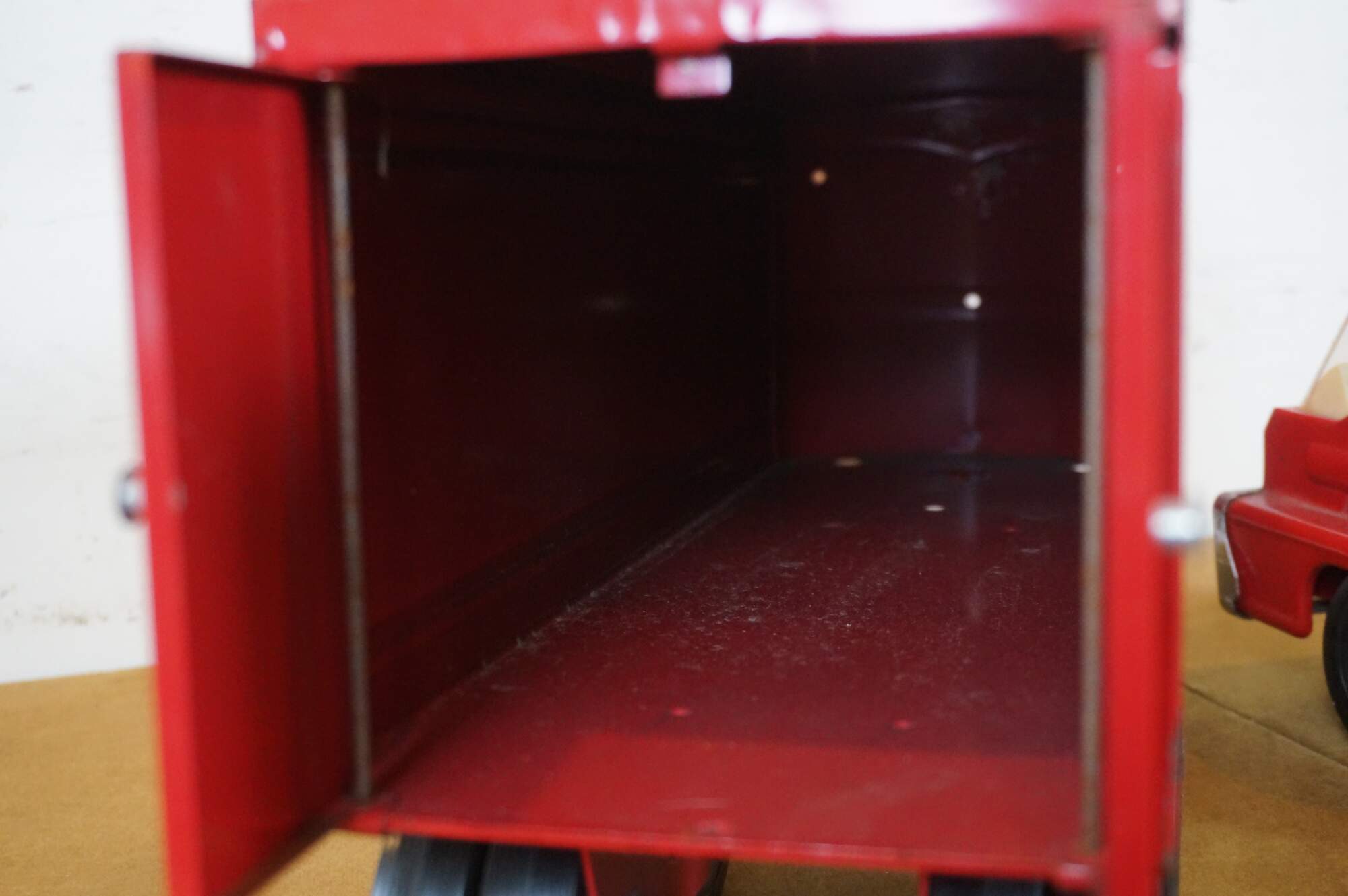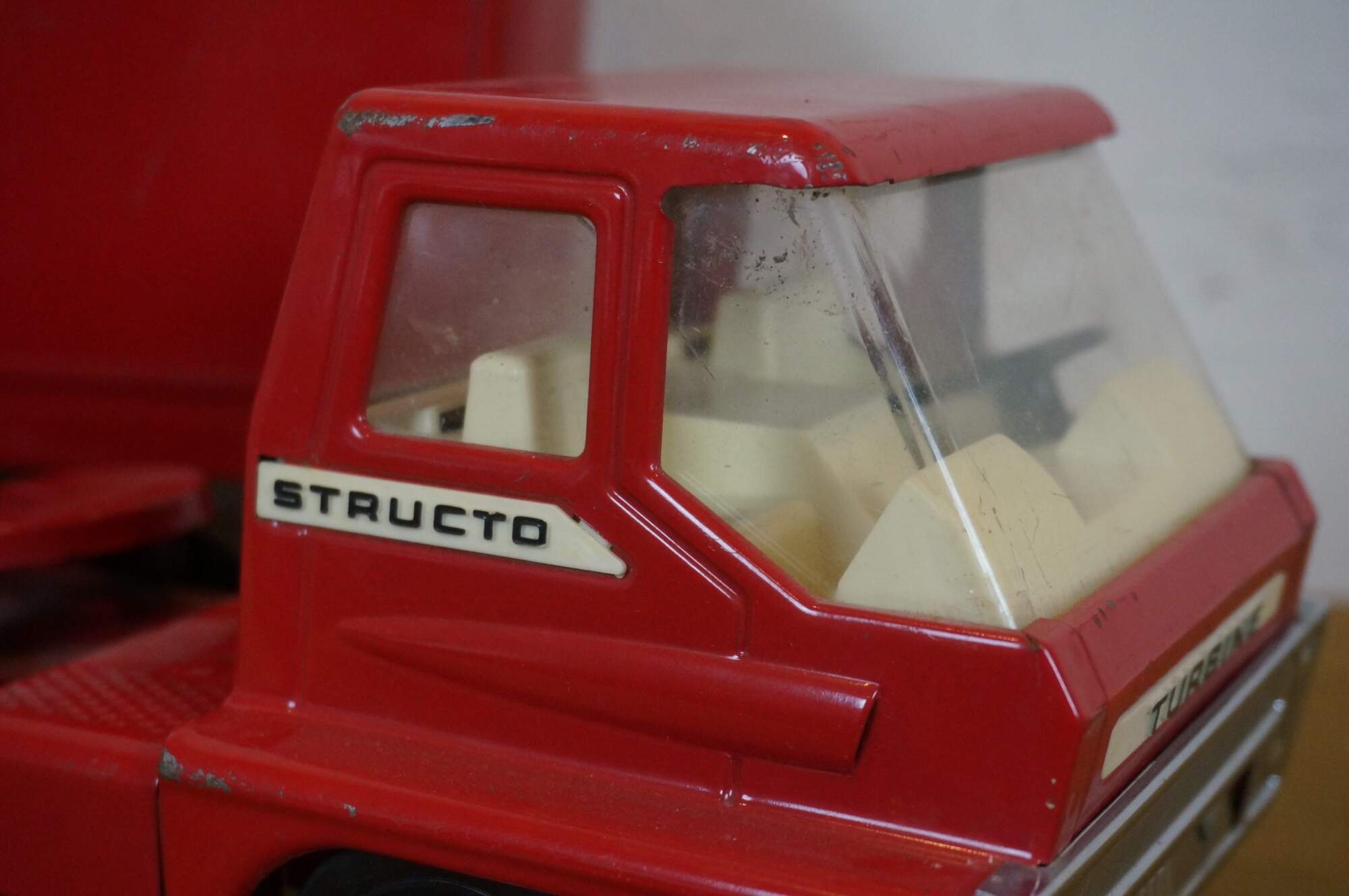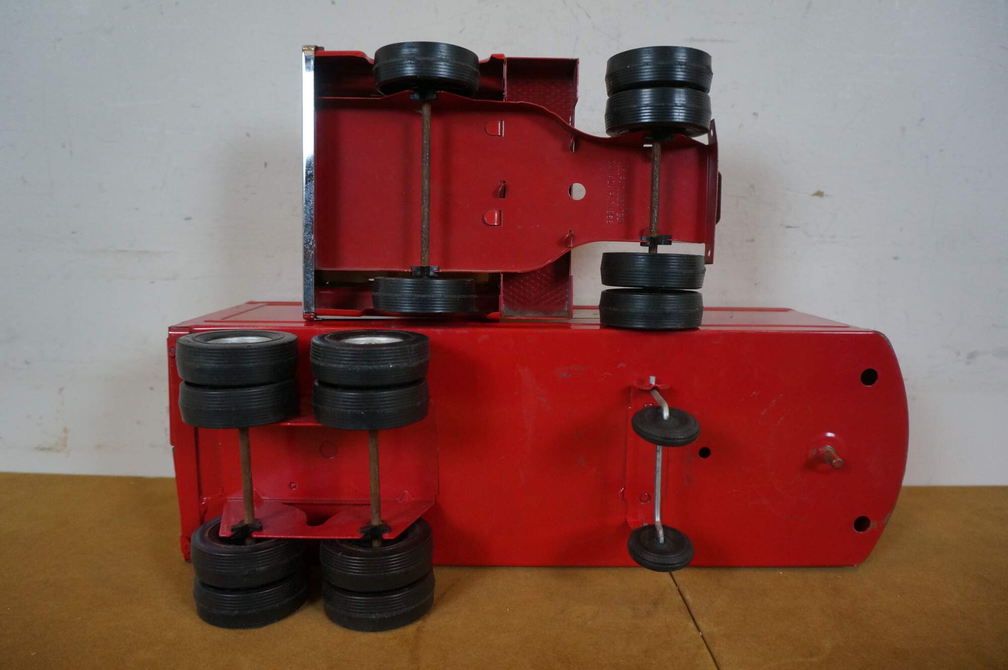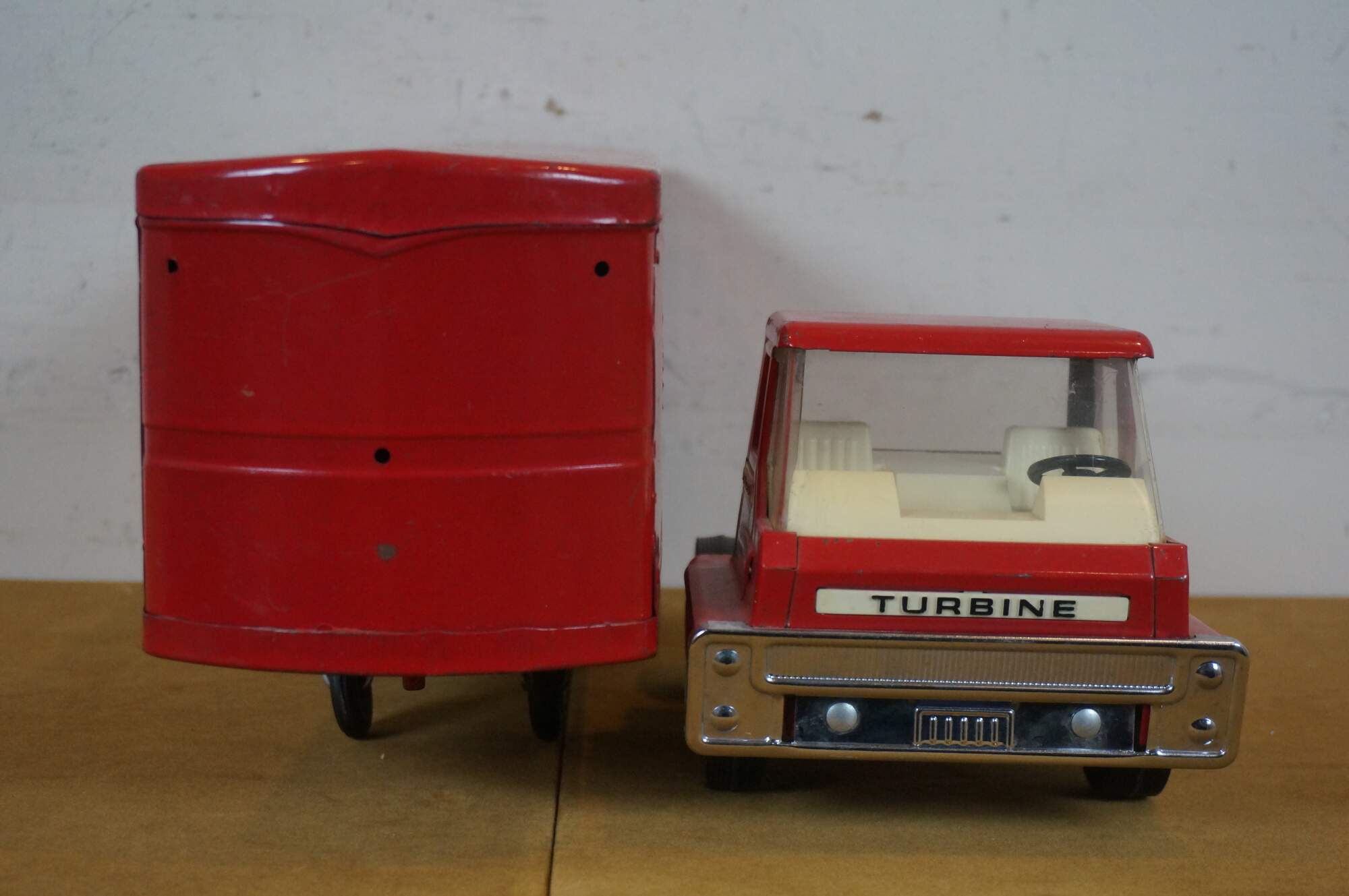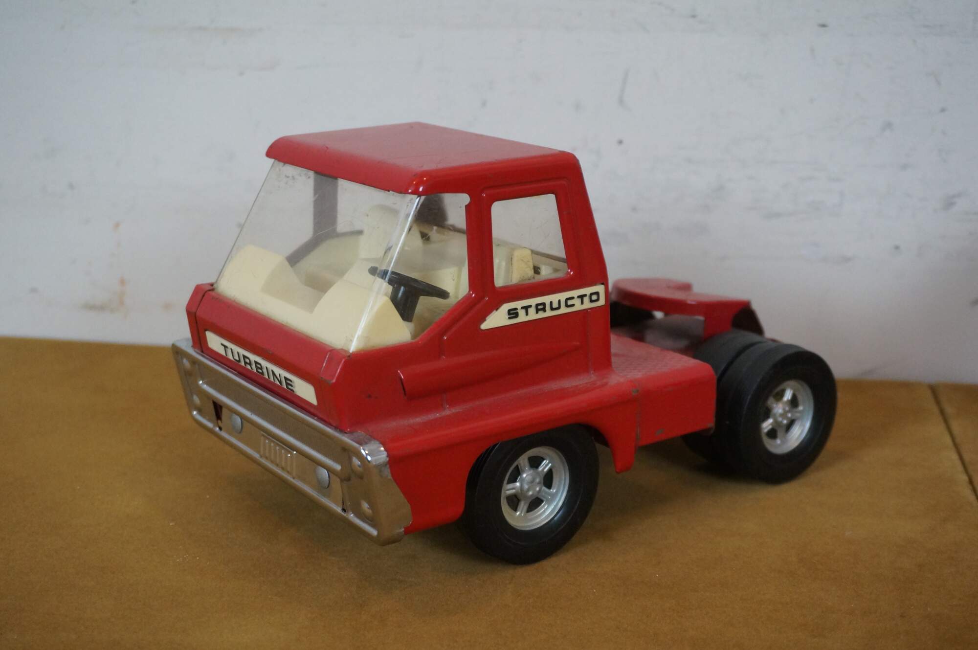 Mid century 1966 Structo red pressed steel Van Line semi truck with Turbine cab and solid rubber tires.