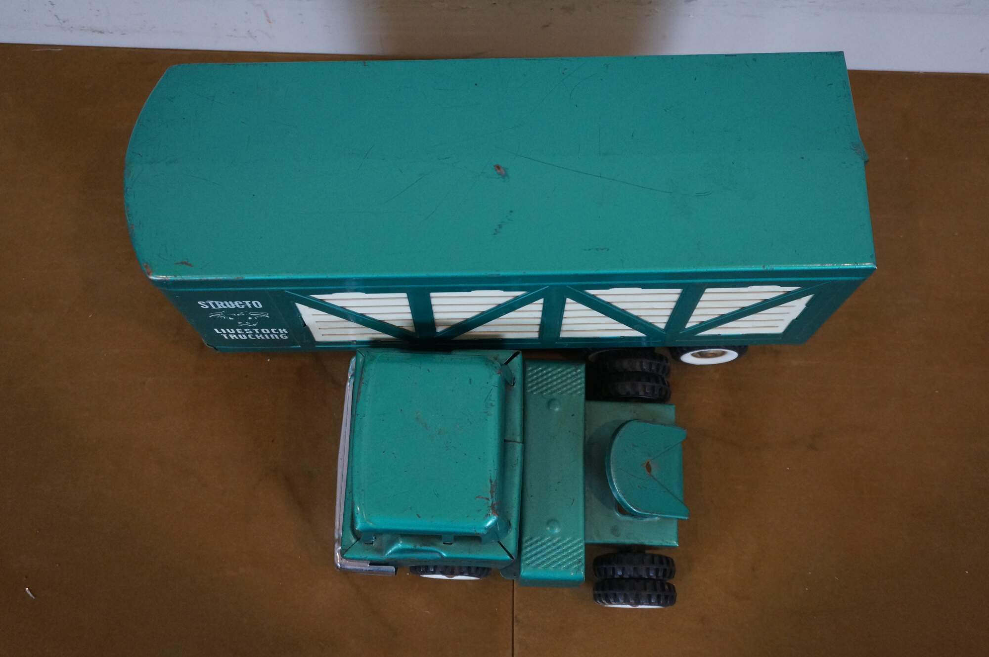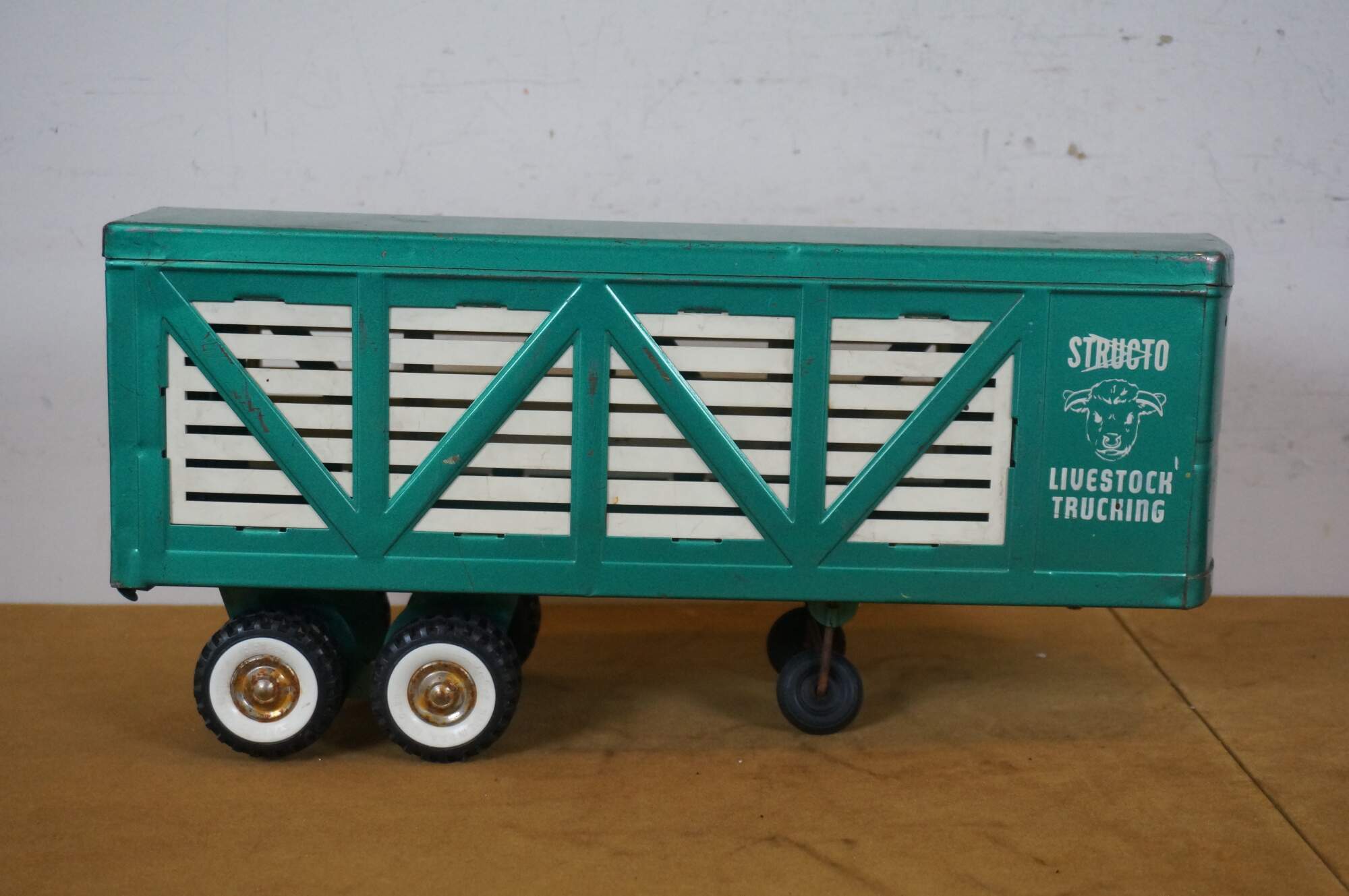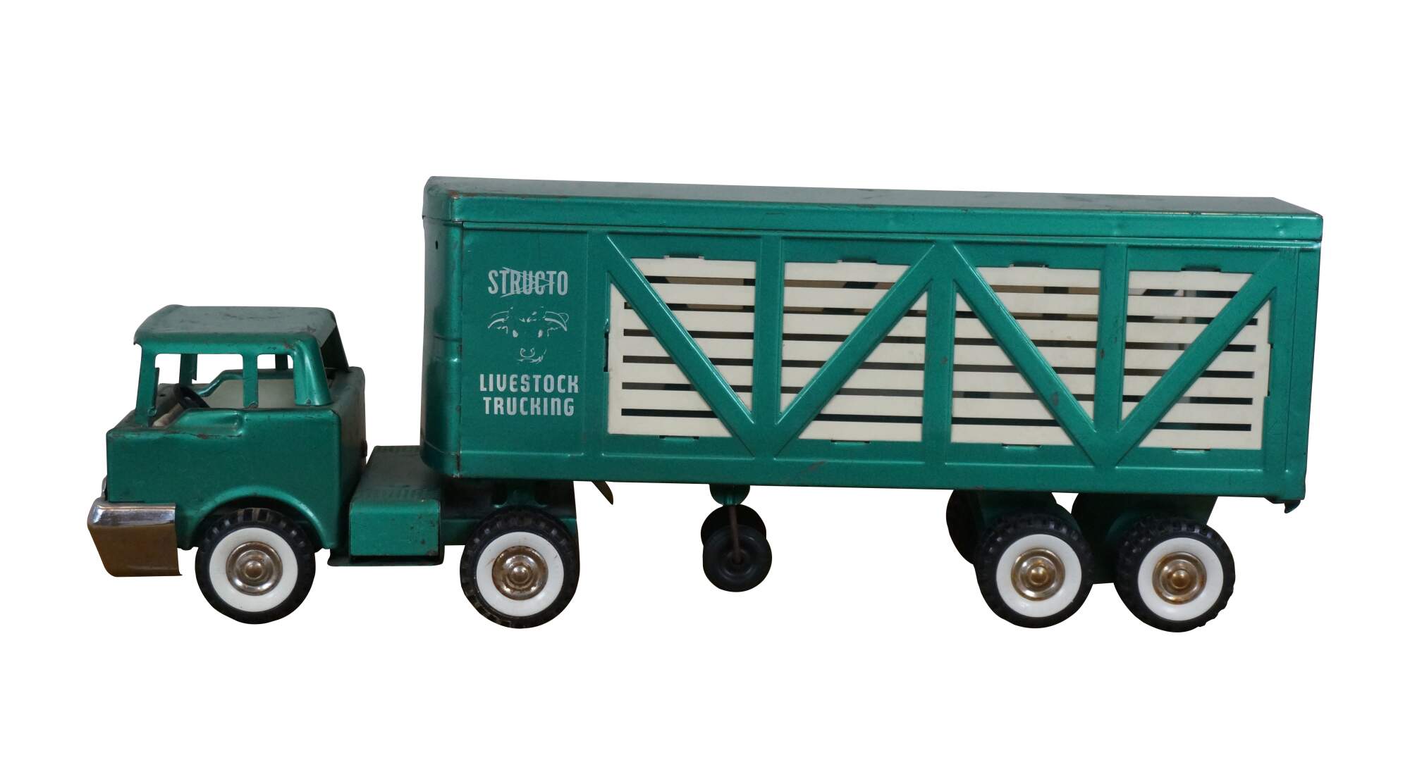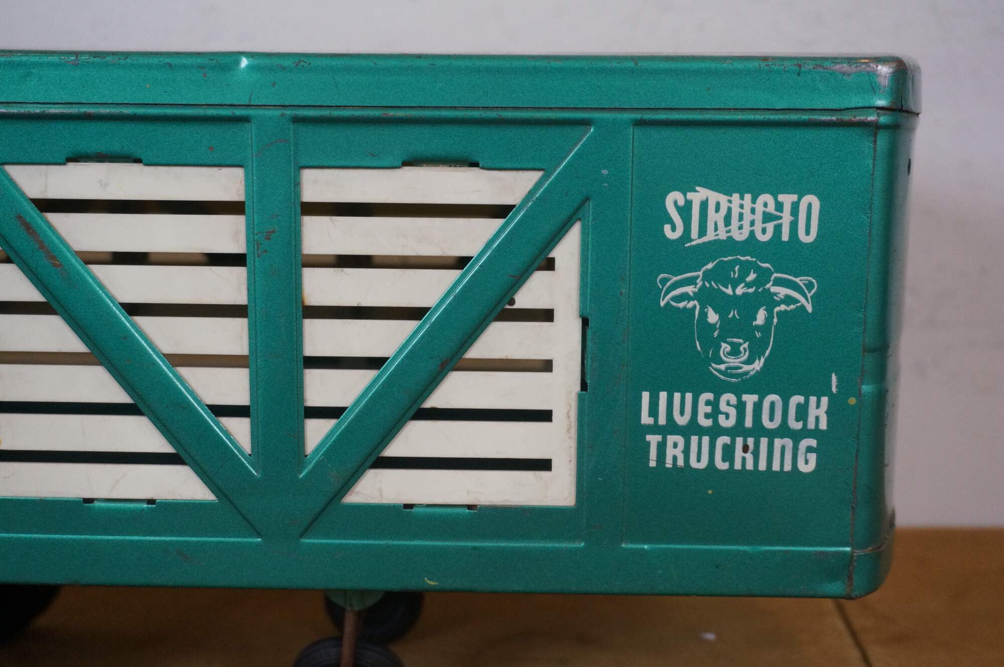 Vintage 1960's Structo teal / green and white pressed steel Livestock Trucking semi truck / cattle trailer with solid rubber tires. Made in USA.