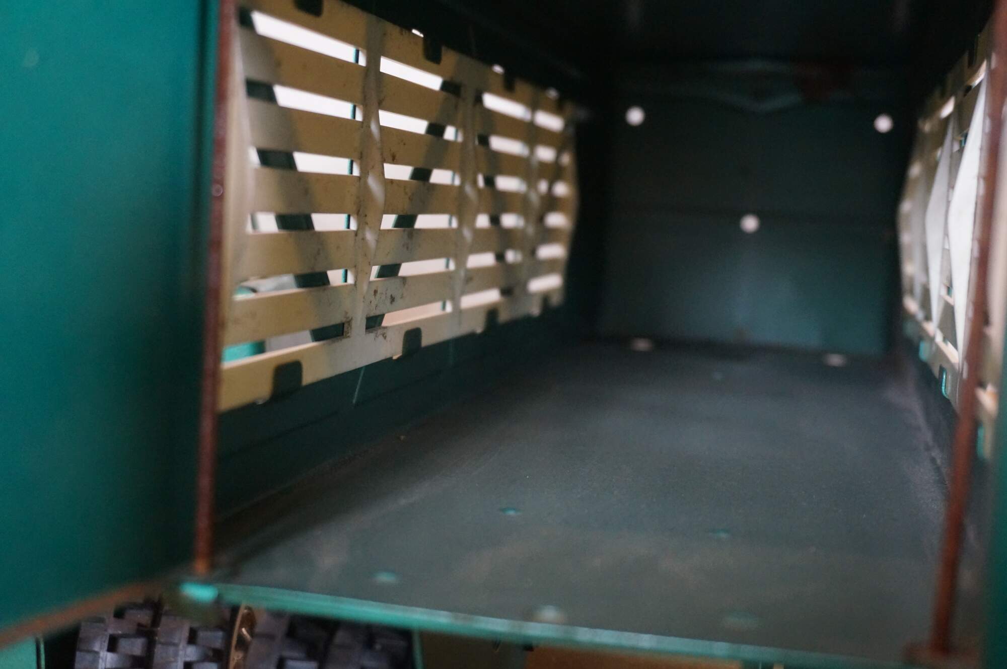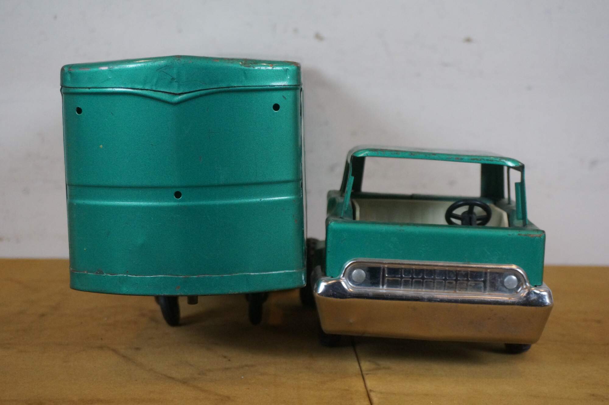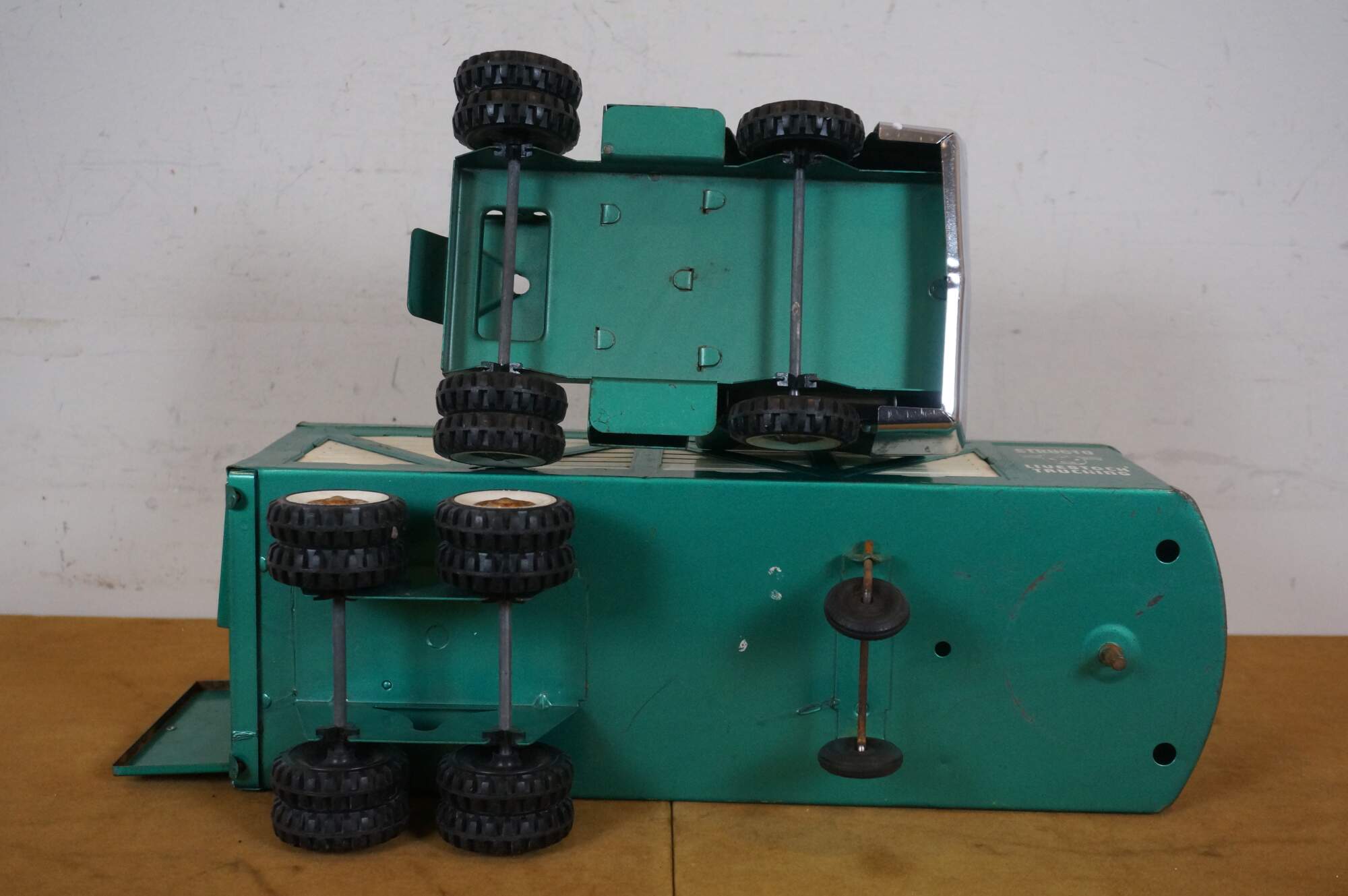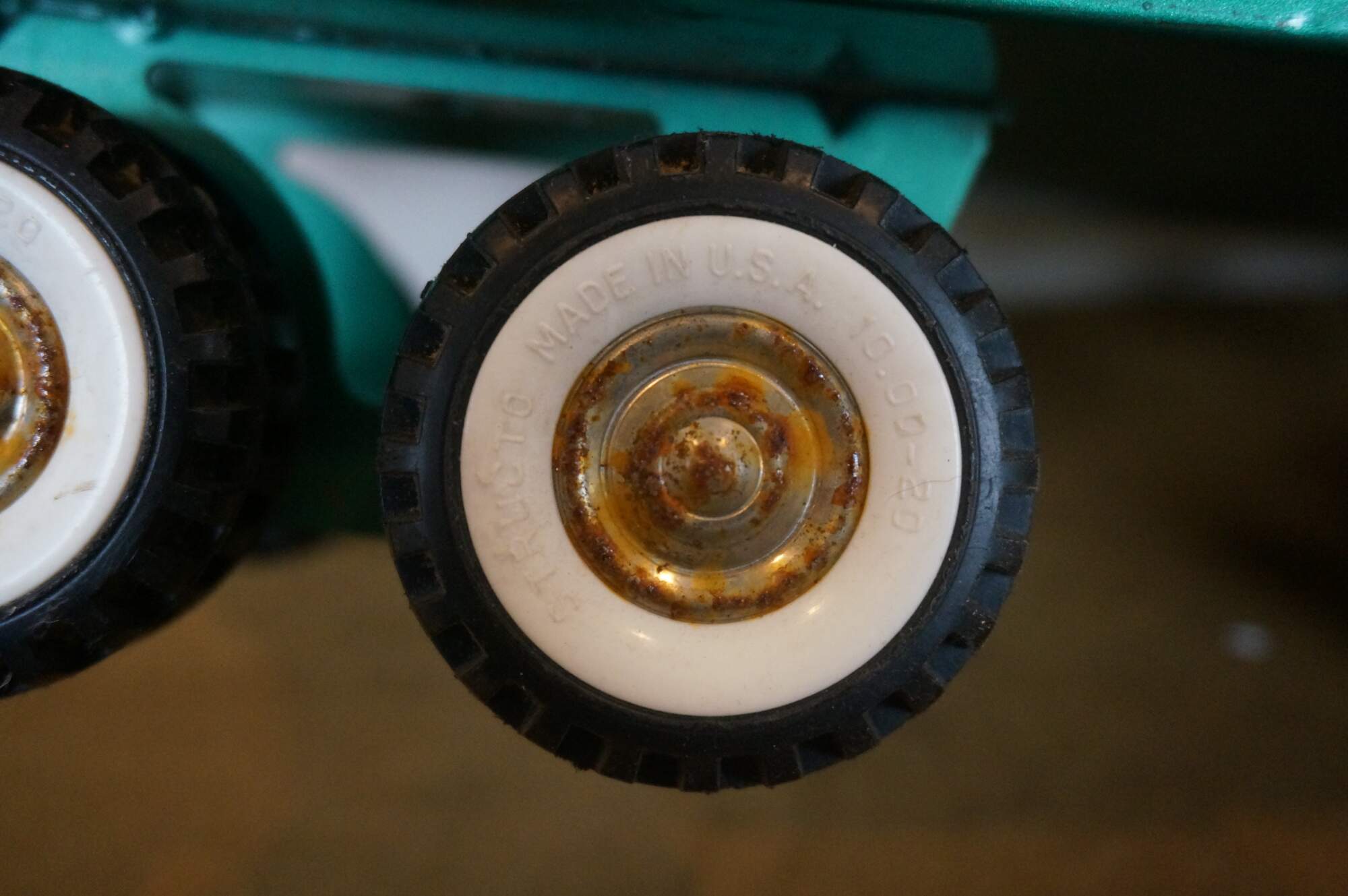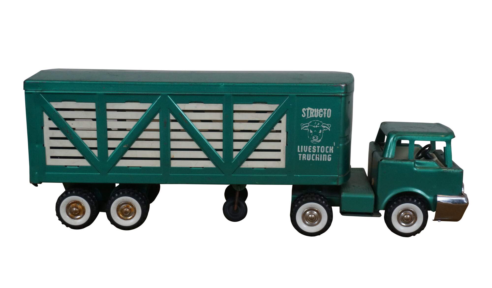 Vintage 1960's Structo teal / green and white pressed steel Livestock Trucking semi truck / cattle trailer with solid rubber tires. Made in USA.