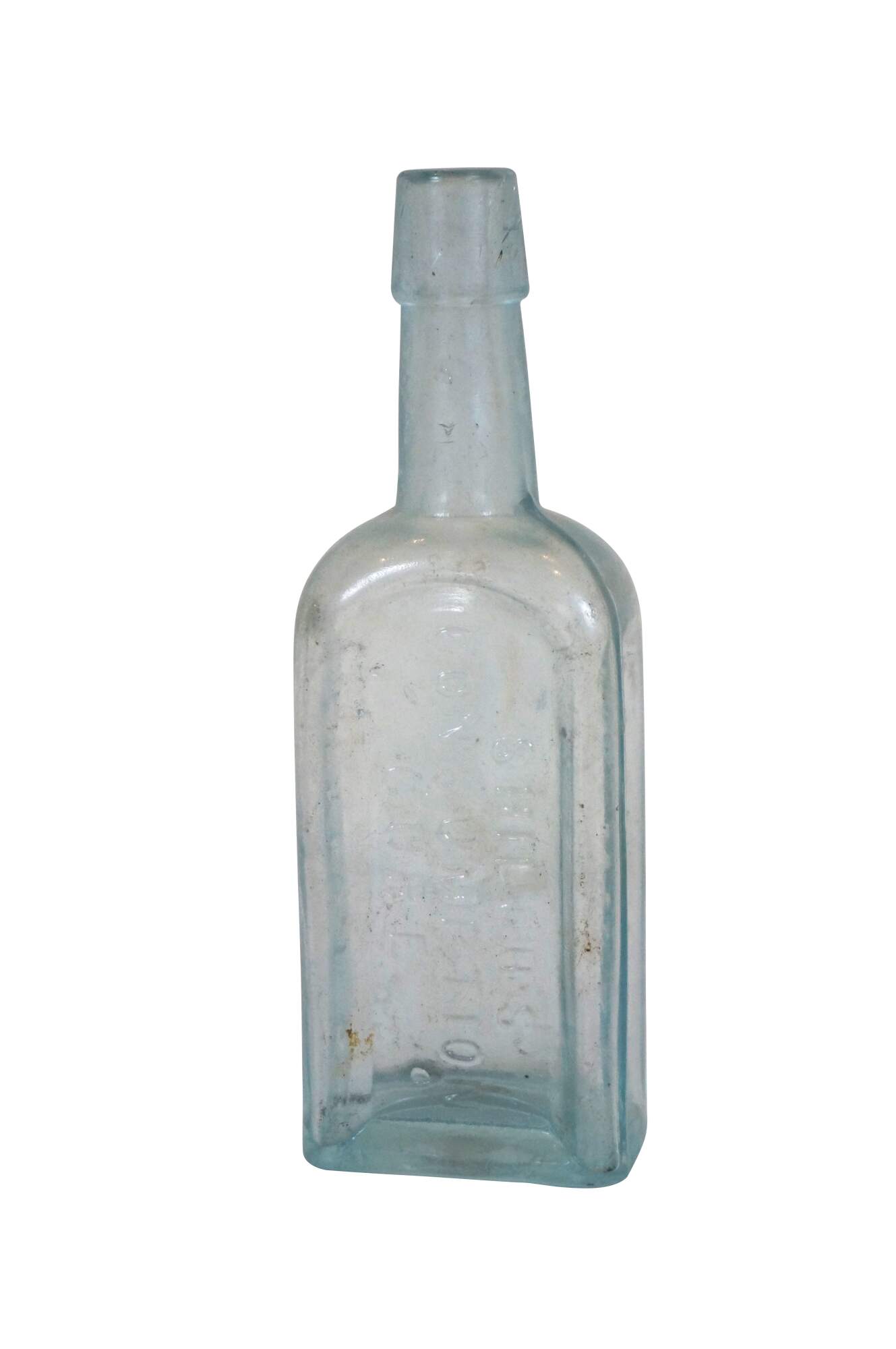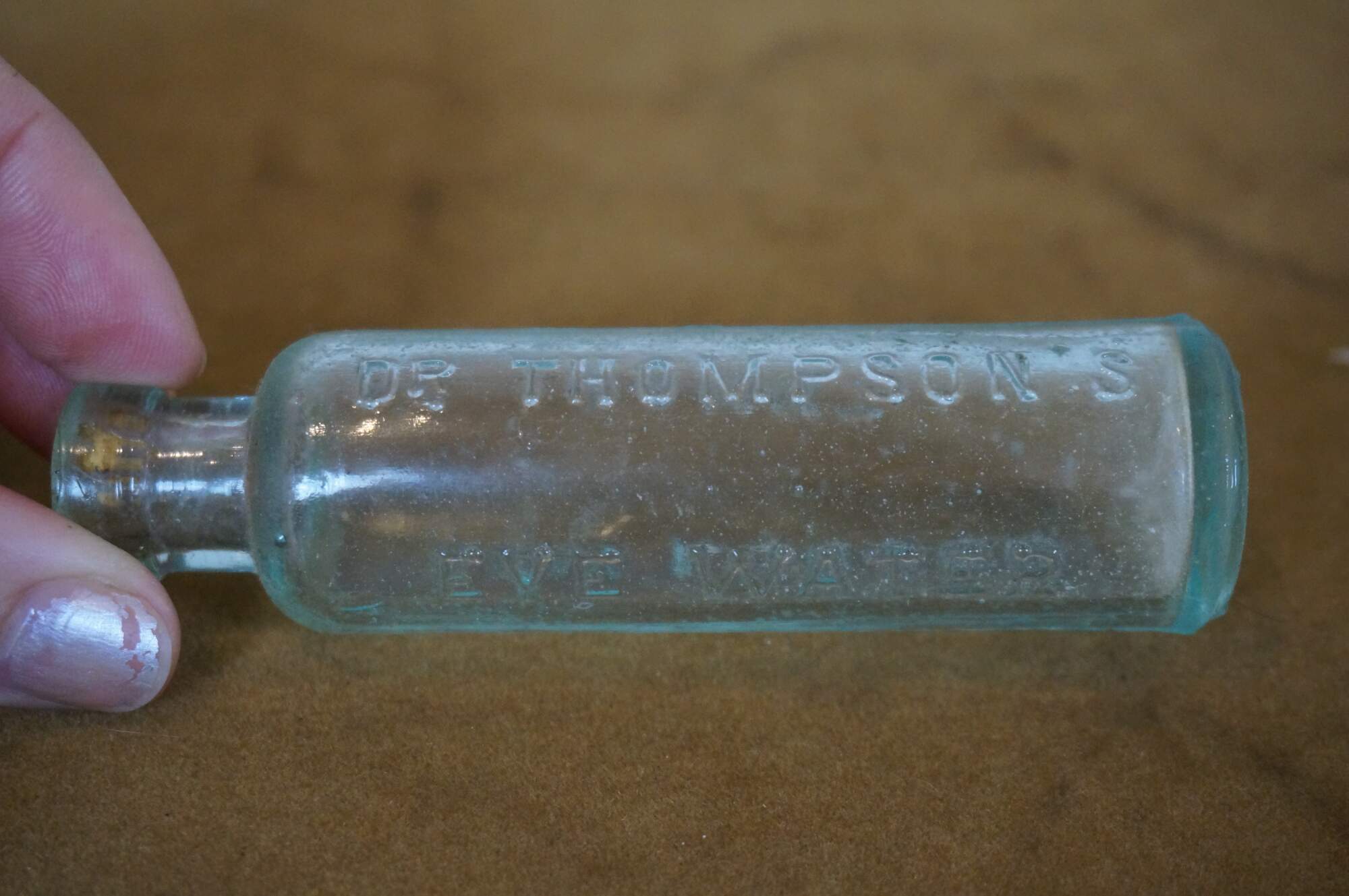Pair of antique late 19th to early 20th century embossed medicine bottles for Shiloh's Consumption Cure (S.C. Wells & Co, Leroy, NY) and Dr Thompson's Eye Water (New London, Conni.). Clear glass with a pale blue tint. No lids or corks.