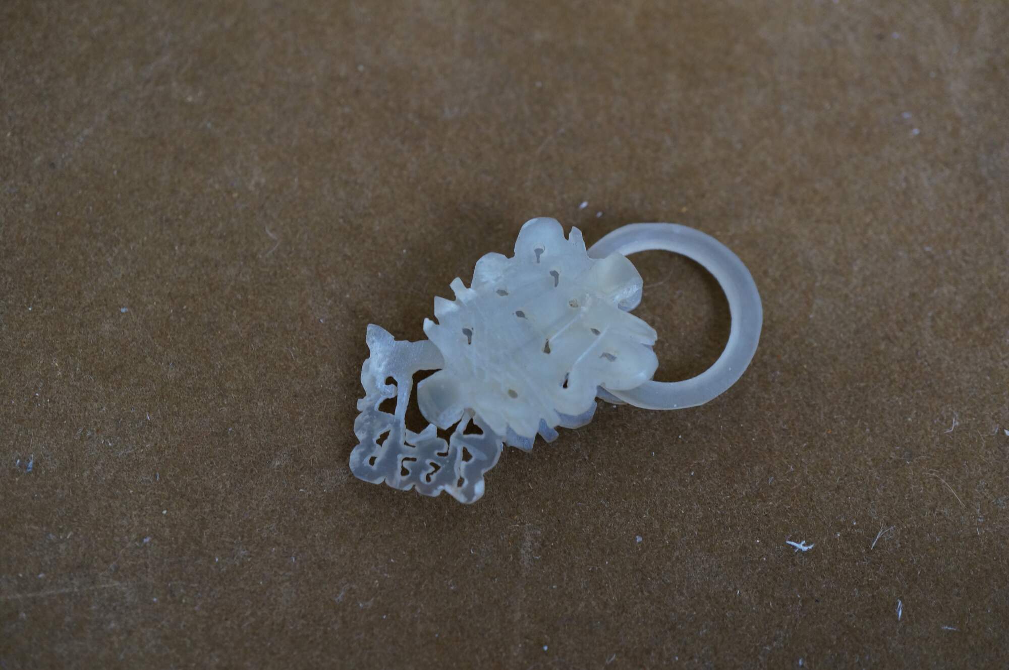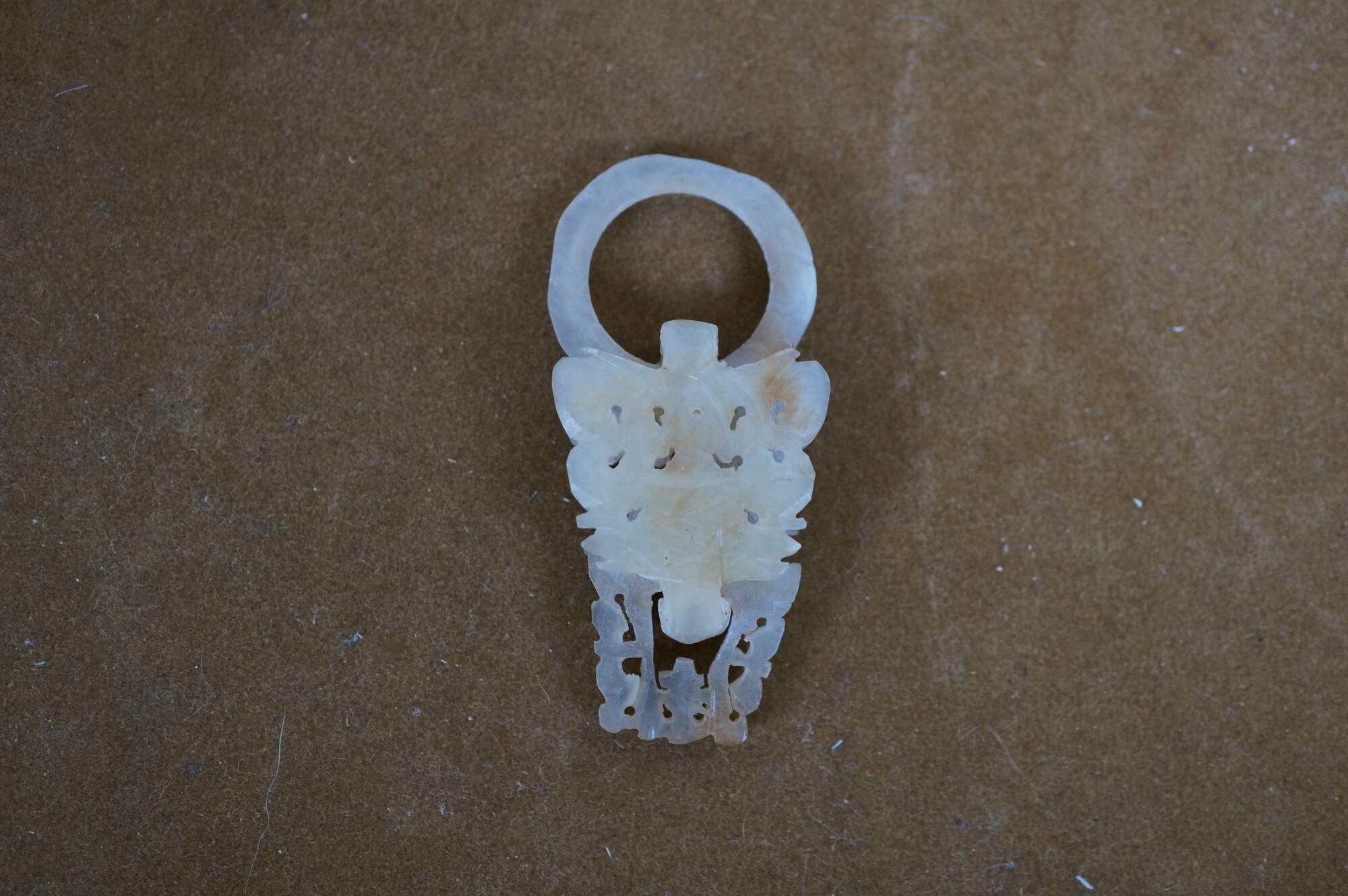 The term "devil's work" refers to a Chinese technique in which jade jewelry is meticulously hand carved, often featuring seamless interlocking rings or lace-like cutouts that resemble filigree. The time consuming process requires great skill, and was therefore named "devil's work," as though human hands were incapable of producing such intricate work.
