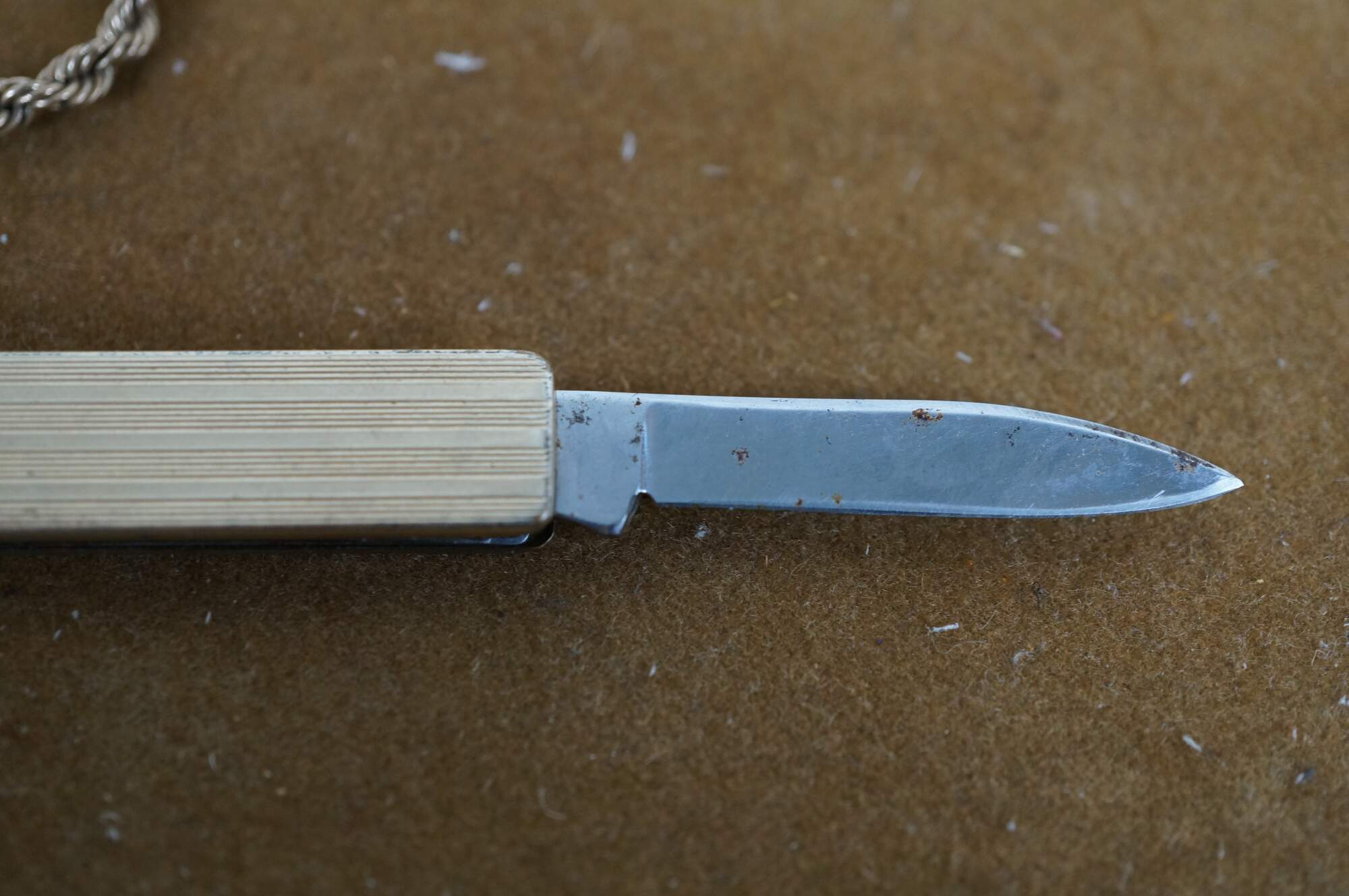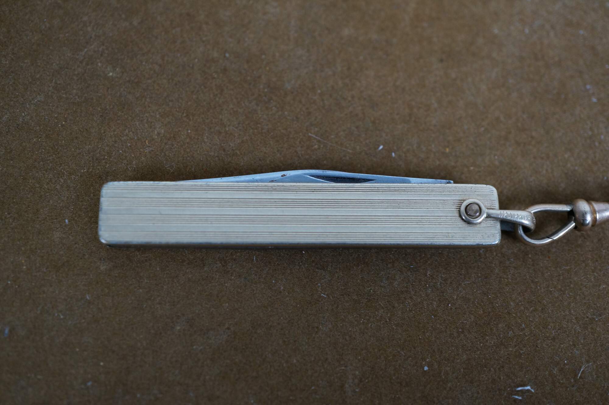Circa mid to late 20th century Simmons 1/20 12K gold filled rope twist watch chain and pen knife fob. Knife features two Latama Italy stainless steel blades. Rectangular shape, one side etched with stripes, the other with an empty section for engraving a monogram.