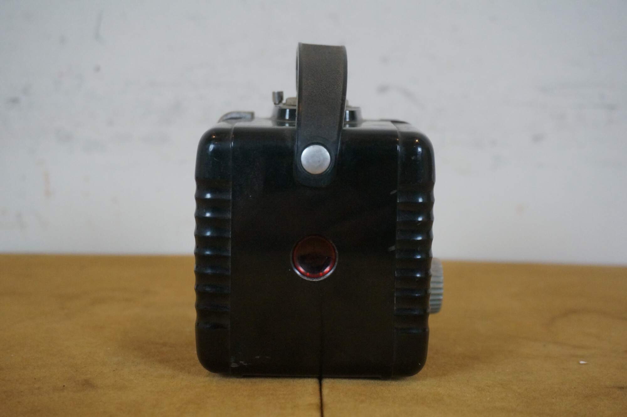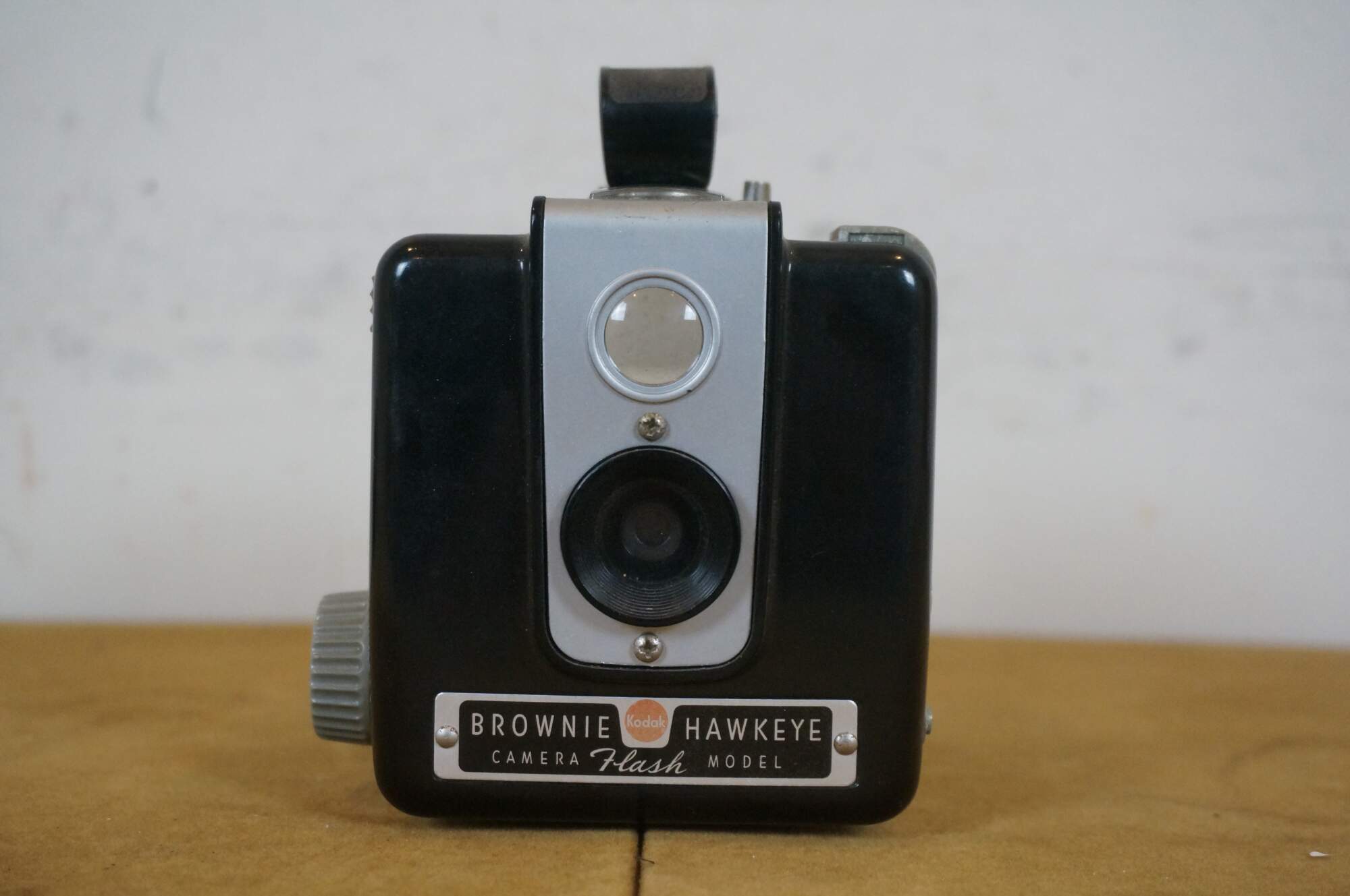 "The Kodak Brownie Hawkeye is a Bakelite box camera that takes 12 6x6cm images on 620 film, made in the USA and France by Kodak, between 1949-1961. The camera is compact, box-shaped, with a carrying handle on top and a winding knob to the photographer's right. The design aesthetic is a throw-back to the Art Deco era of the 1920's, with clean minimalist fluting on the sides and an attractively-designed front. This camera is the work of an Arthur H Crapsey, who designed other plastic box cameras with similar aesthetics." (Source: Camera Wiki)