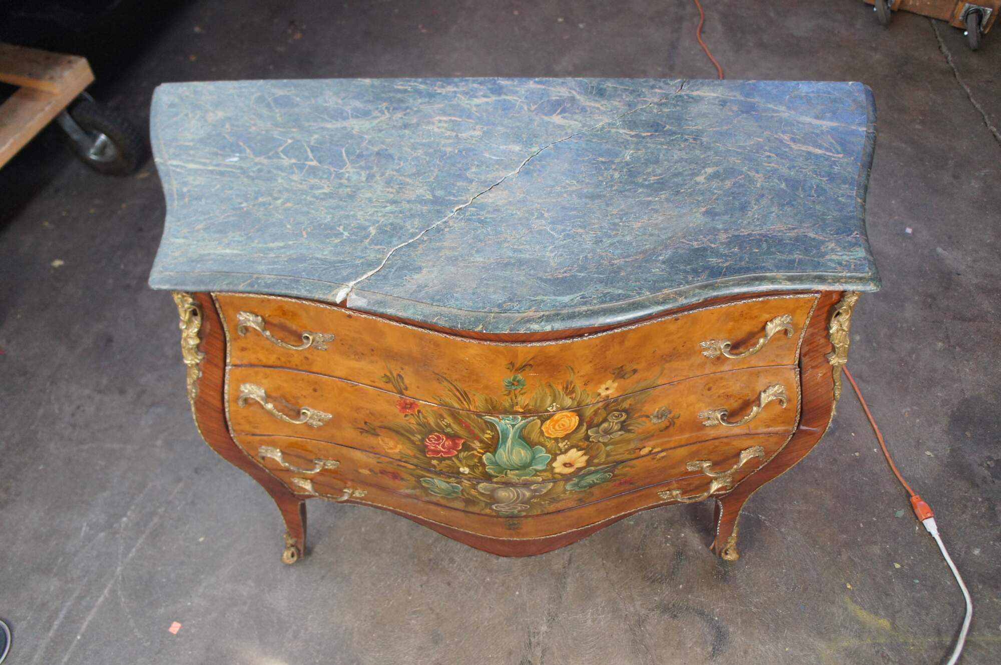 20th century French Louis XV-style serpentine marble commode / Chest of Drawers / Dresser. Made from mahogany with birdseye maple and hand-painted floral details. Features four dovetailed drawers and brass ormolu trim throughout.