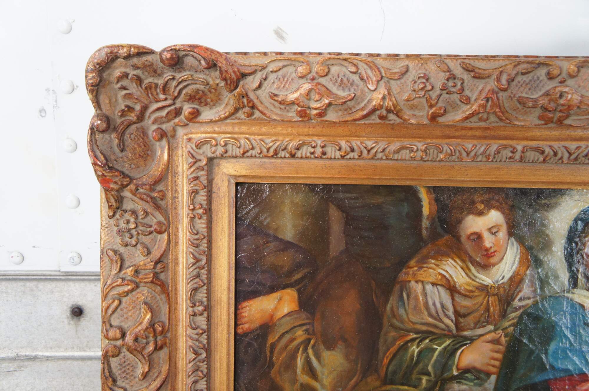 Madonna in Glory with Saints" a Contemporary School oil painting after Anibale Carracci. The oil painting is on canvas with craquelure giving the appearance of an antique. Signed lower right and framed in Italian Baroque manner with gold finish. The original was painted during the 16th century and is in thee Pinacoteca Nazionale di Bologna collection in Italy.