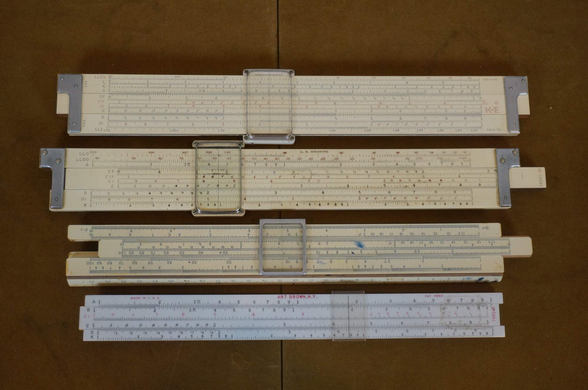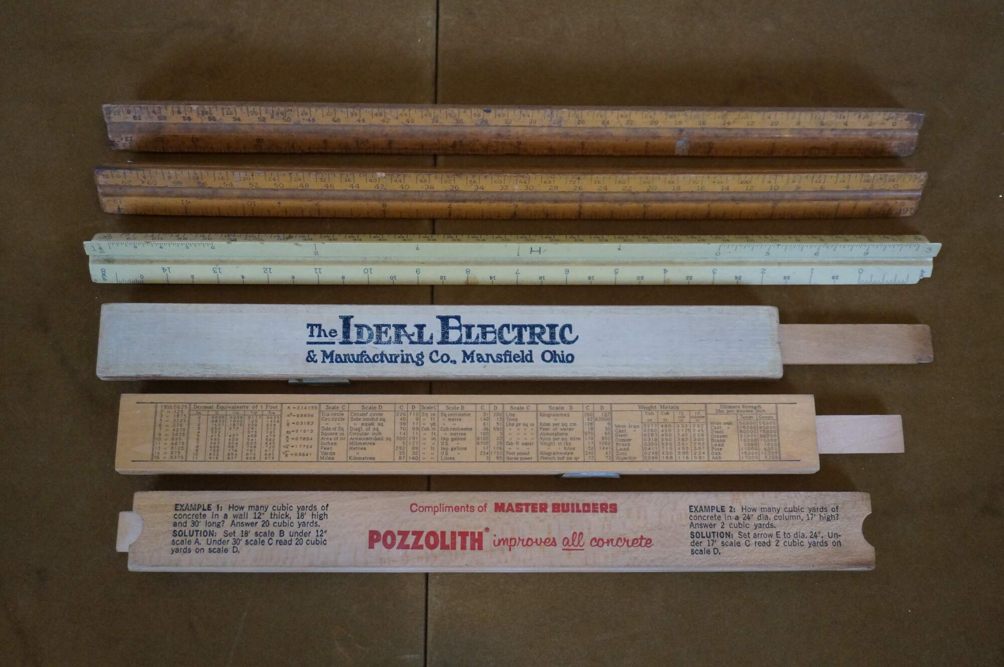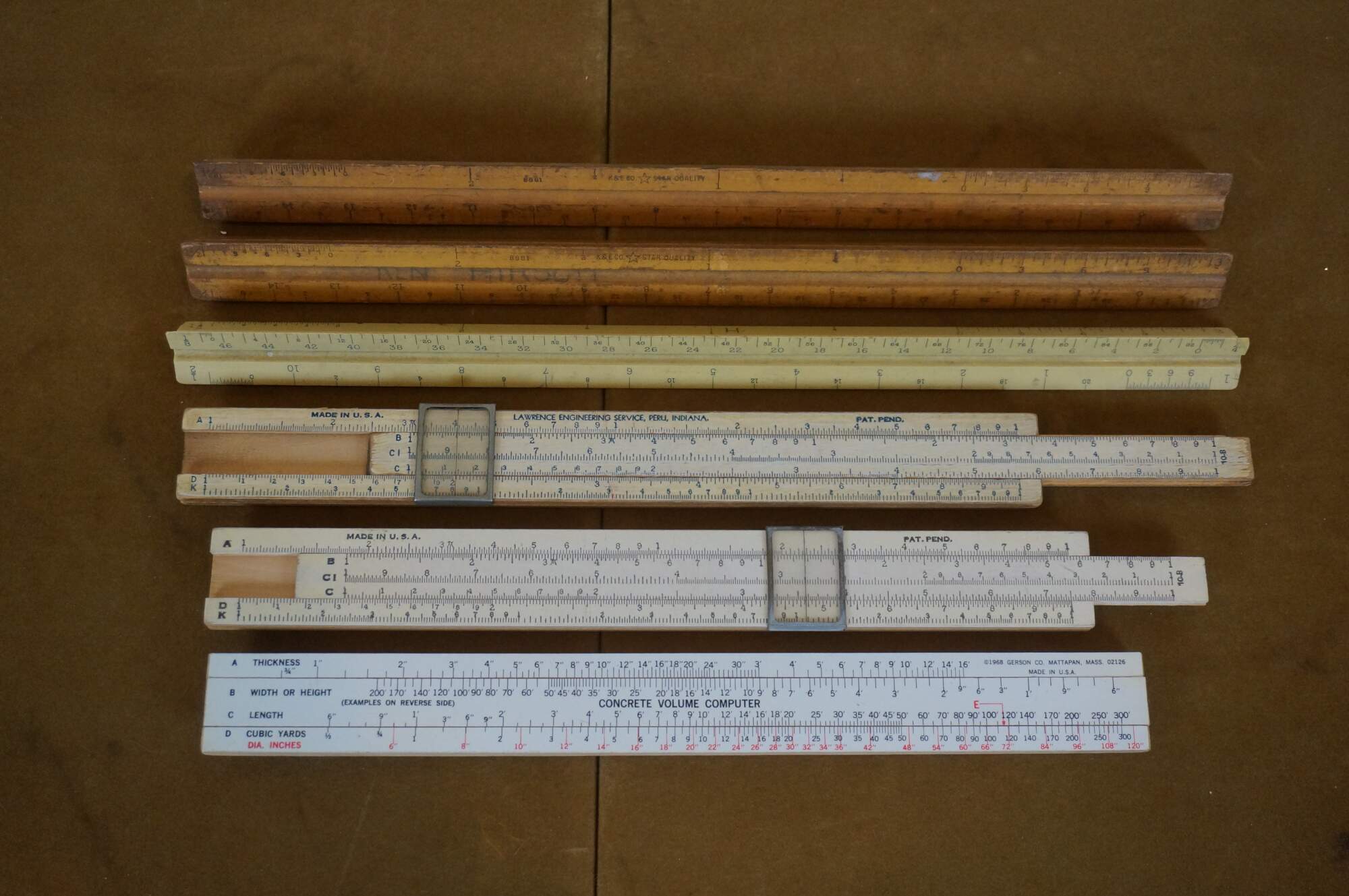 Lot of 16 vintage engineering rulers and slide rules. Includes: Charvoz Aristo Multilog Nr. 0970 with brown leather case; Keuffel & Esser Co 4058W Beginner's Slide Rule and case; Lawrence Engineering Service, Peru, Indiana / The Ideal Electric & Manufacturing Co, Mansfield, Ohio; Concrete Volume computer 1968 Gerson Co, Mattapan, Mass / Compliments of Master Builders / Pozzolith; Pickett Model N4-ES Vector-Type Log Log Dual-Base Spped Rule; Pickett Microline 140; Art Brown, New York. One Russian. Engineering rulers - two wooden Keuffel & Esser and one plastic. Displayed in Kimax No 14005 4000ml glass beaker.