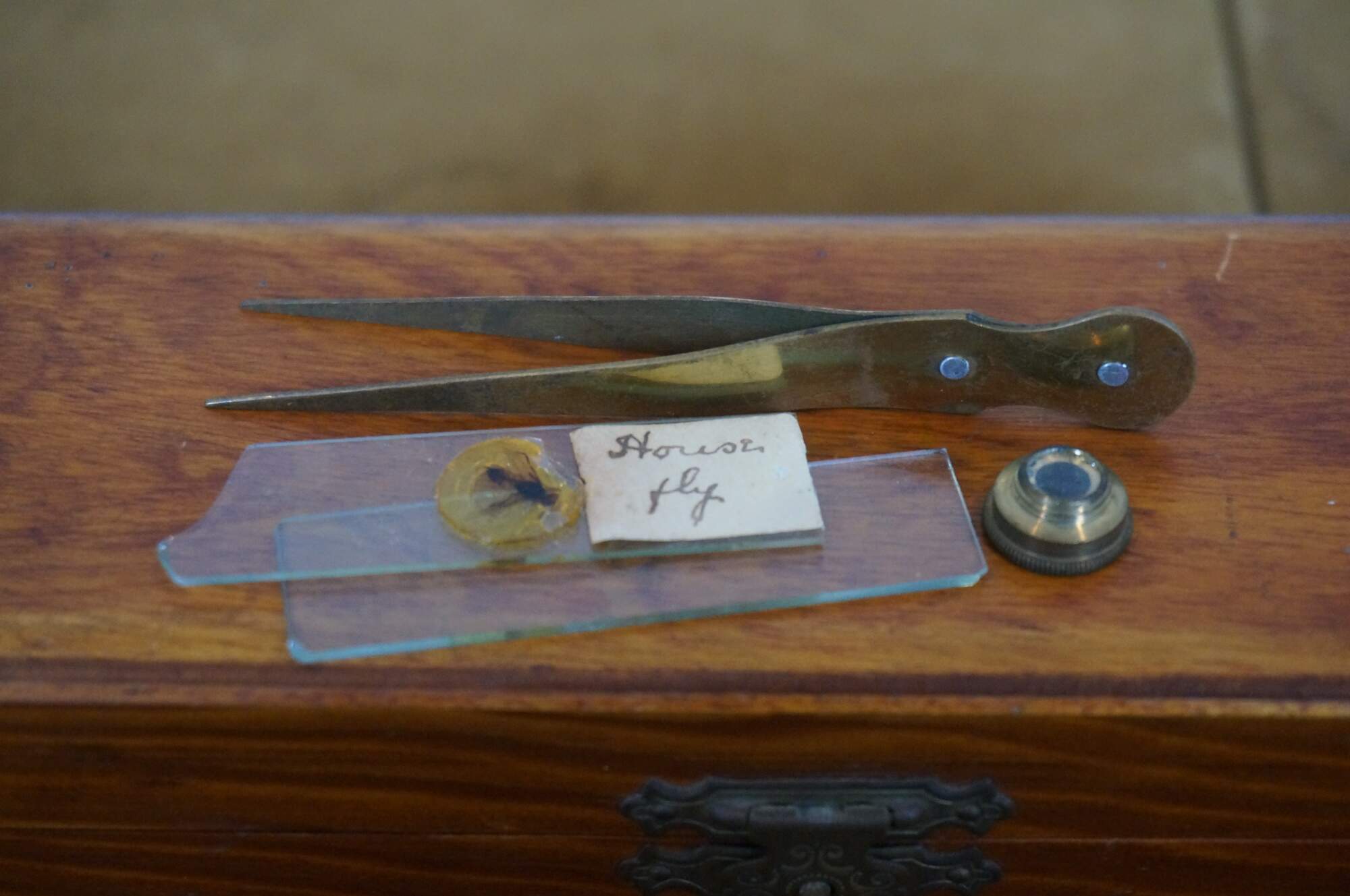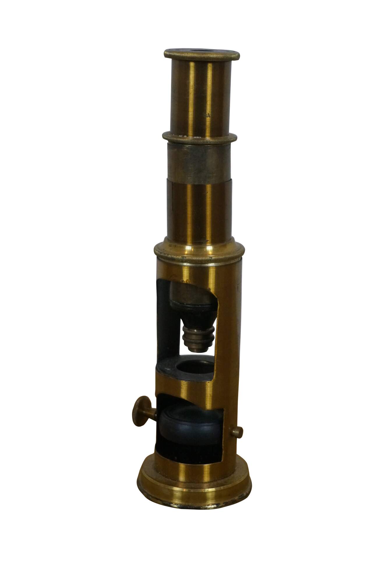 Early to mid 20th century compound monocular microscope. Made of brass in a compact size ideal for field work. Includes wooden case, spare lens, and brass tweezers.