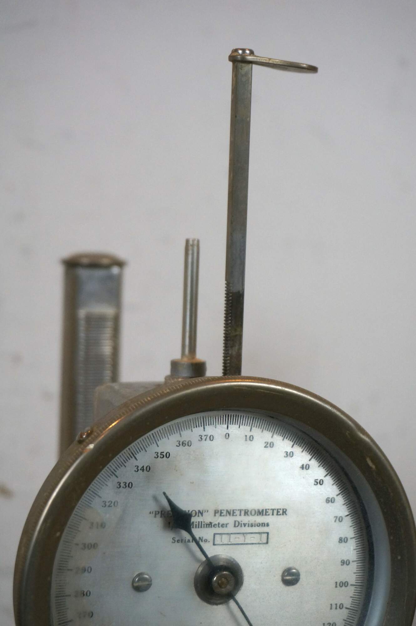 Vintage "Precision" Penetrometer with 1/10 Millimeter divisions produced by the Precision Scientific Company of Chicago, IL. Serial No. 11-Y-1. Base stamped 521417. Top stamped 521375. A penetrometer is a device that tests the strength of a material.