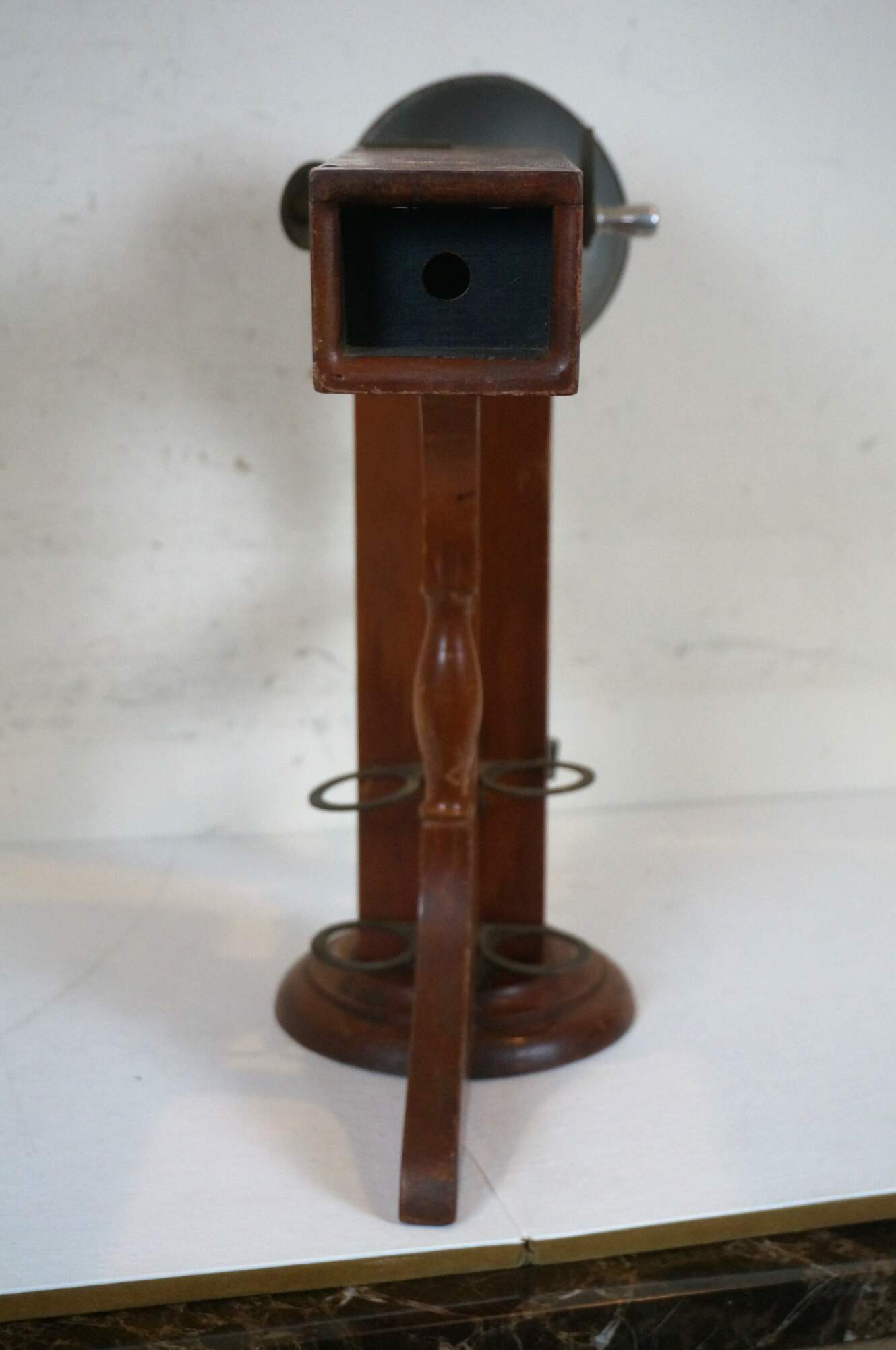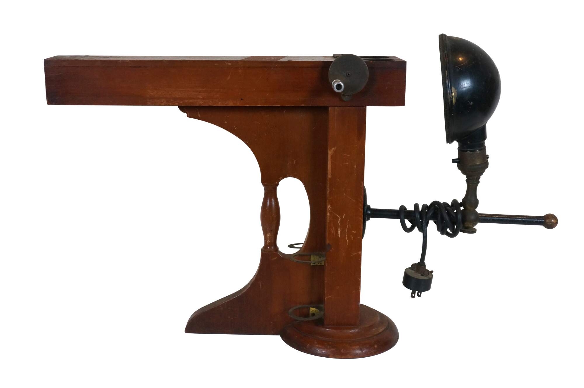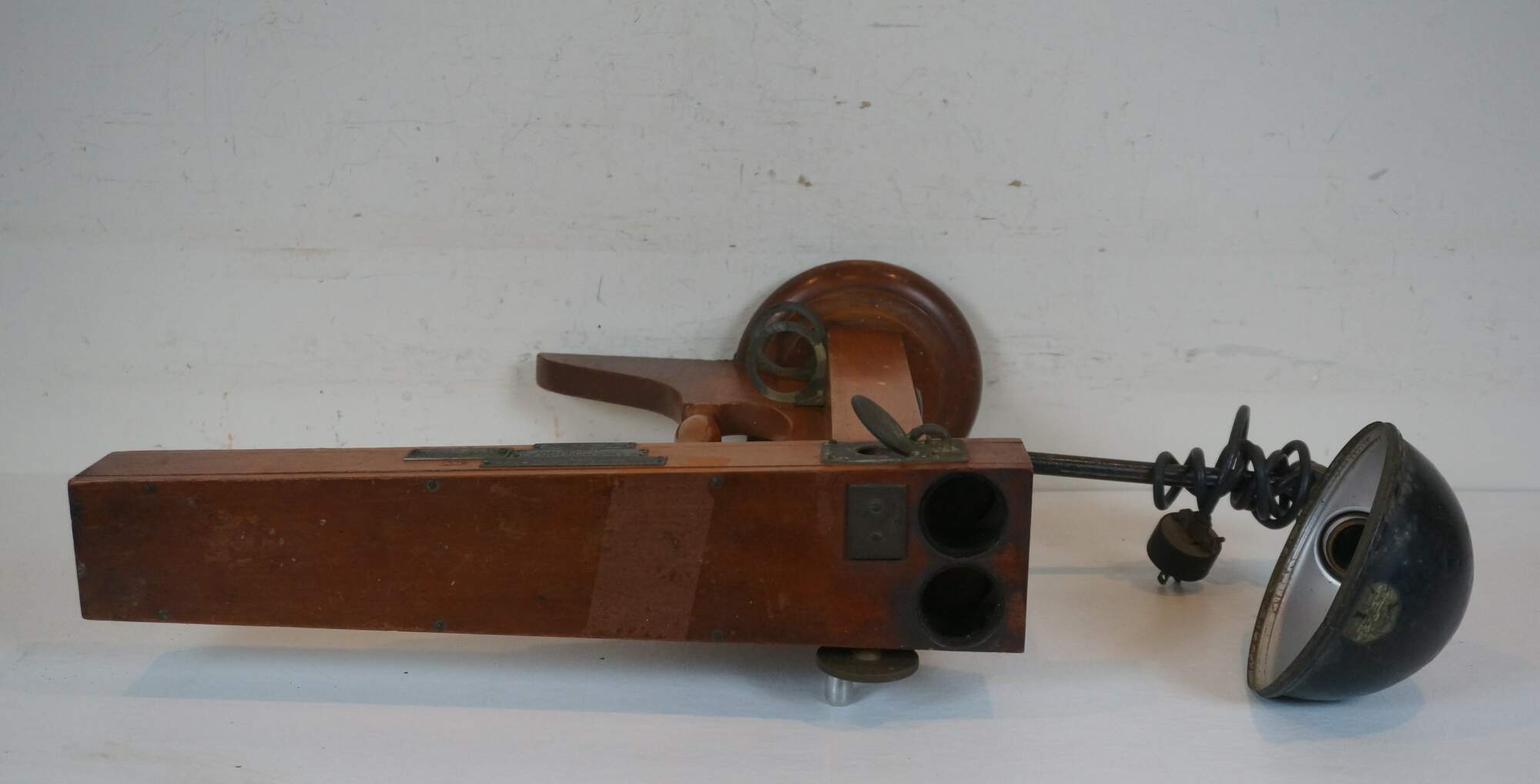Antique circa 1924 wood and metal ASTM Union Colorimeter 707 petroliana lamp, produced by the Charles J. Tagliabue Maufacturing Company and the Braun-Knecht-Heimann Company. Previously owned by the United States Navy - Mare Island 221 Navy Property No 039056. A colorimeter is a device that measures and quantifies emitted light from a sample. It is used primarily to identify color differences between a production sample and a known color standard. (Source: Hunter Lab)