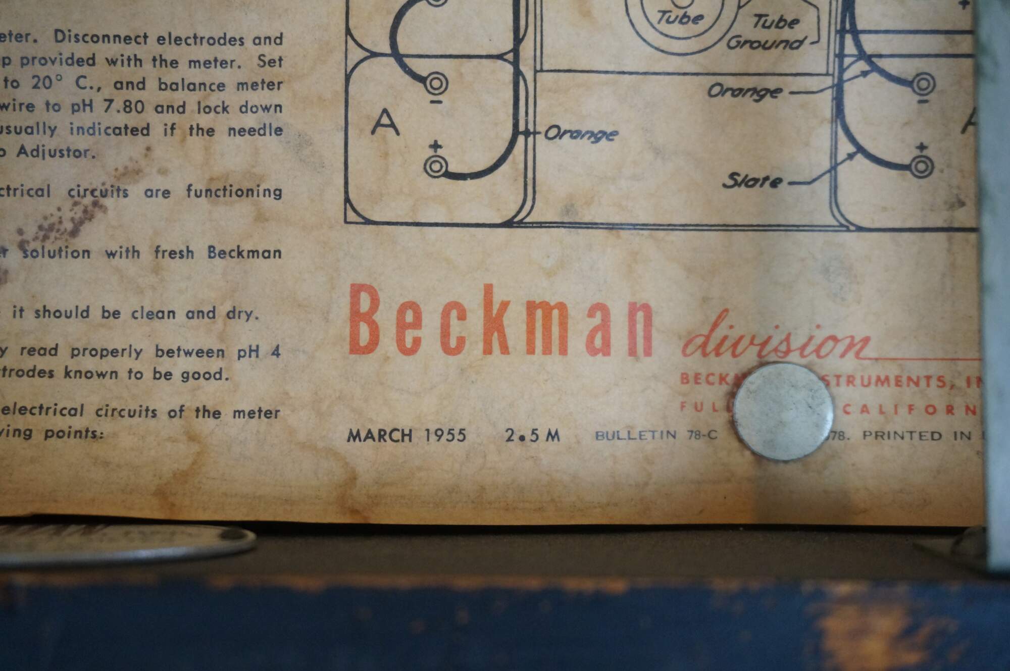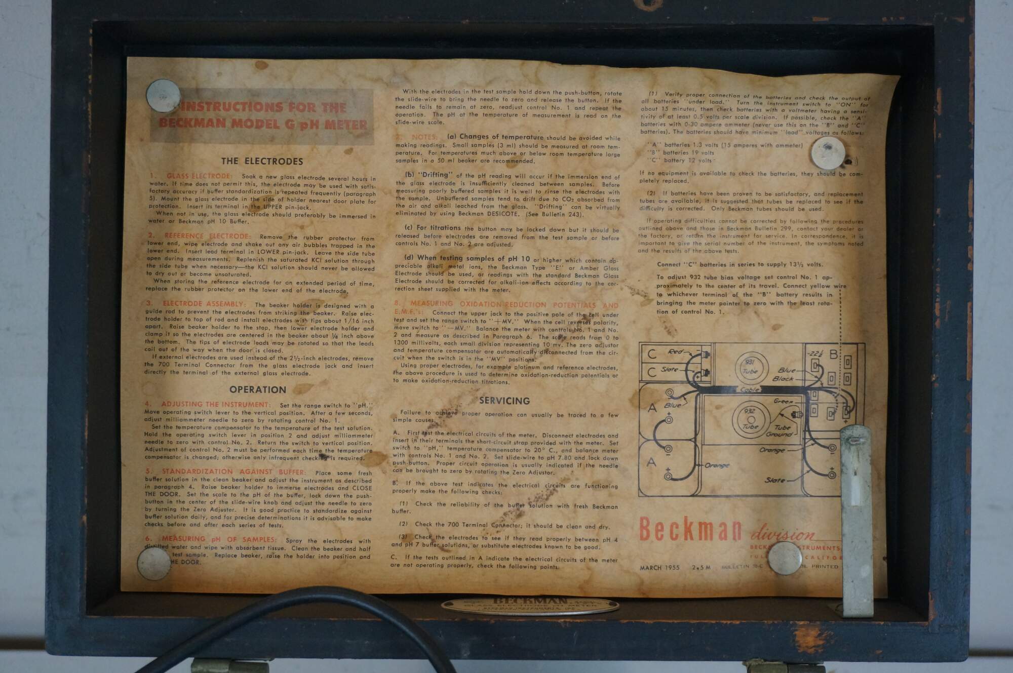 Mid 20th century Model G Glass Electrode pH Meter produced by Beckman Instruments, Inc of Fullerton, california, USA. Serial 112151. Manufactured March 1955. Distributed and Serviced by Fisher Scientific. Base stamped 43 2.
