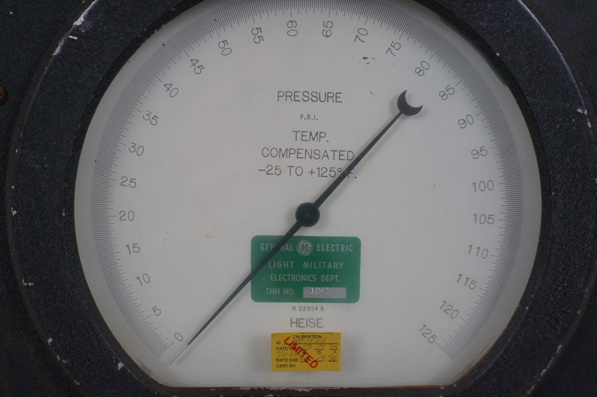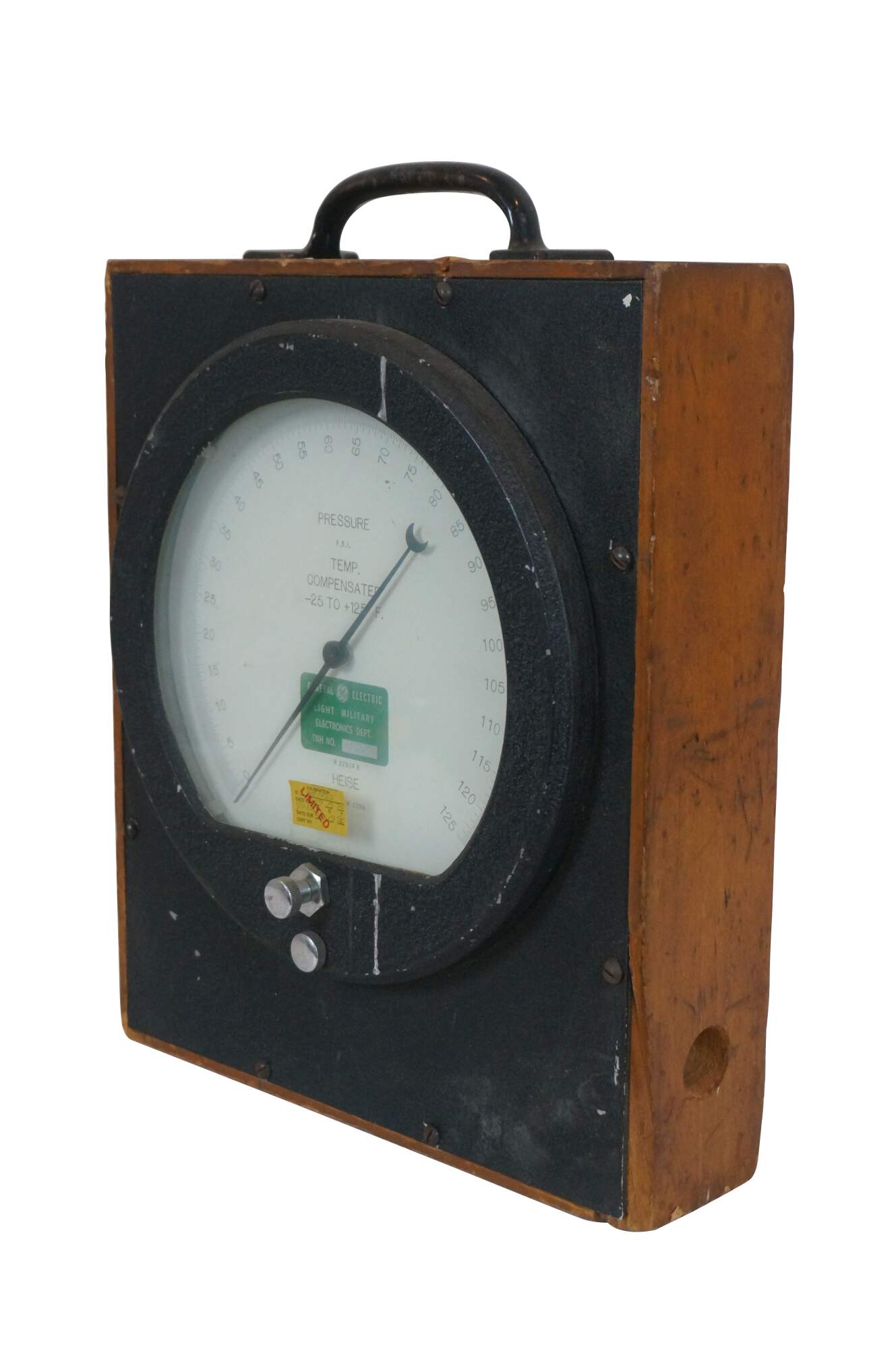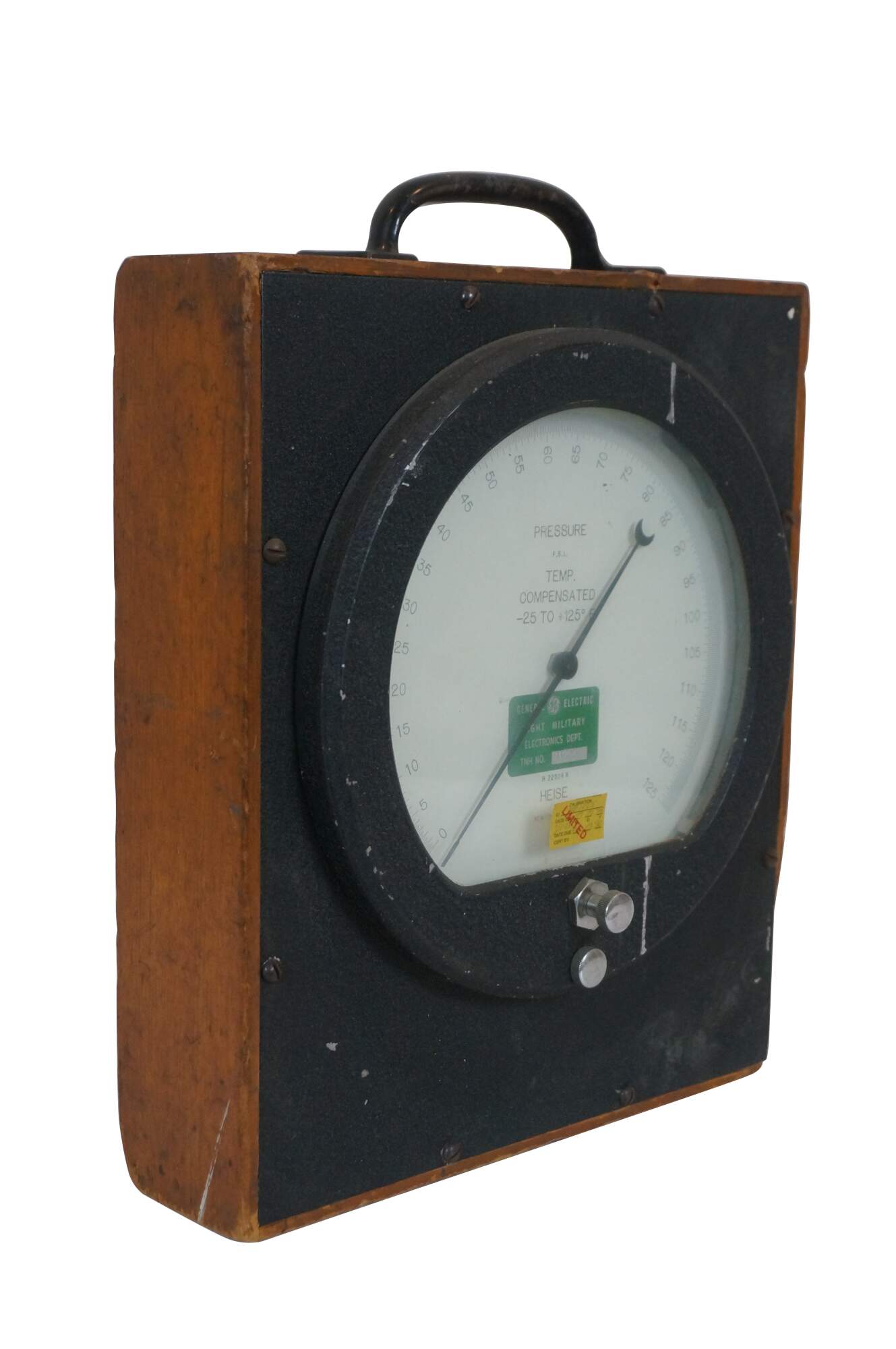 Mid to late 20th century H 22304 R Temperature Compensated Pressure Gauge in hardwood carrying case. General Electric Light Military Electronics Department - TNH No. 1025.