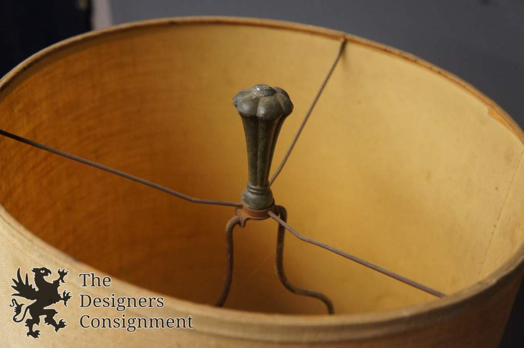 Good Vintage Condition - Wire casing Split Near Plug; Some Rust/Verdigris to Base; Wood Distressed; Shade Yellowed/Musty
