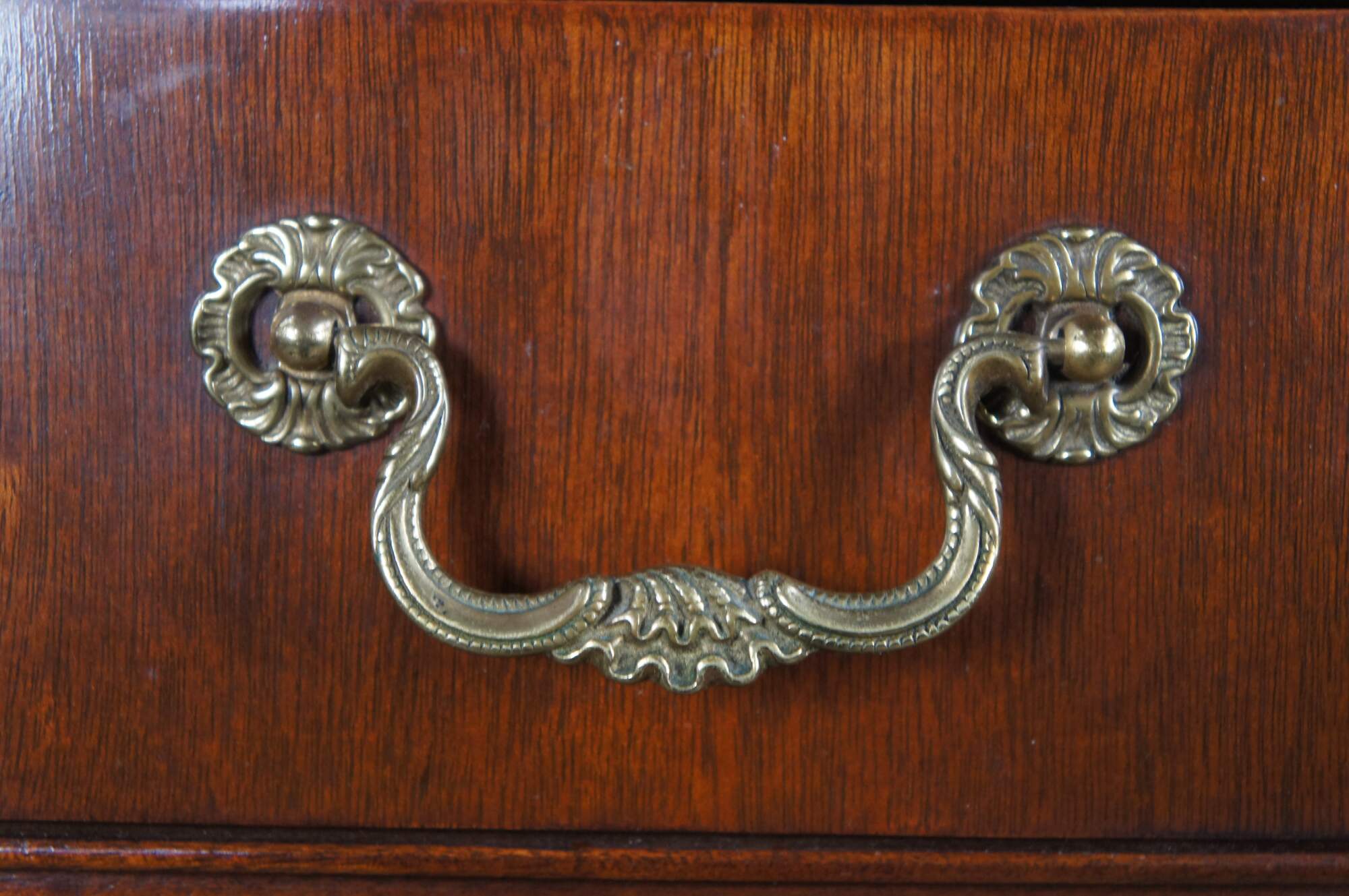 Baker Furniture English Georgian Style Lingerie Chest, circa 1980s. Features a serpentine form made from mahogany with seven oak dovetailed drawers. Each drawer is accented with by a timeless scalloped brass bail drawer pull. The chest is supported by bracket feet. Baker metal tag mounted along inside left of the top drawer. Backside marked 4038