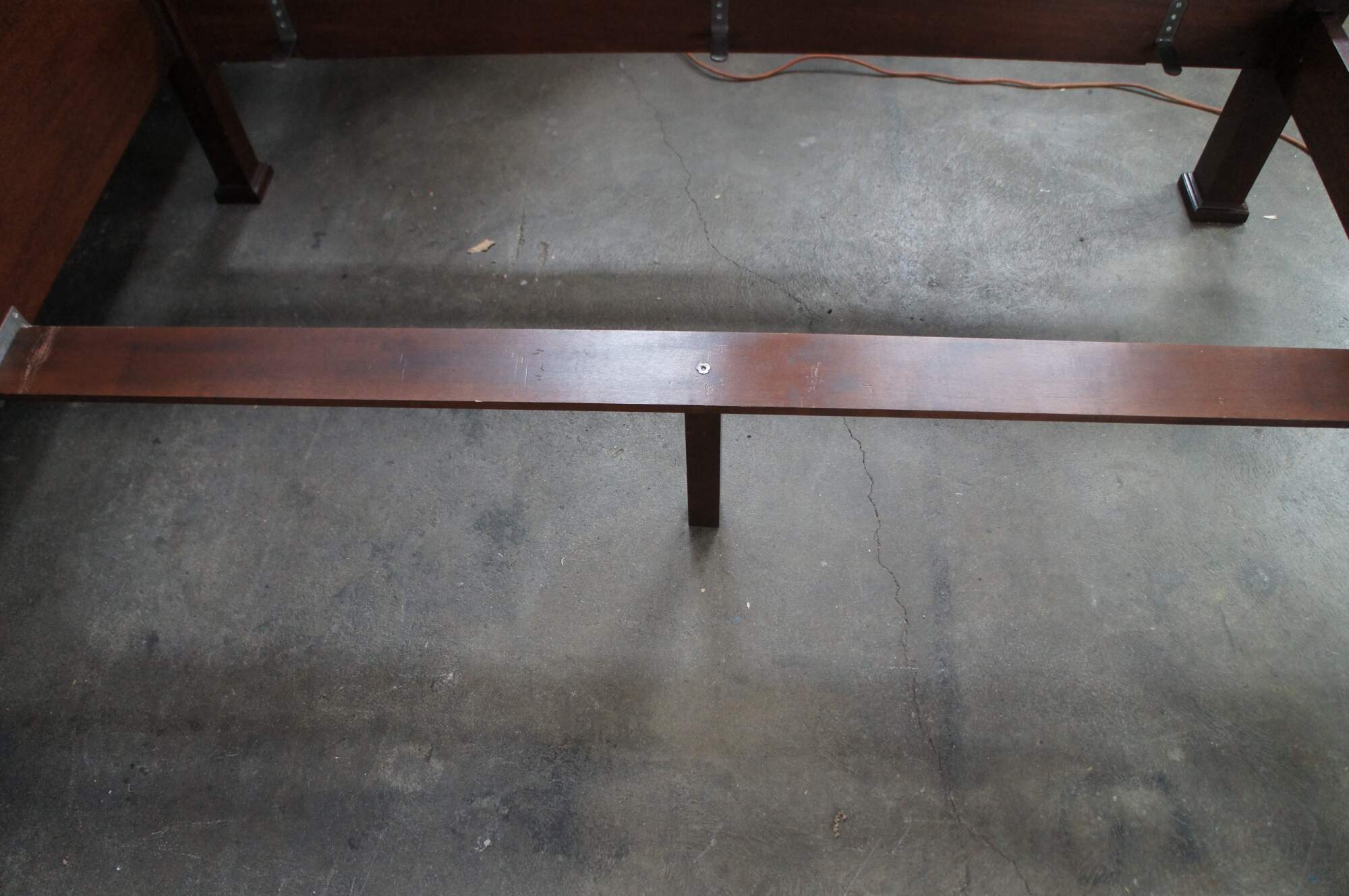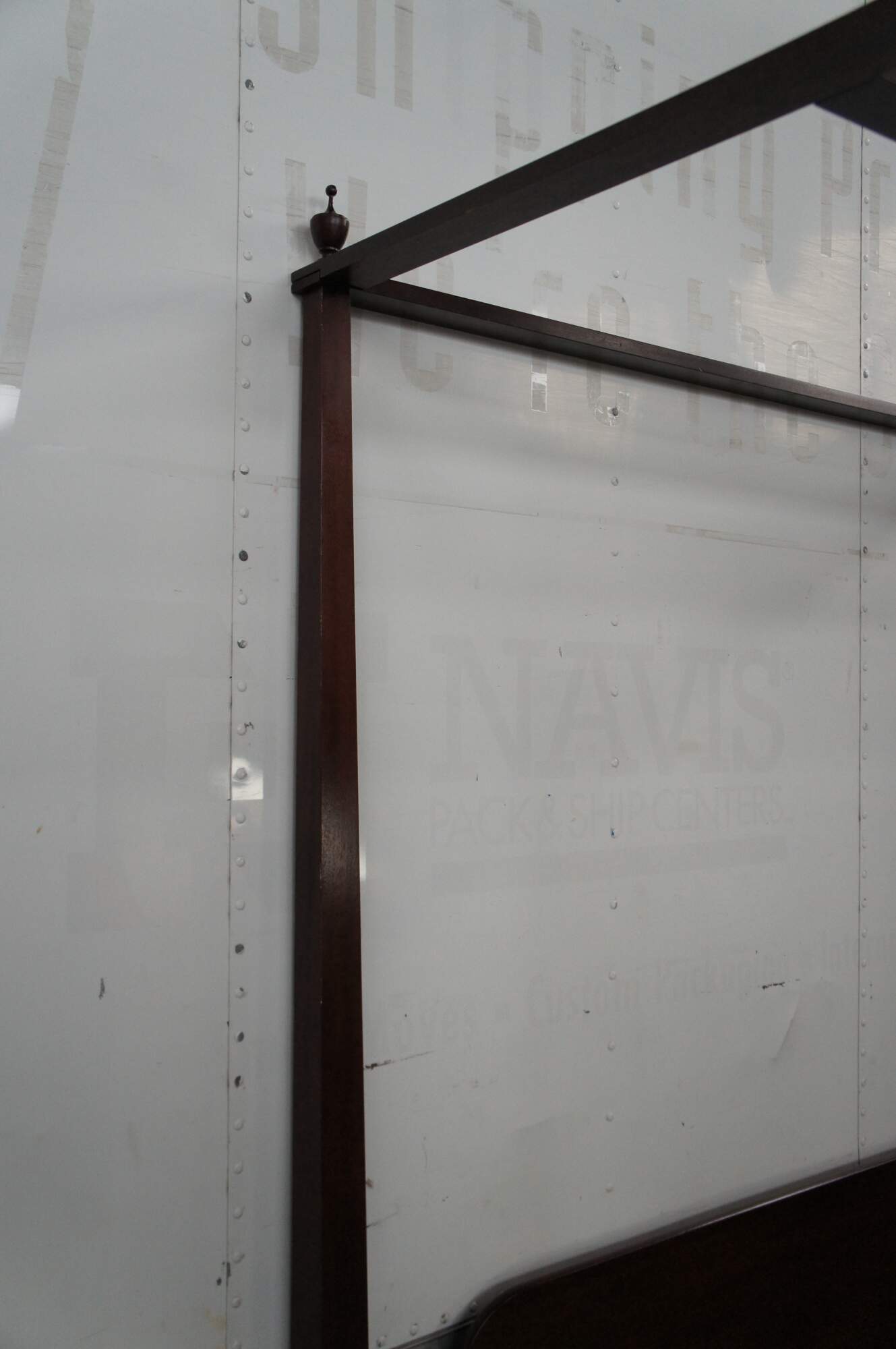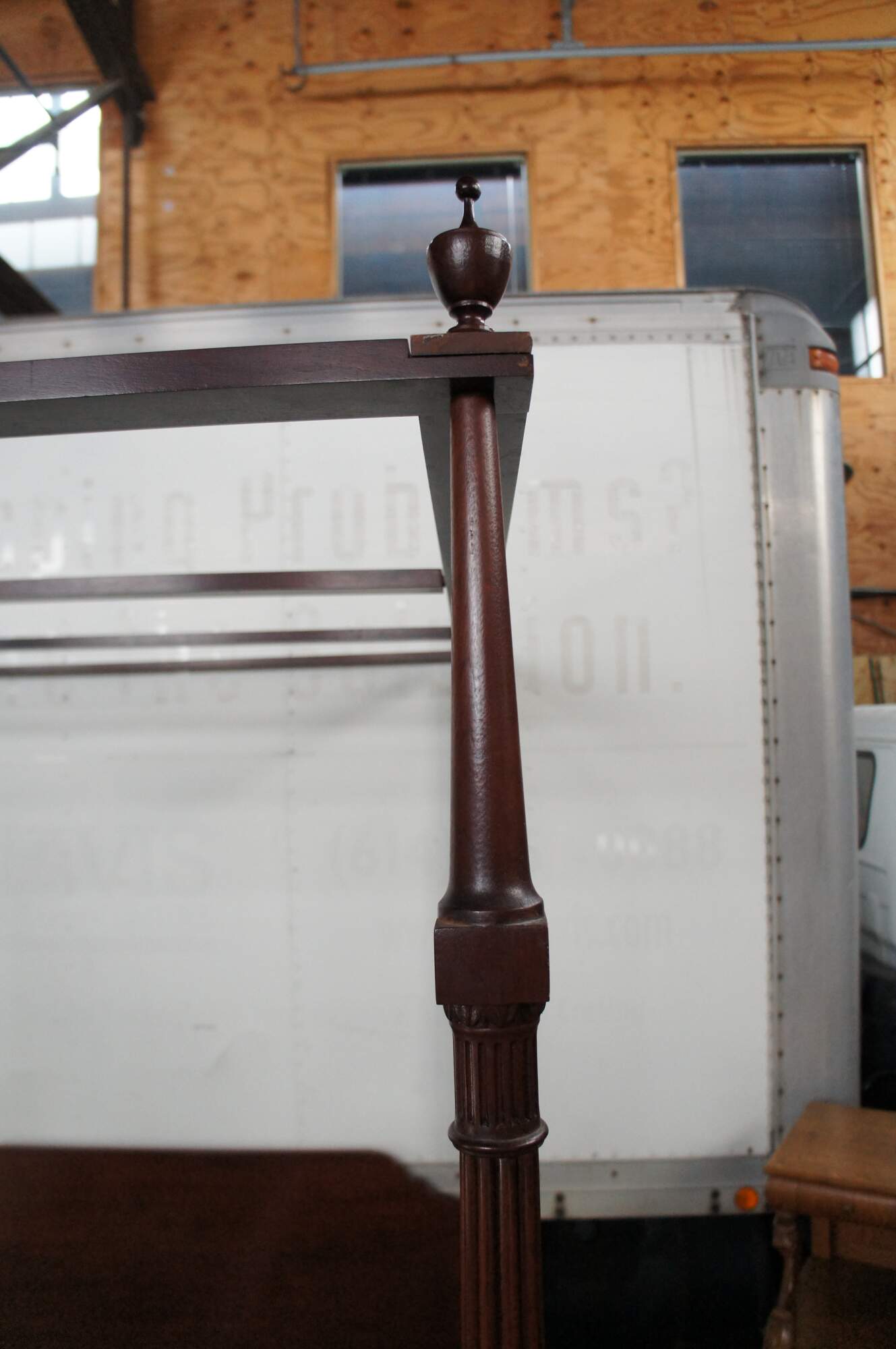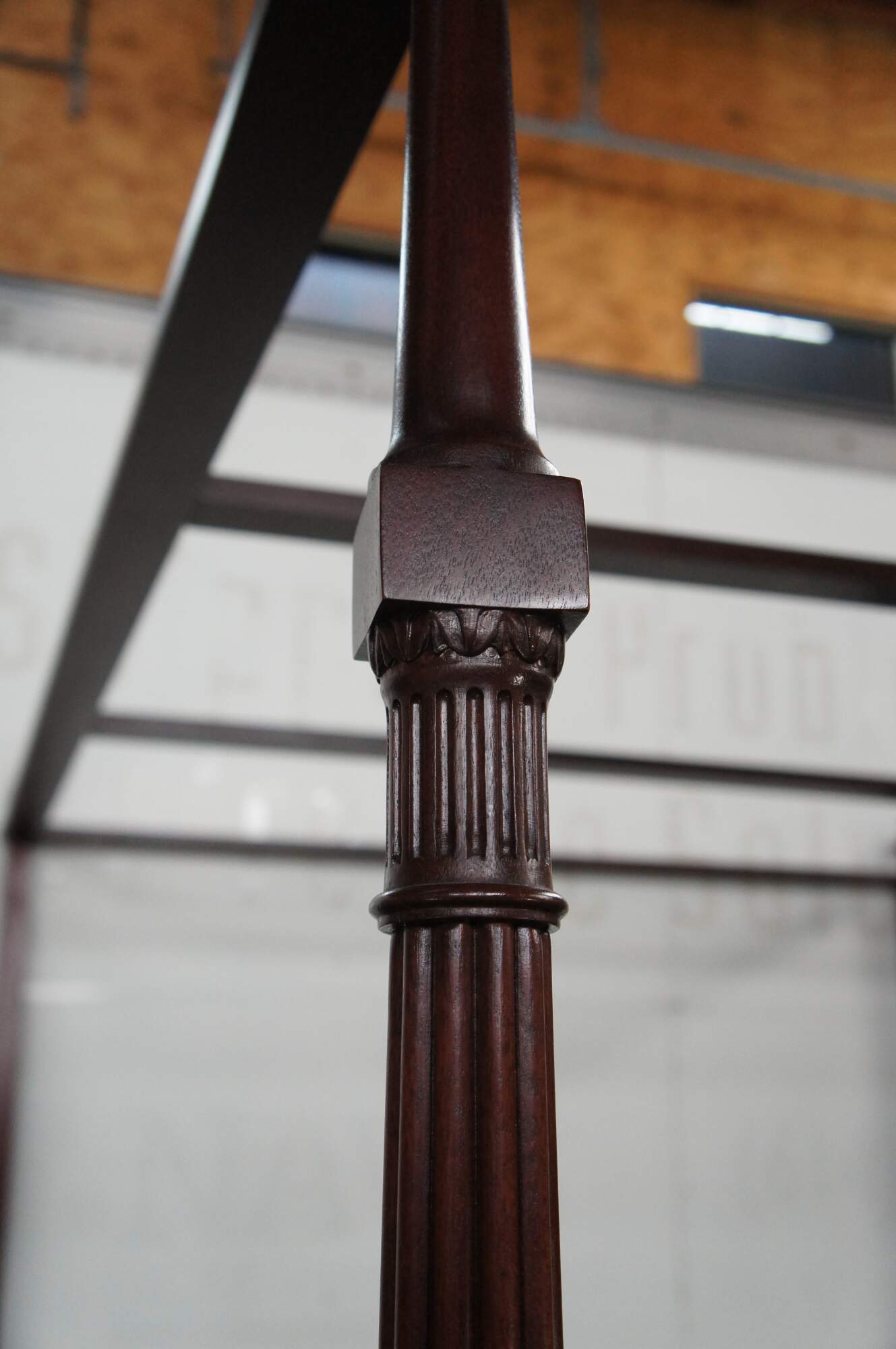 A stately Colonial Williamsburg Four Poster Bed by Baker Furniture, Circa 1980s. Features a solid mahogany frame with reeded posts, Canopy with trophy finials and square footed legs with brass accents. Marked along the backside with the Colonial Williamsburg Paper tag as well as Baker's Brass Tag.