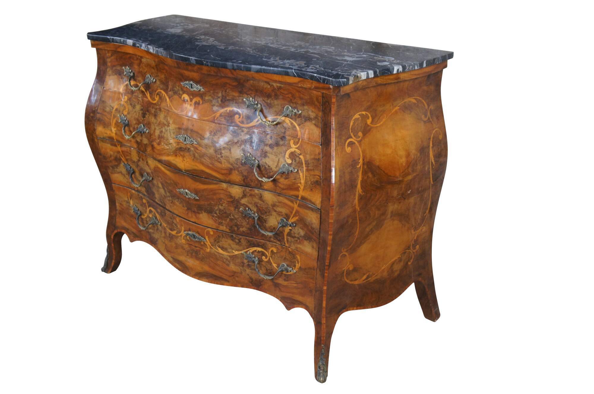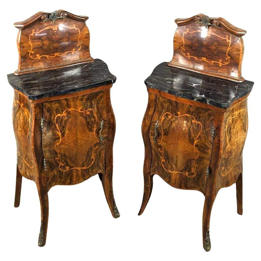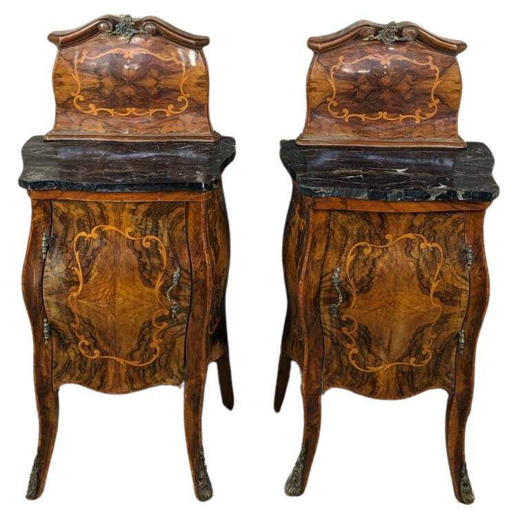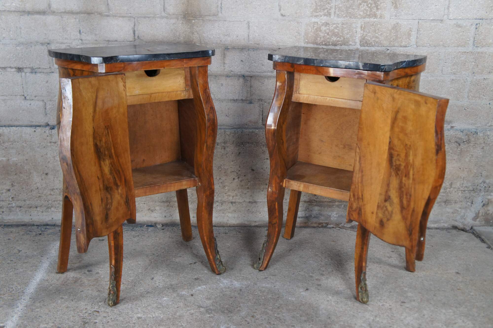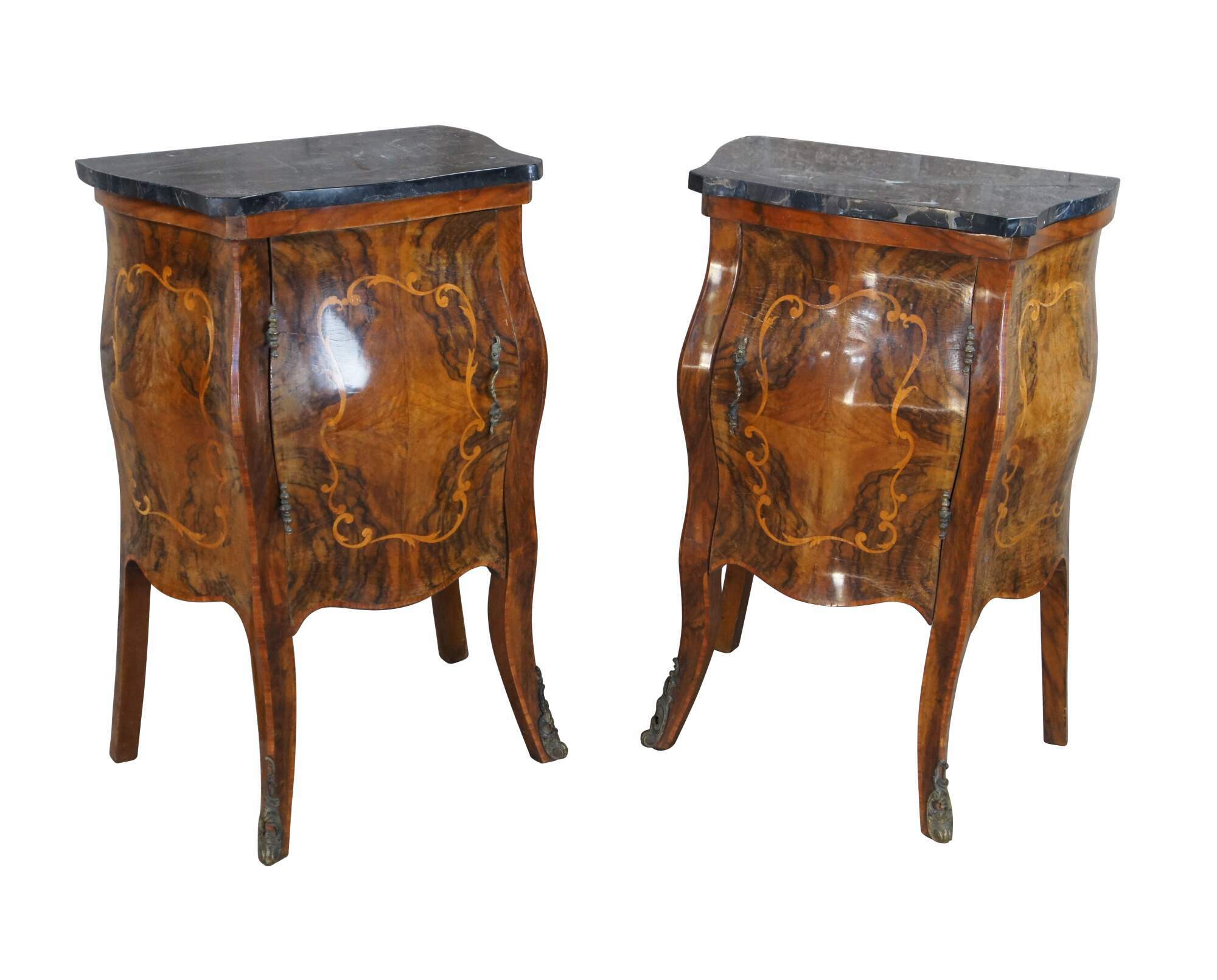 Made of highly sought-after matchbook burled Circassian walnut with gray marble tops. Features serpentine form with flowing floral marquetry inlay ornate bronze ormolu and cabriole legs. A stately addition to any space.
