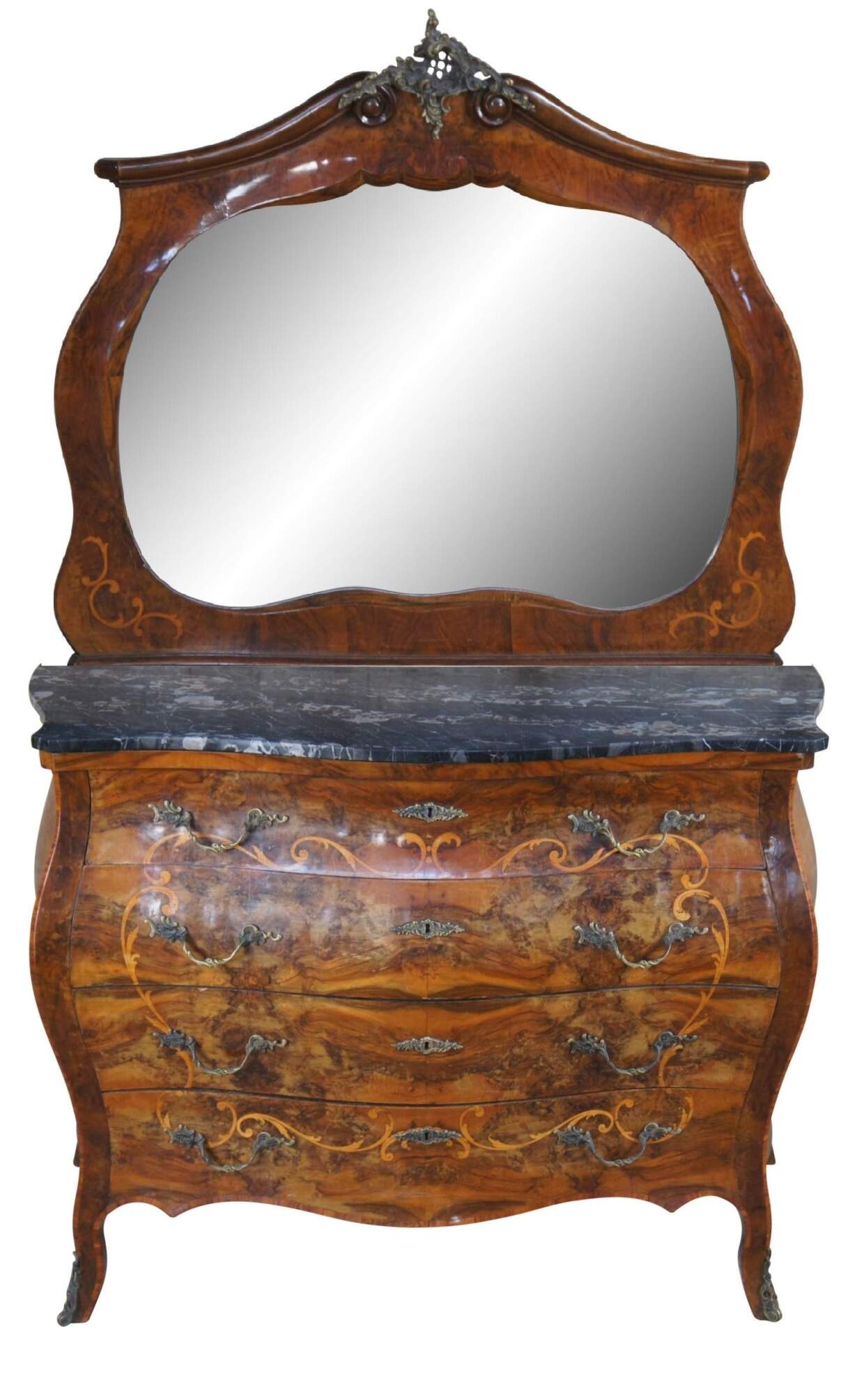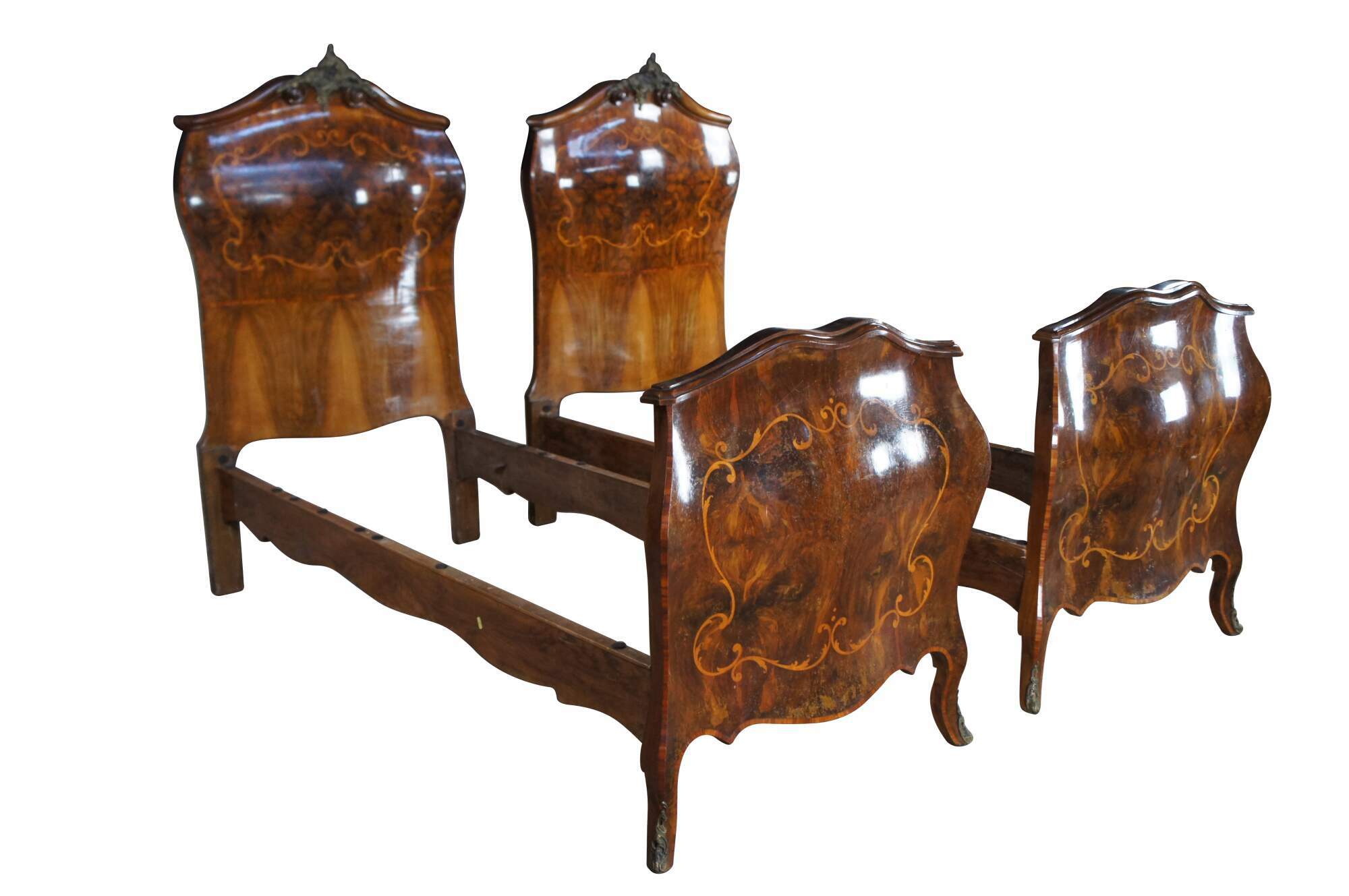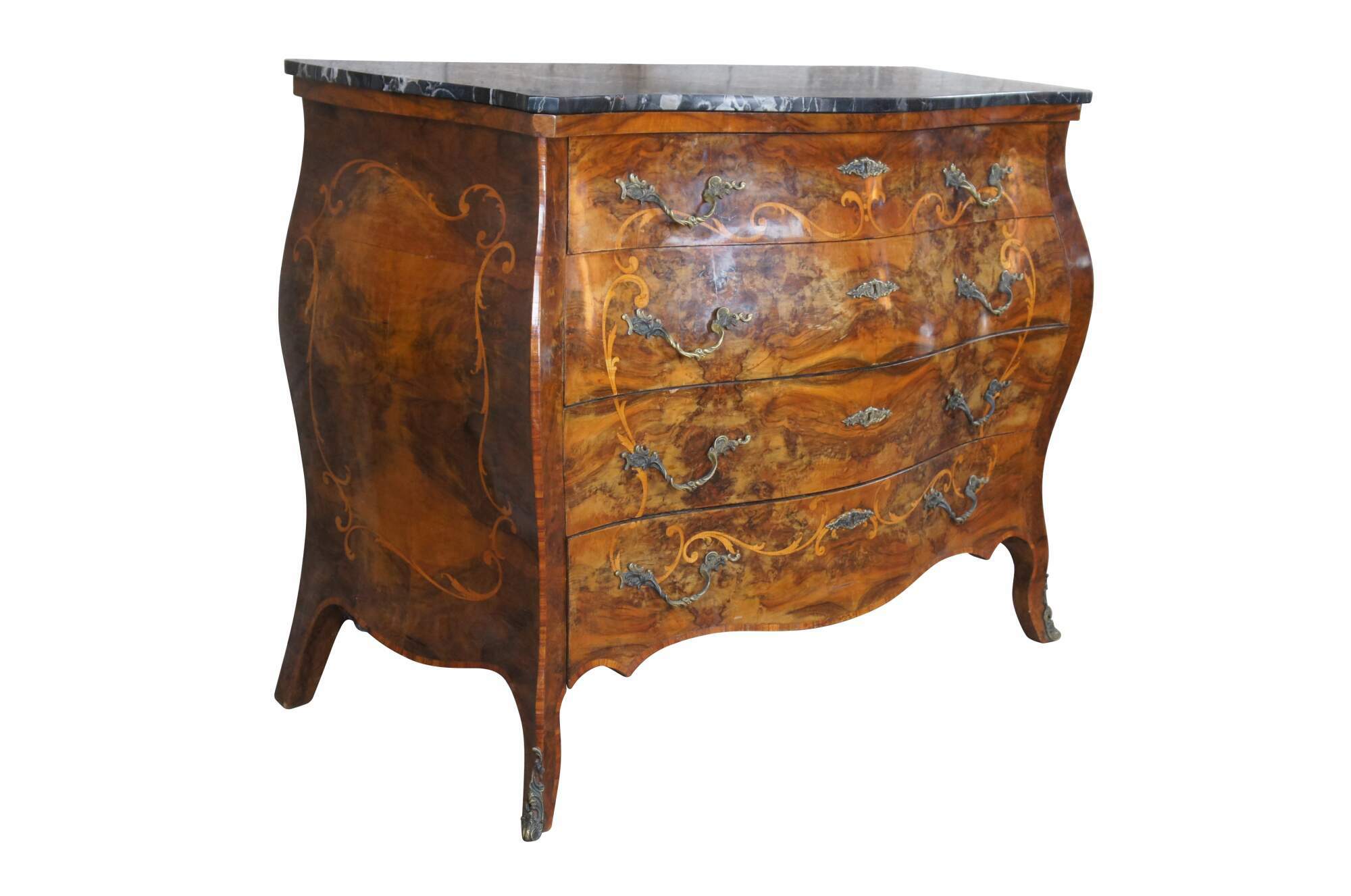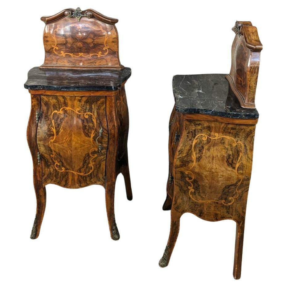 Made of highly sought-after matchbook burled Circassian walnut with gray marble tops. Features serpentine form with flowing floral marquetry inlay ornate bronze ormolu and cabriole legs. A stately addition to any space.