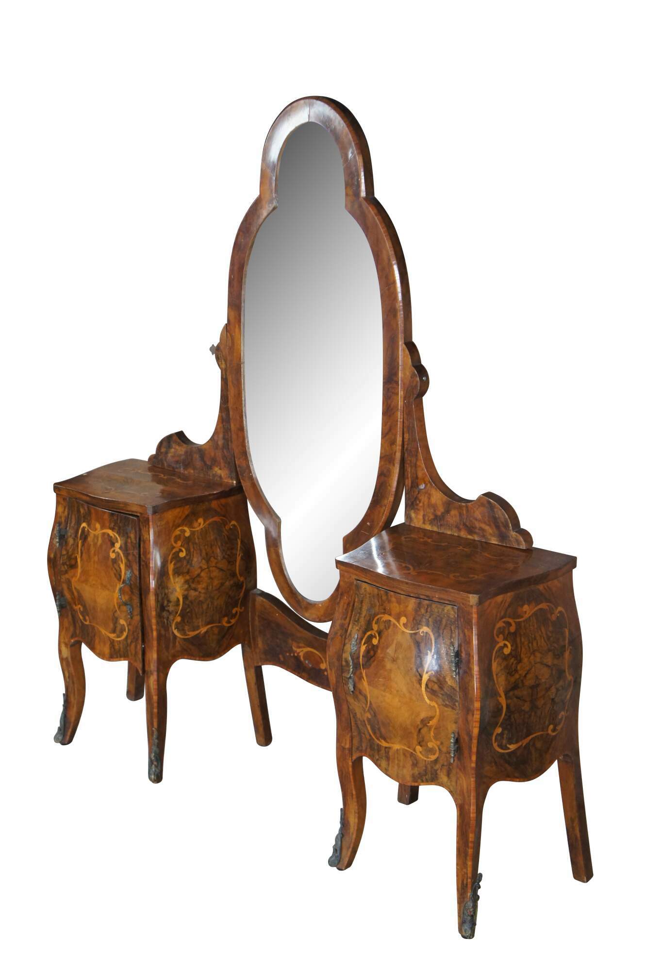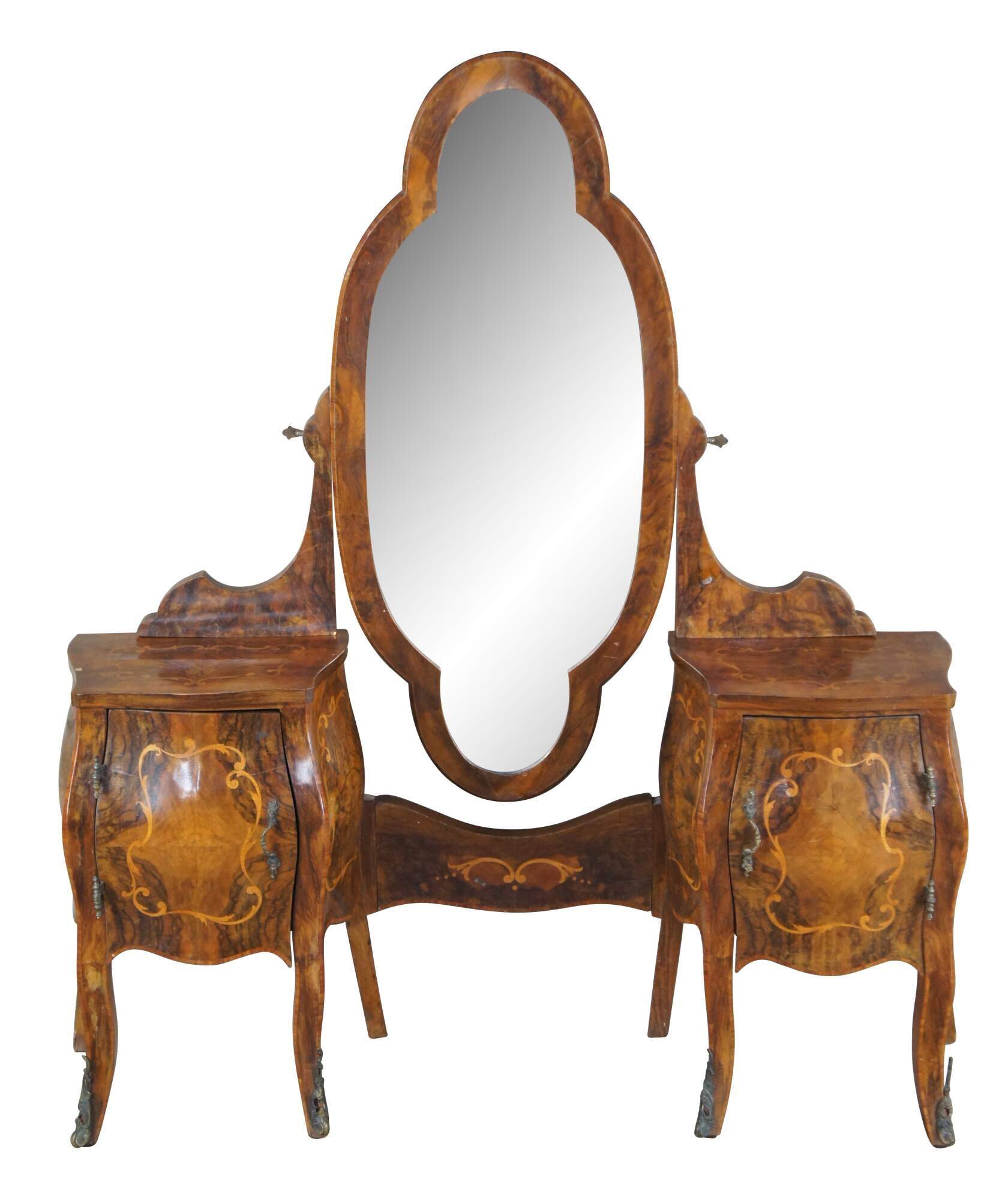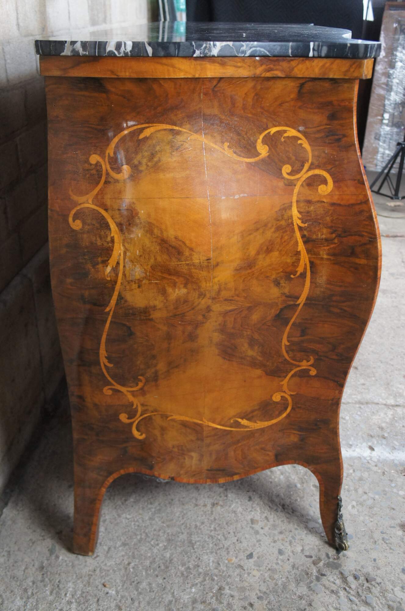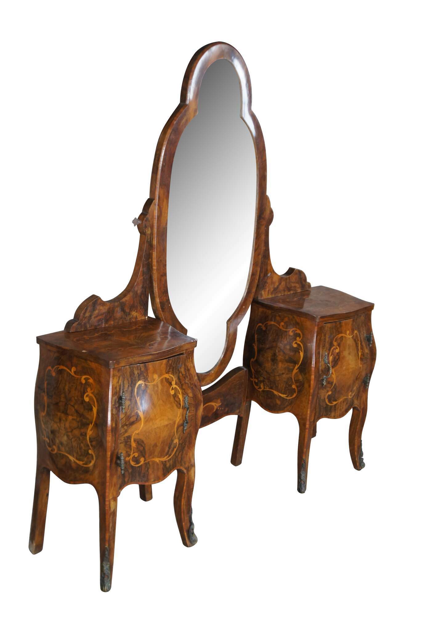 Made of highly sought-after matchbook burled Circassian walnut with gray marble tops. Features serpentine form with flowing floral marquetry inlay ornate bronze ormolu and cabriole legs. A stately addition to any space.
