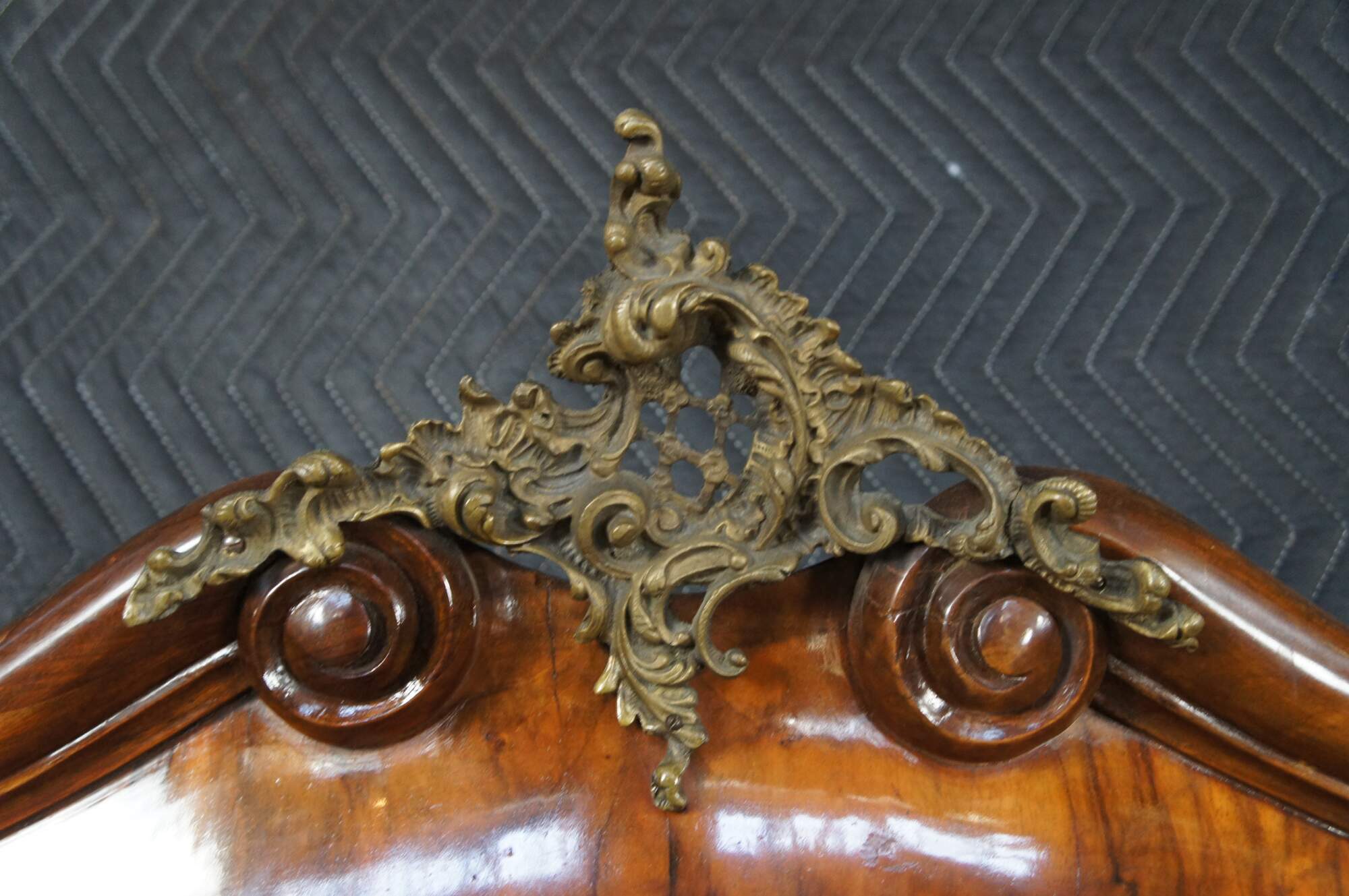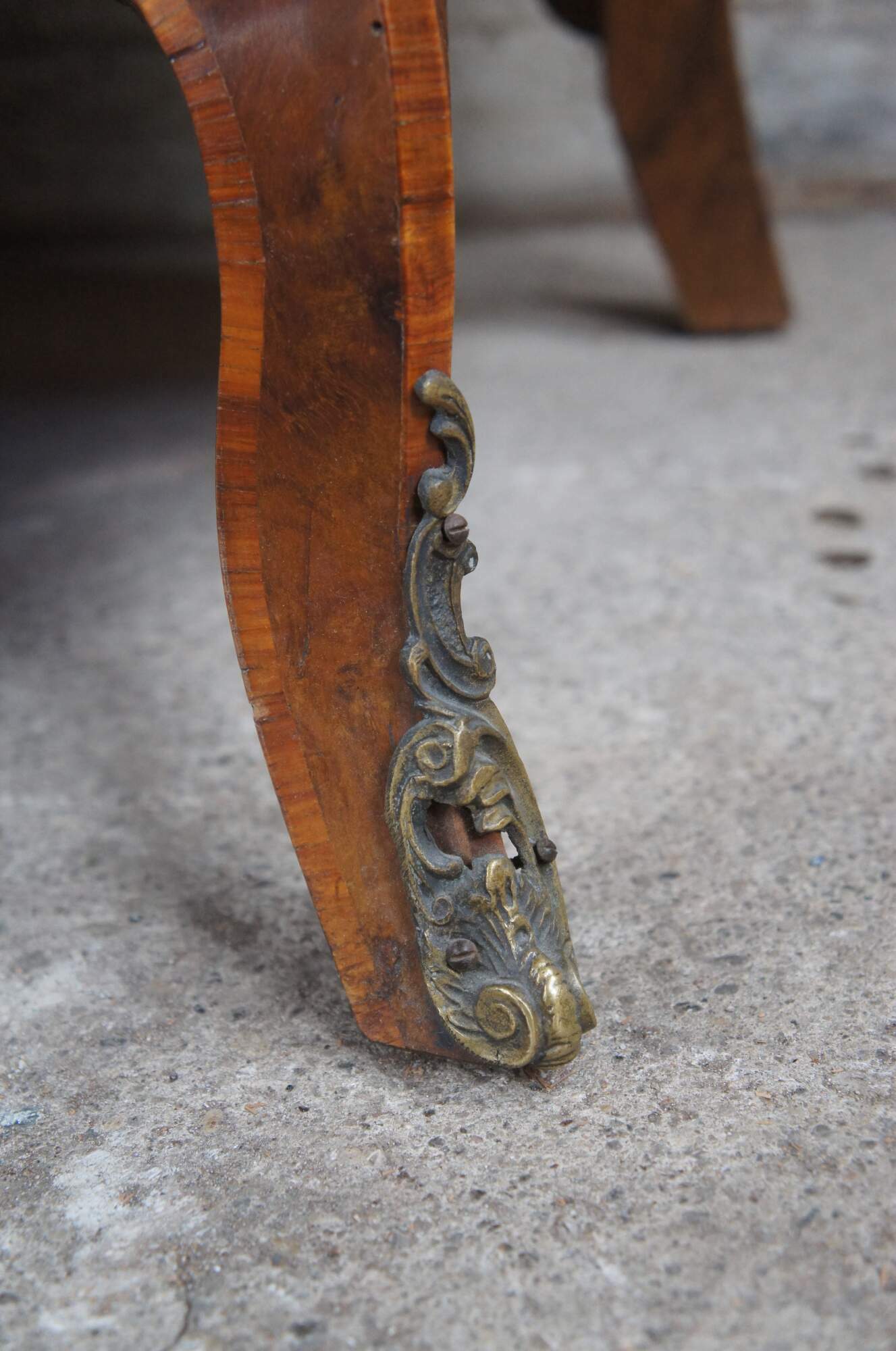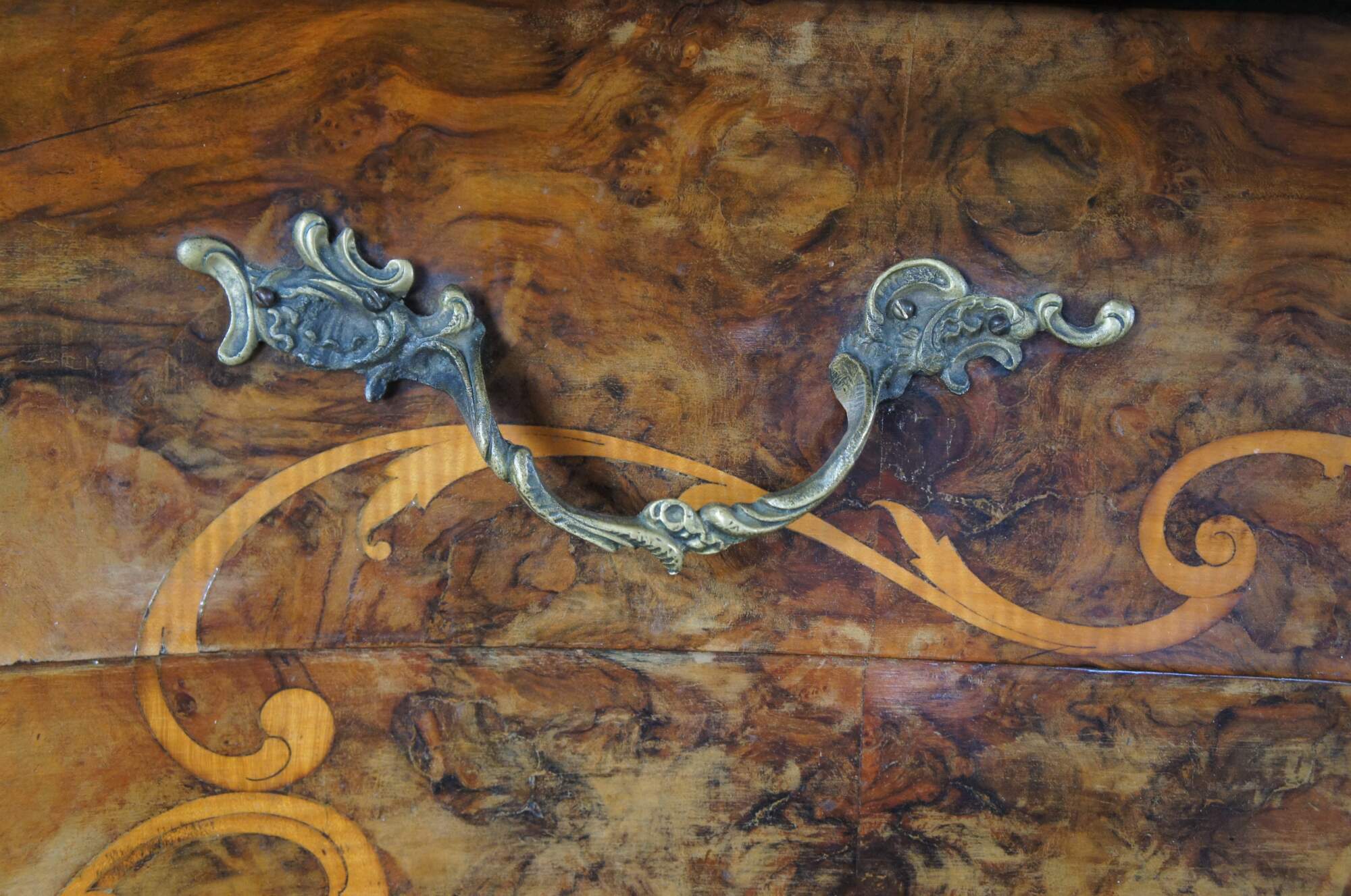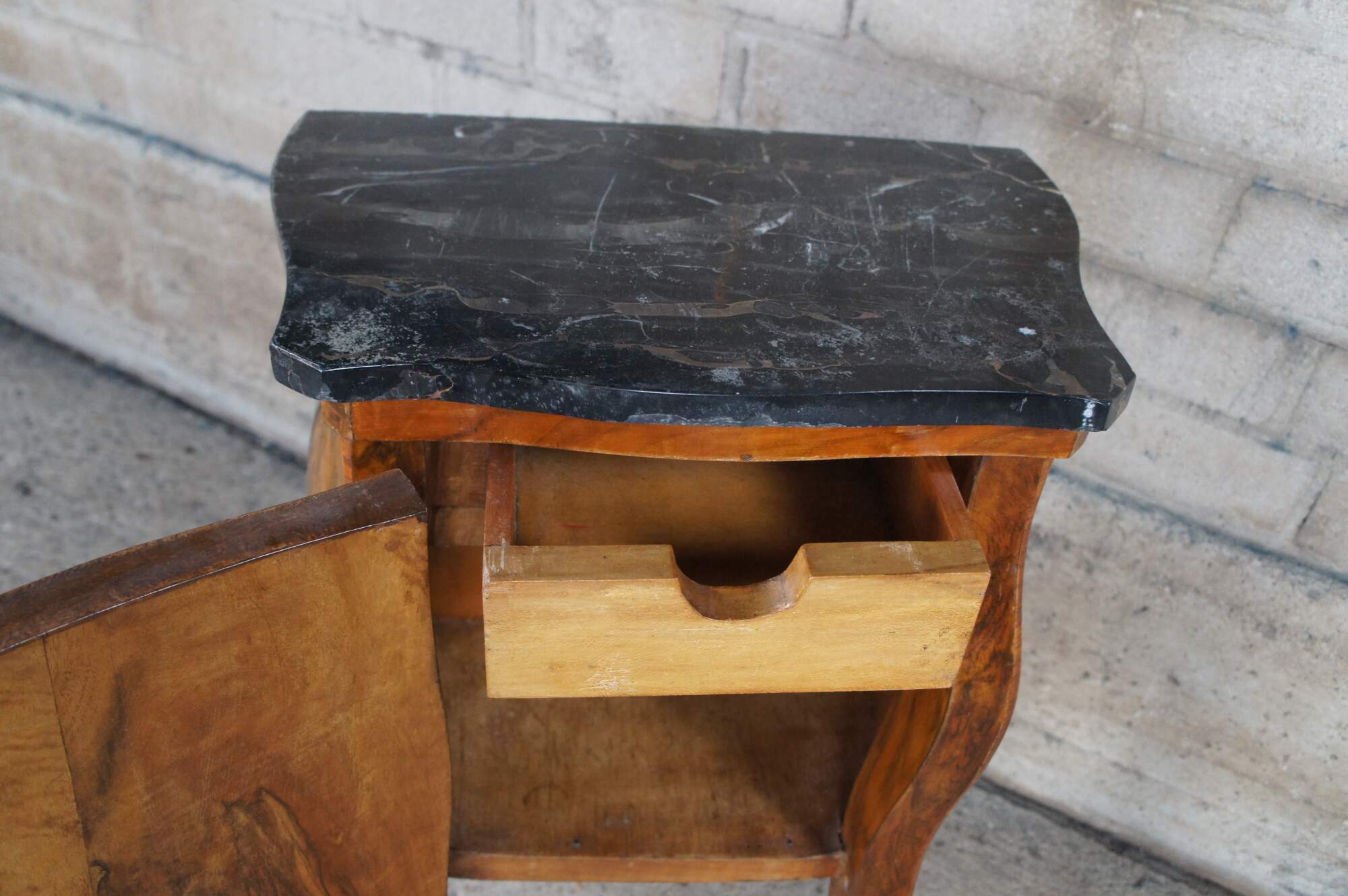 Made of highly sought-after matchbook burled Circassian walnut with gray marble tops. Features serpentine form with flowing floral marquetry inlay ornate bronze ormolu and cabriole legs. A stately addition to any space.