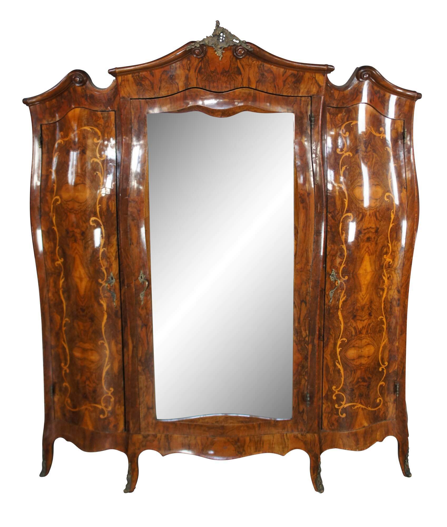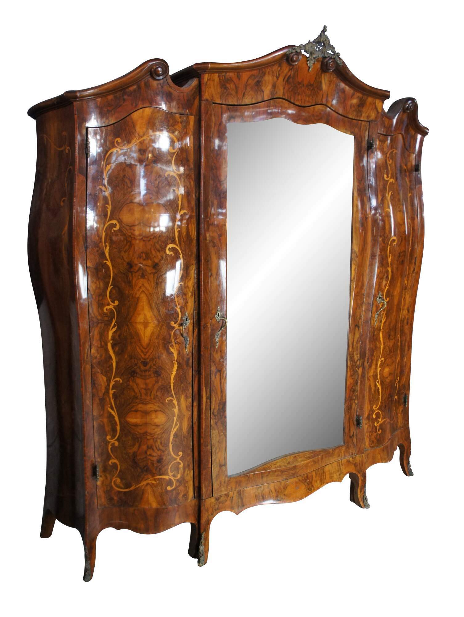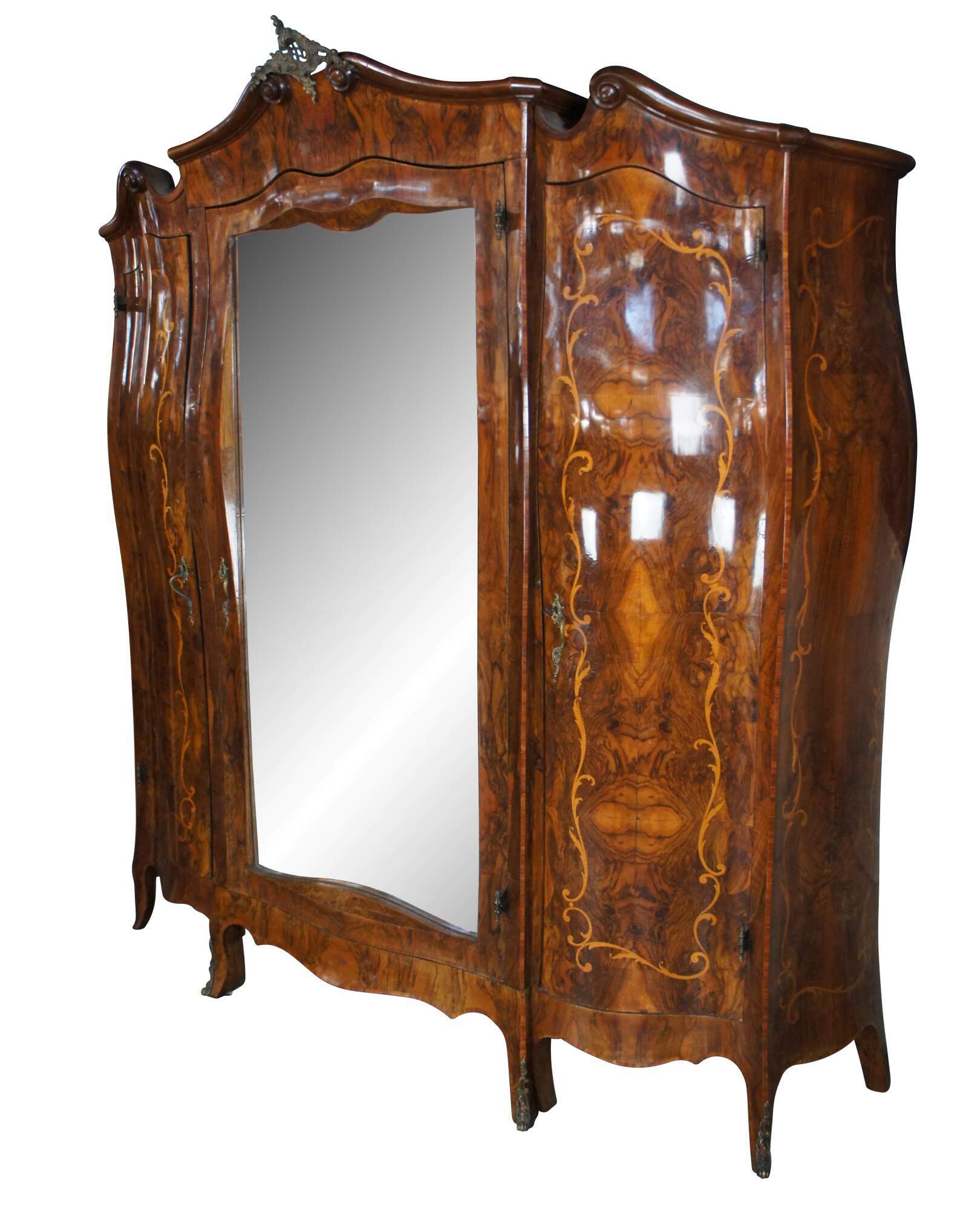 Rare and impressive monumental Antique 19th century Italian Baroque Rococo Bombe bedroom suite, circa 1870s. Features a large full length armoire, dresser with mirror, 2 nightstands, a vanity and 2 small single beds. The beds can be modified and joined to form a King or Queen size bed.