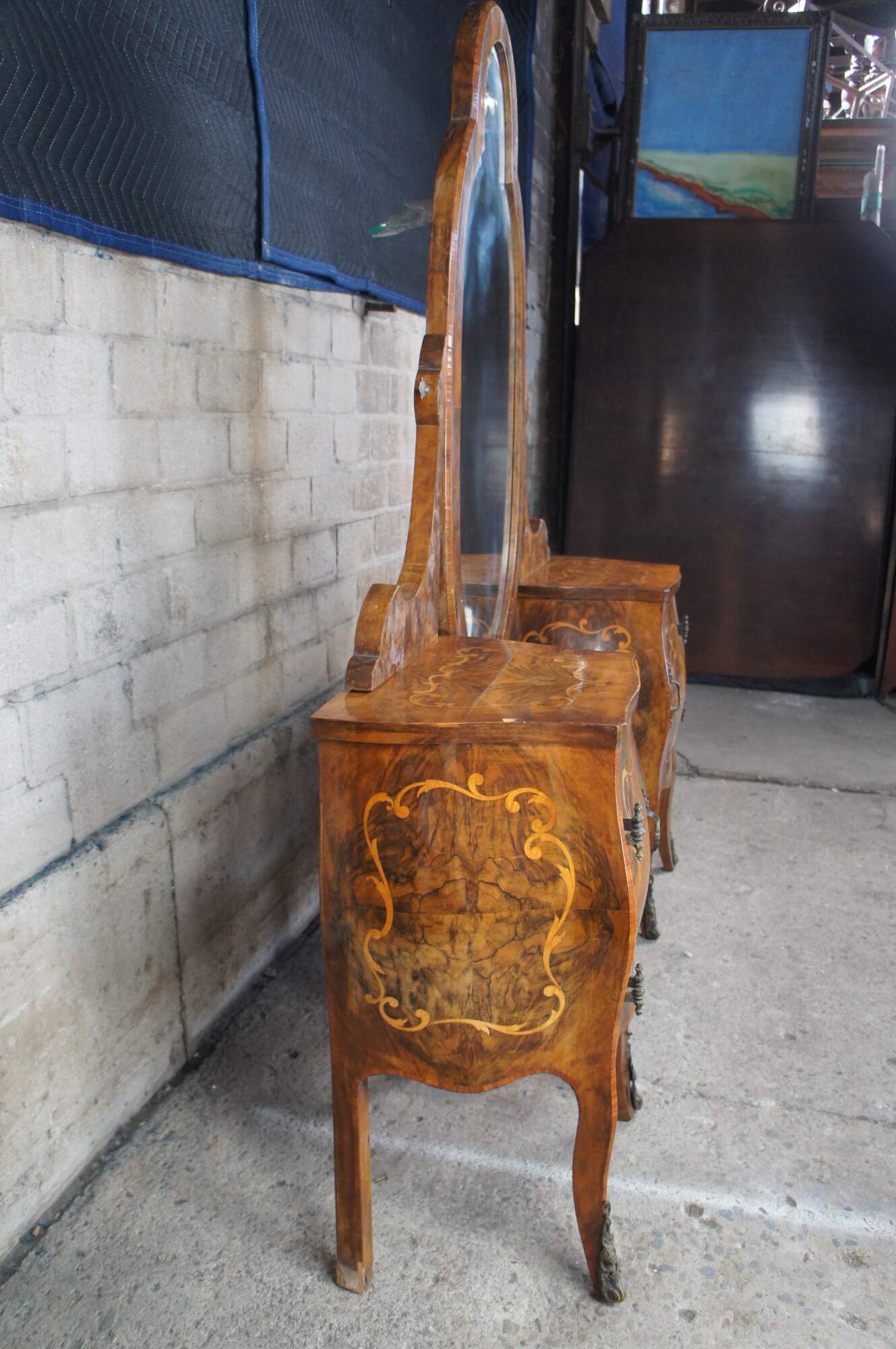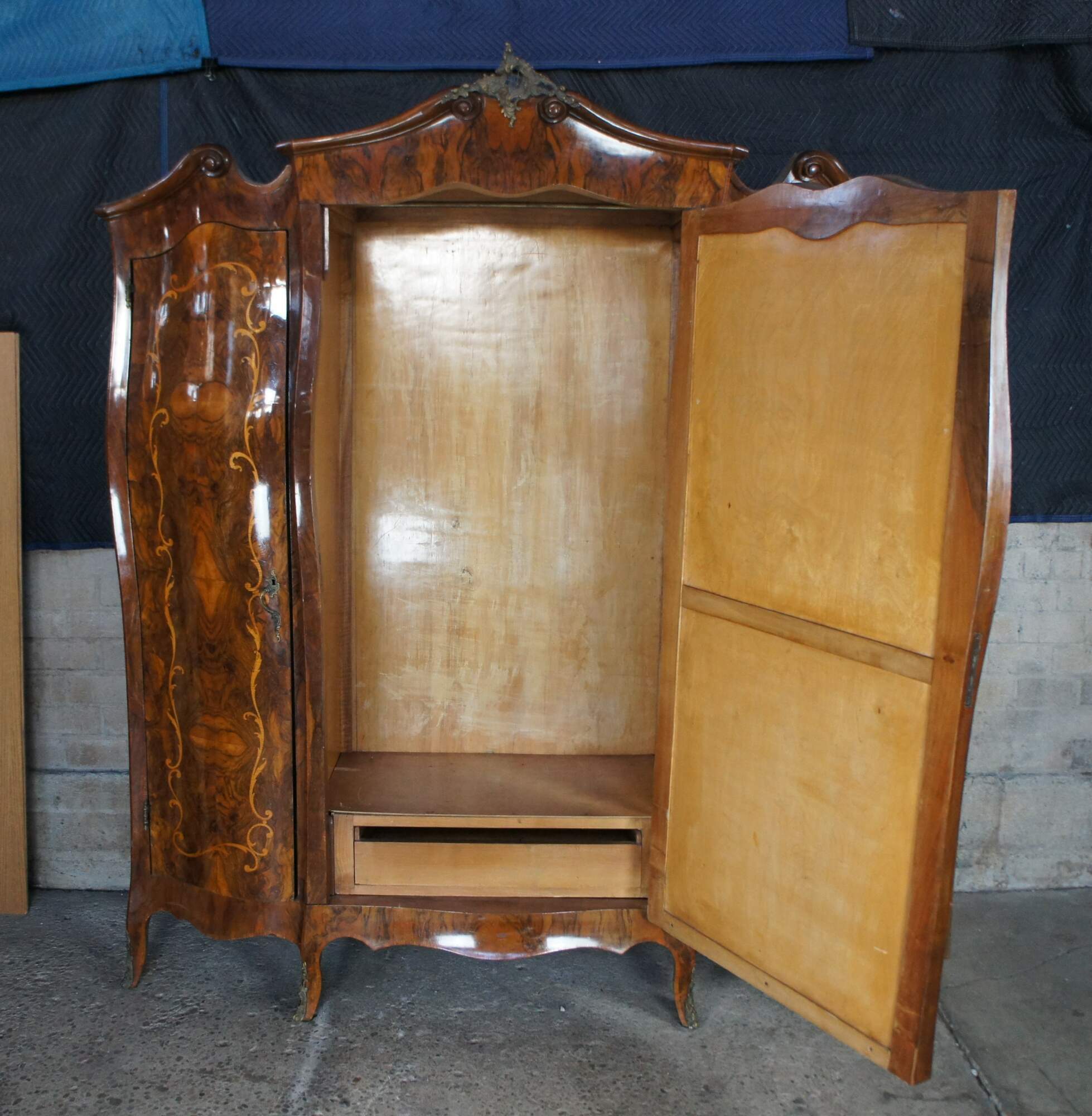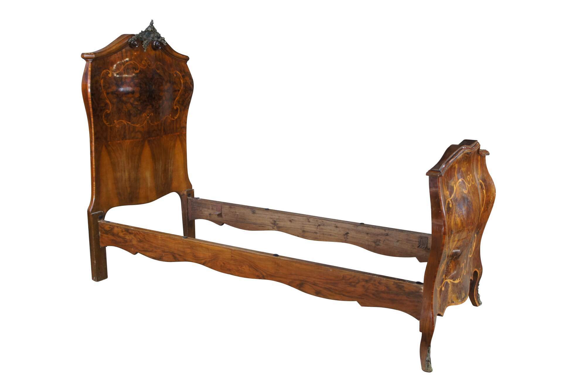 Rare and impressive monumental Antique 19th century Italian Baroque Rococo Bombe bedroom suite, circa 1870s. Features a large full length armoire, dresser with mirror, 2 nightstands, a vanity and 2 small single beds. The beds can be modified and joined to form a King or Queen size bed.