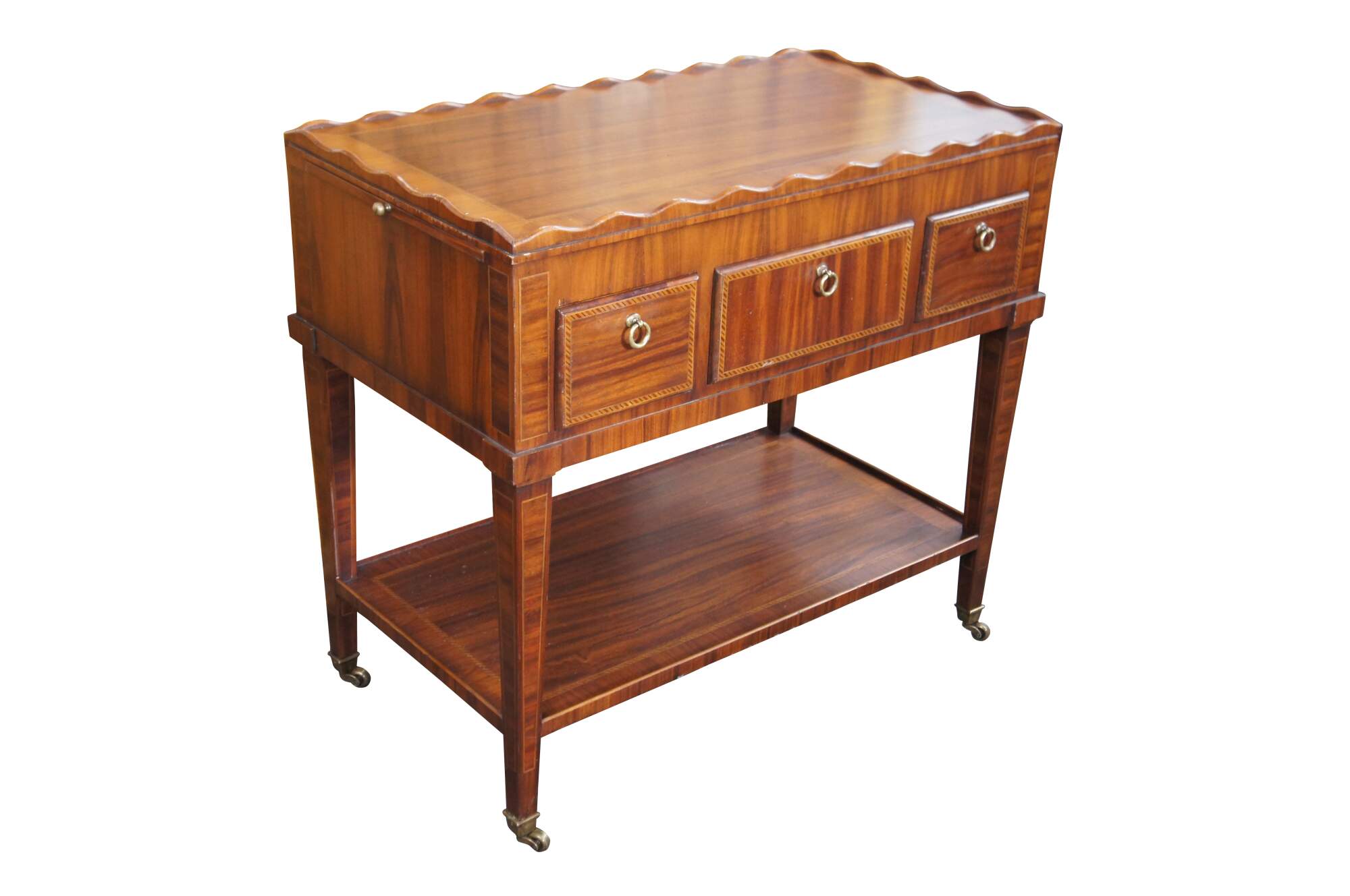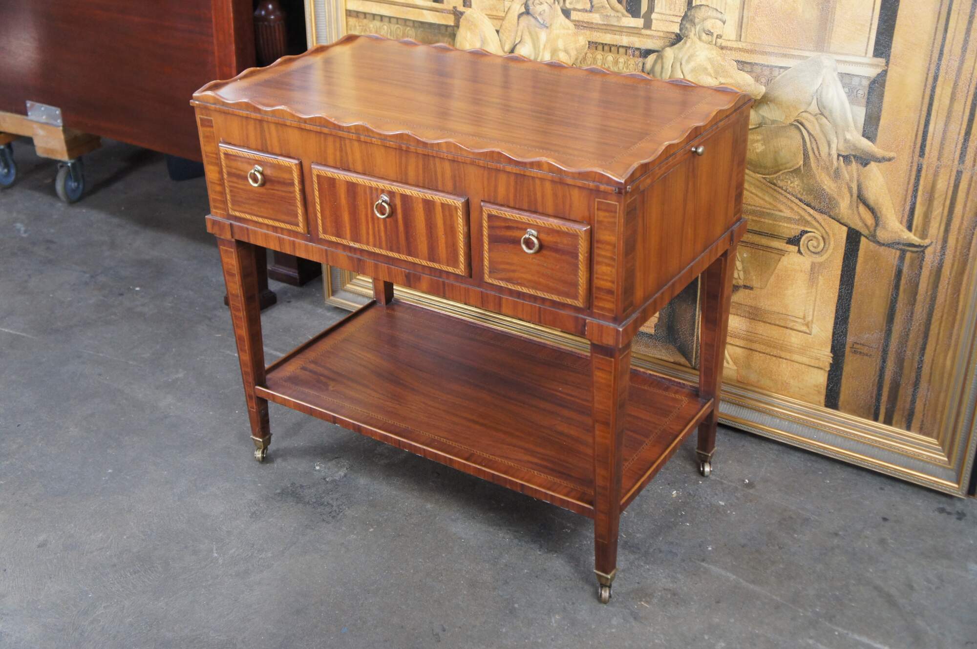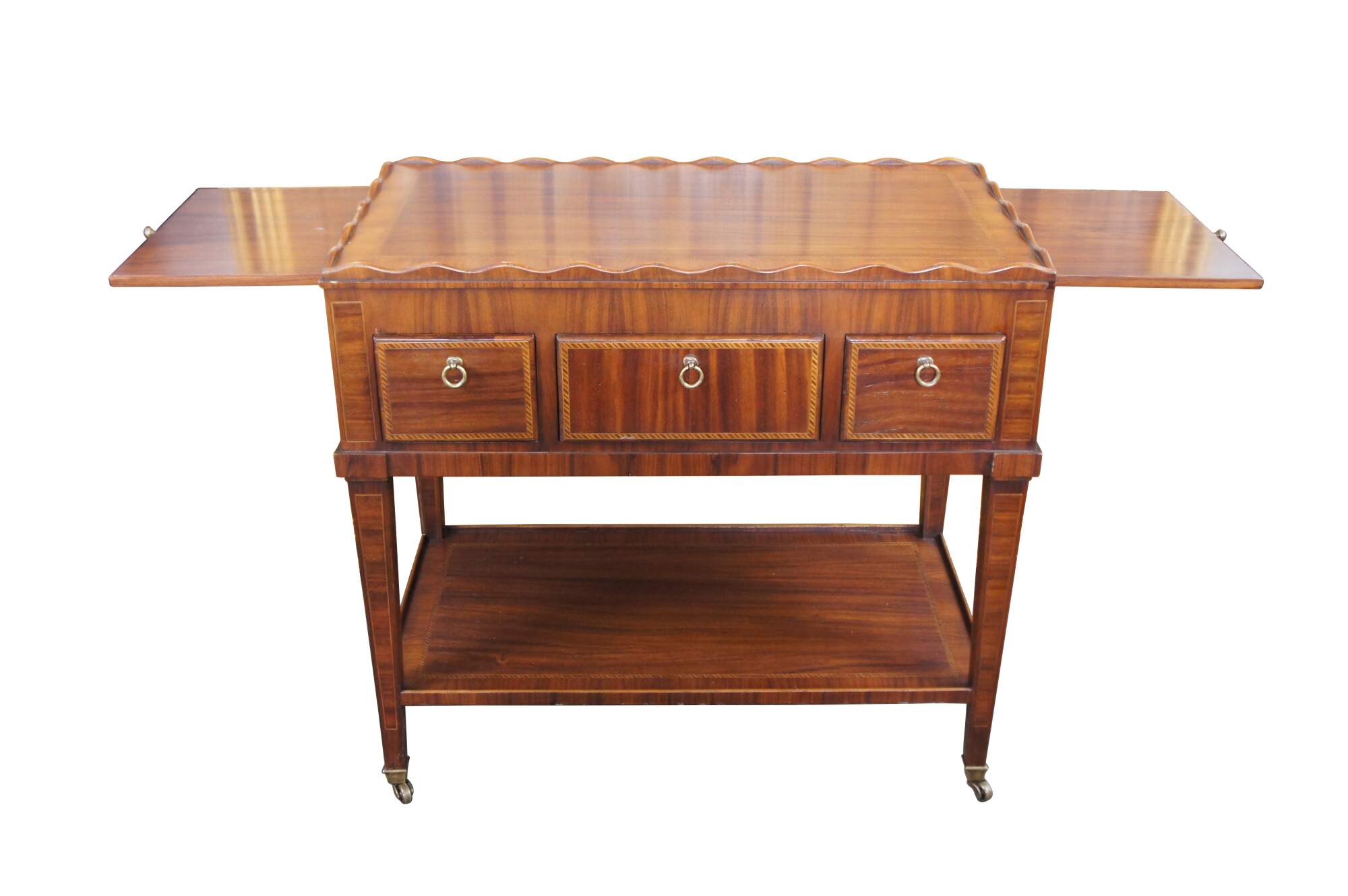 An exquisite early 21st century server by the aclaimed Alfonso Marina, circa 2006. Features a Georgian style rectangular frame made from rosewood with rope twisted marquetry inlay. Includes a serpentine gallery, side pullout trays and three dovetailed drawers for additional storage. The server is supported by square tapered legs wit brass casters for ease of rolling. Marked along underside. Server Rivoli, 909/06, Jun 5th, 2006.