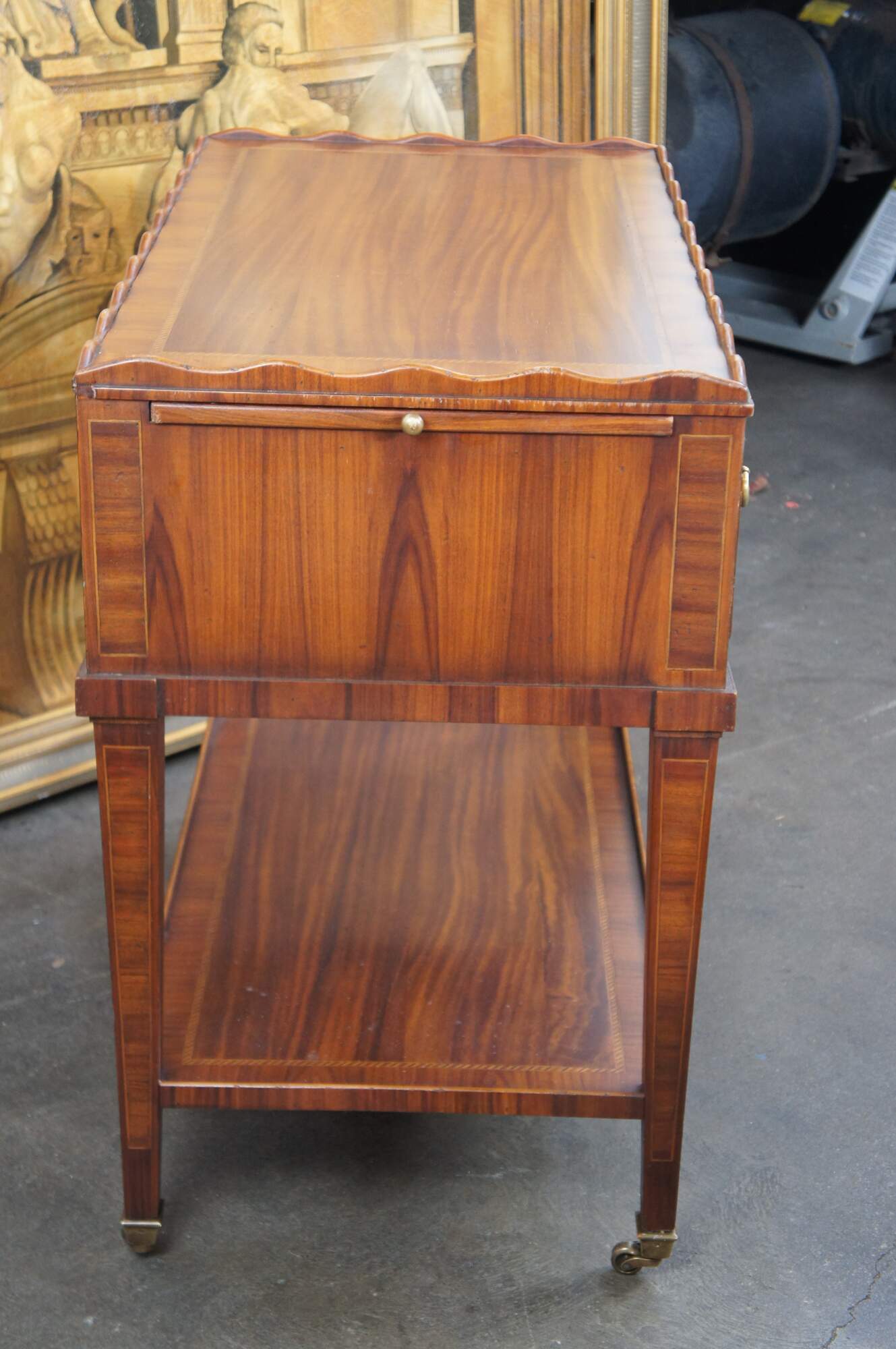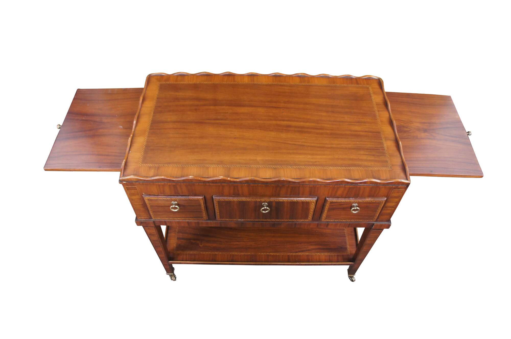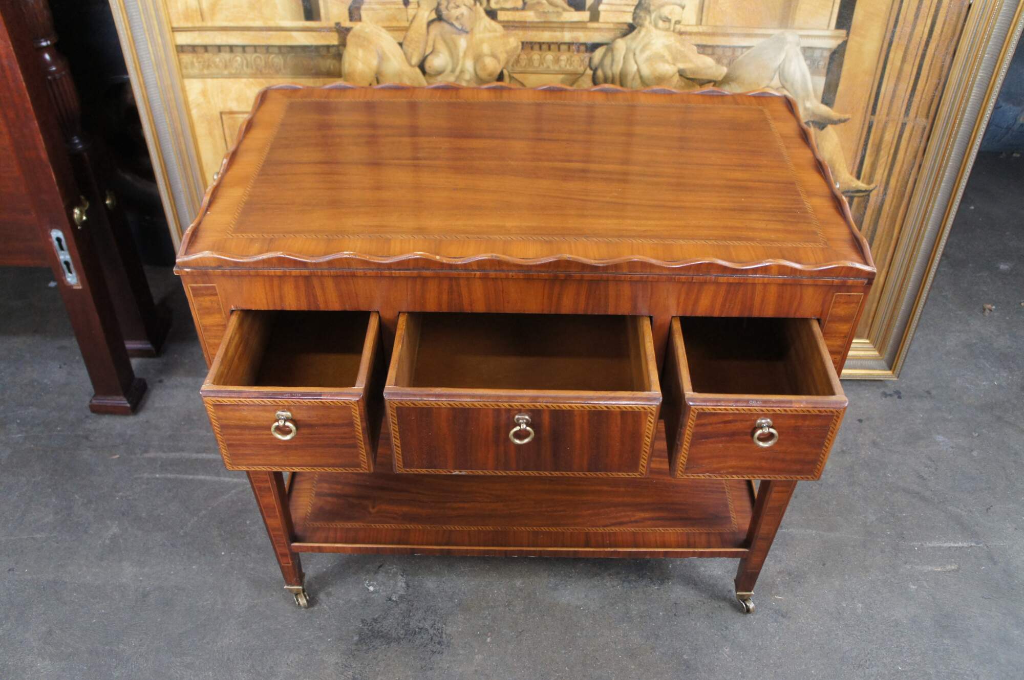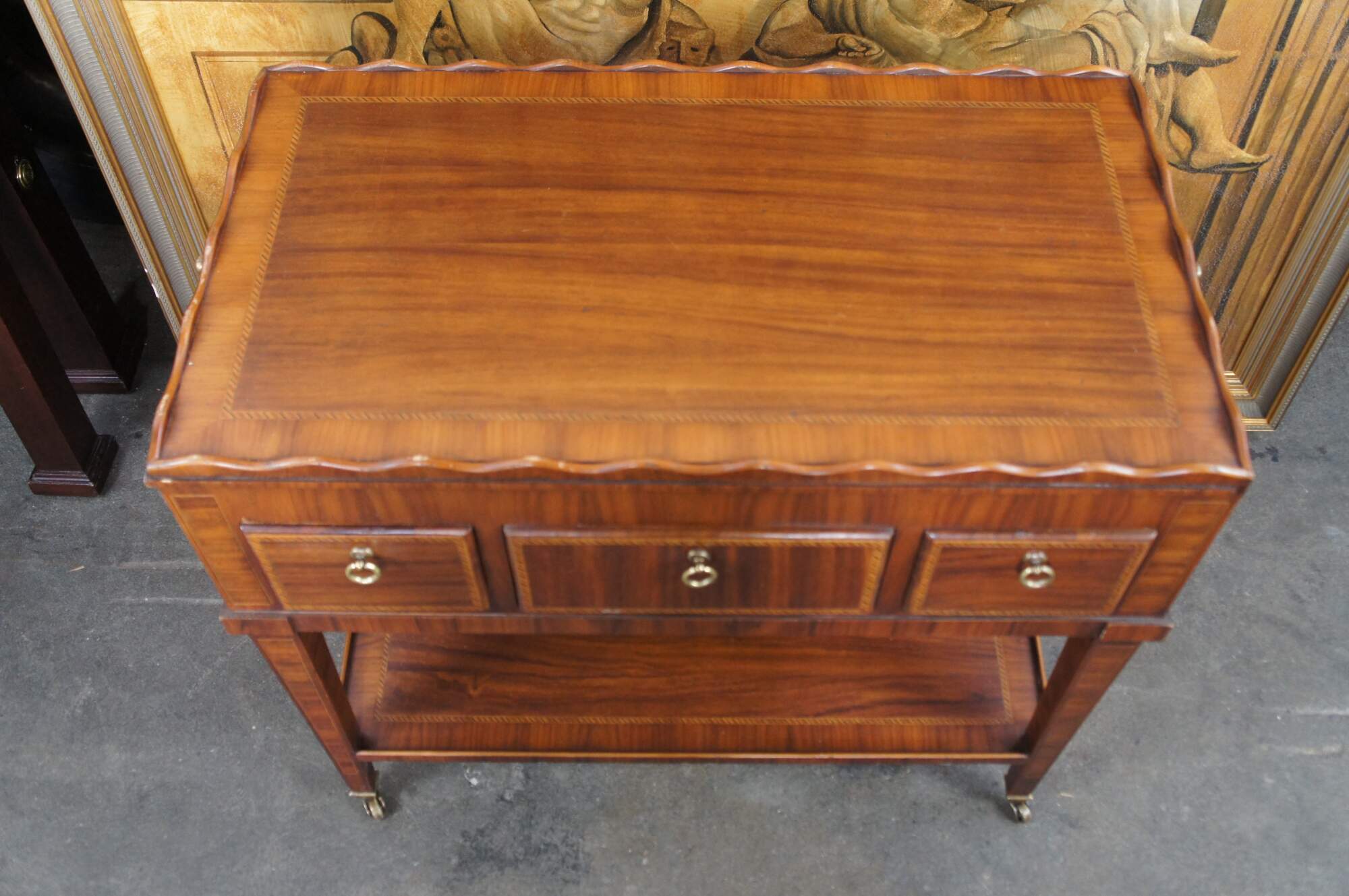An exquisite early 21st century server by the aclaimed Alfonso Marina, circa 2006. Features a Georgian style rectangular frame made from rosewood with rope twisted marquetry inlay. Includes a serpentine gallery, side pullout trays and three dovetailed drawers for additional storage. The server is supported by square tapered legs wit brass casters for ease of rolling. Marked along underside. Server Rivoli, 909/06, Jun 5th, 2006.