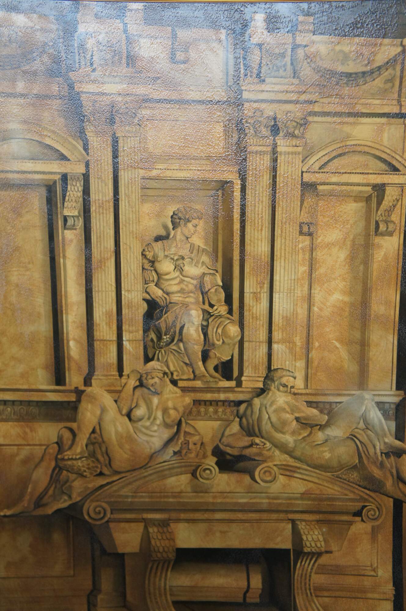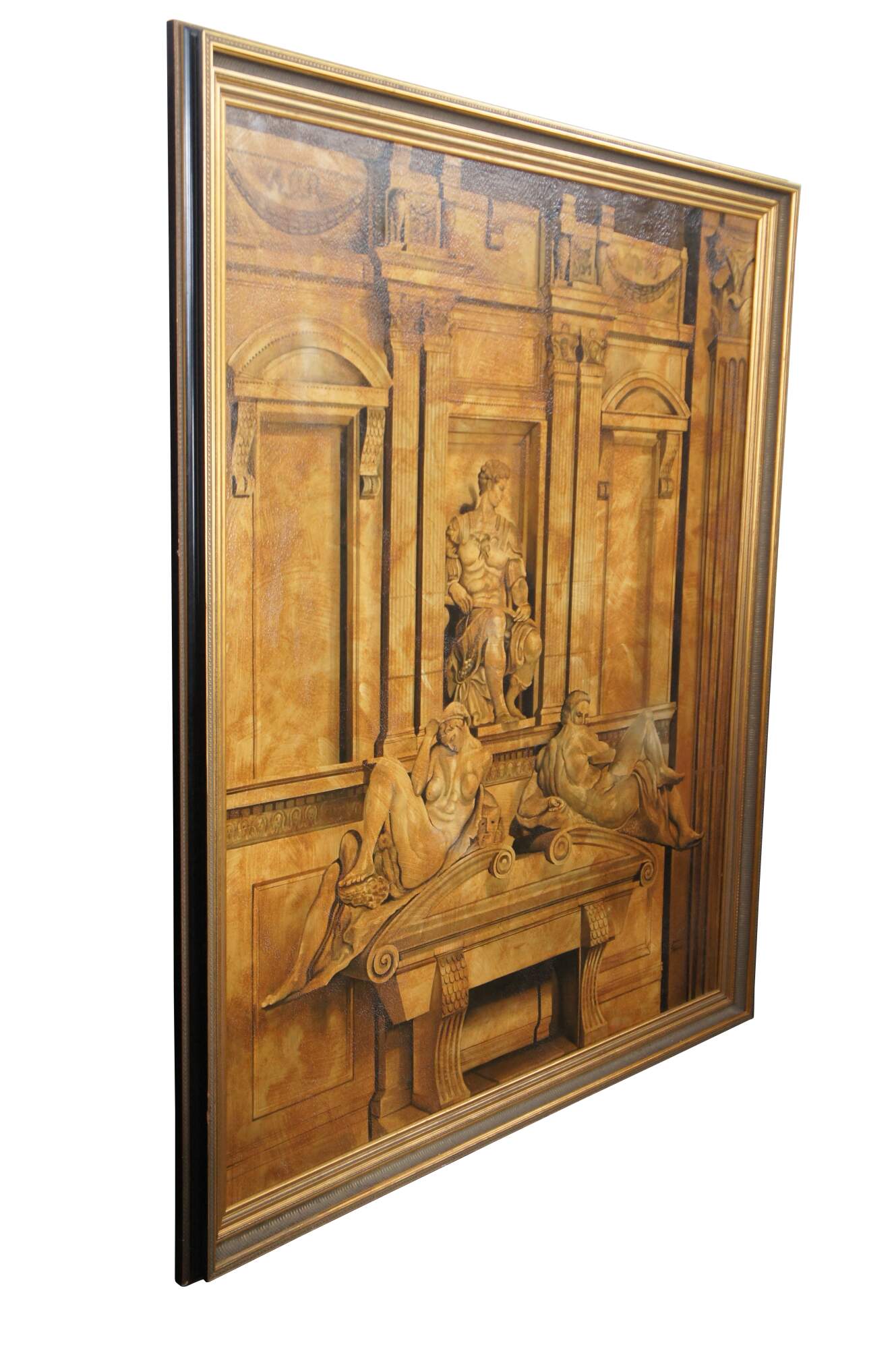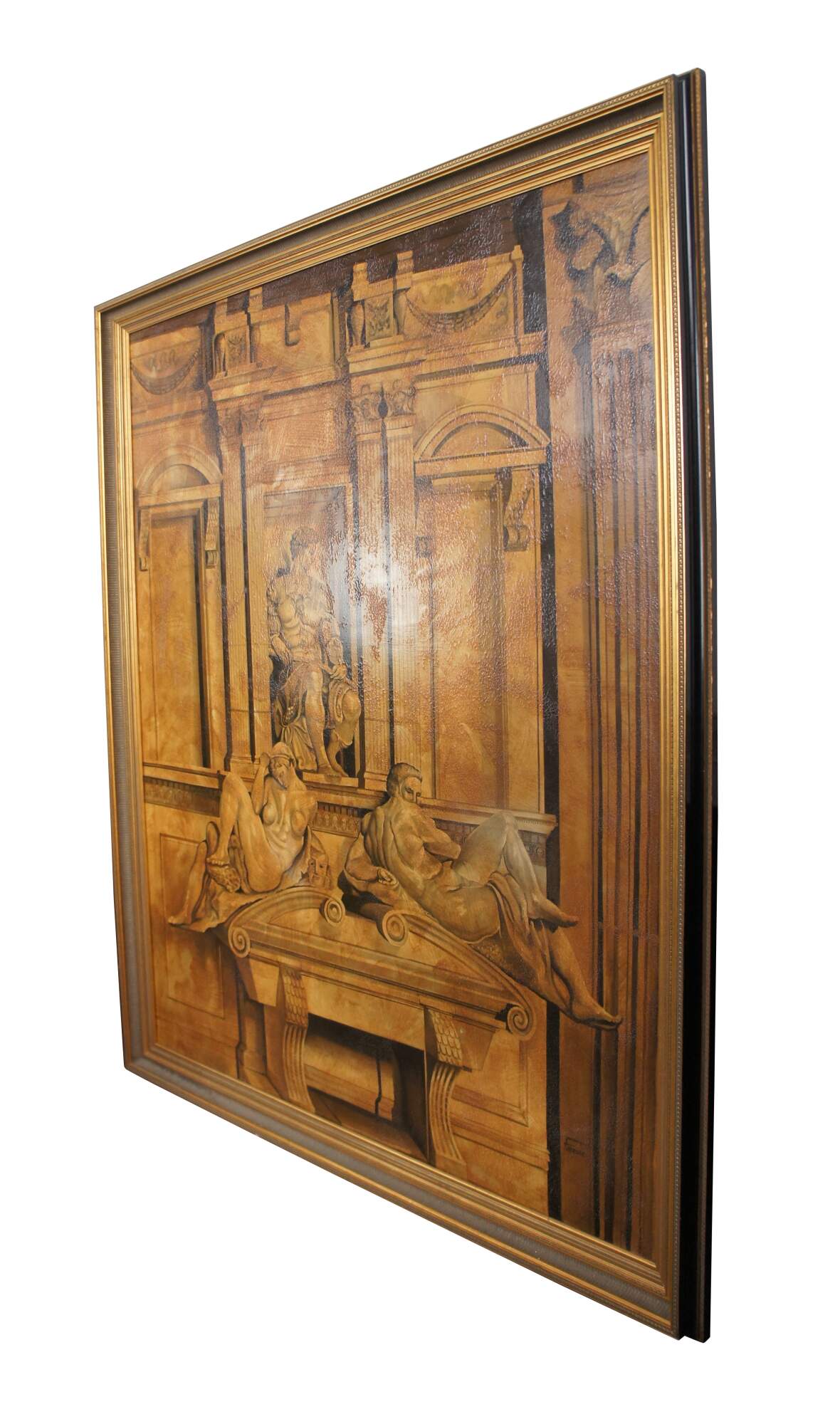 An Italian Renaissance painting after Michelangelo Buonarroti's famous carving at the Tomb of Giuliano de’ Medici. The tomb of Giuliano de' Medici is the companion to the tomb of Lorenzo, and stands on the opposite side of the altar which separates them. This illustration shows the entire work, the statue being in the niche above, and the sarcophagus standing below with two reclining figures on it. The painting is signed Ferrore.