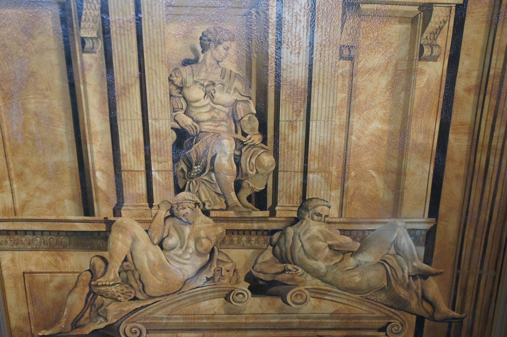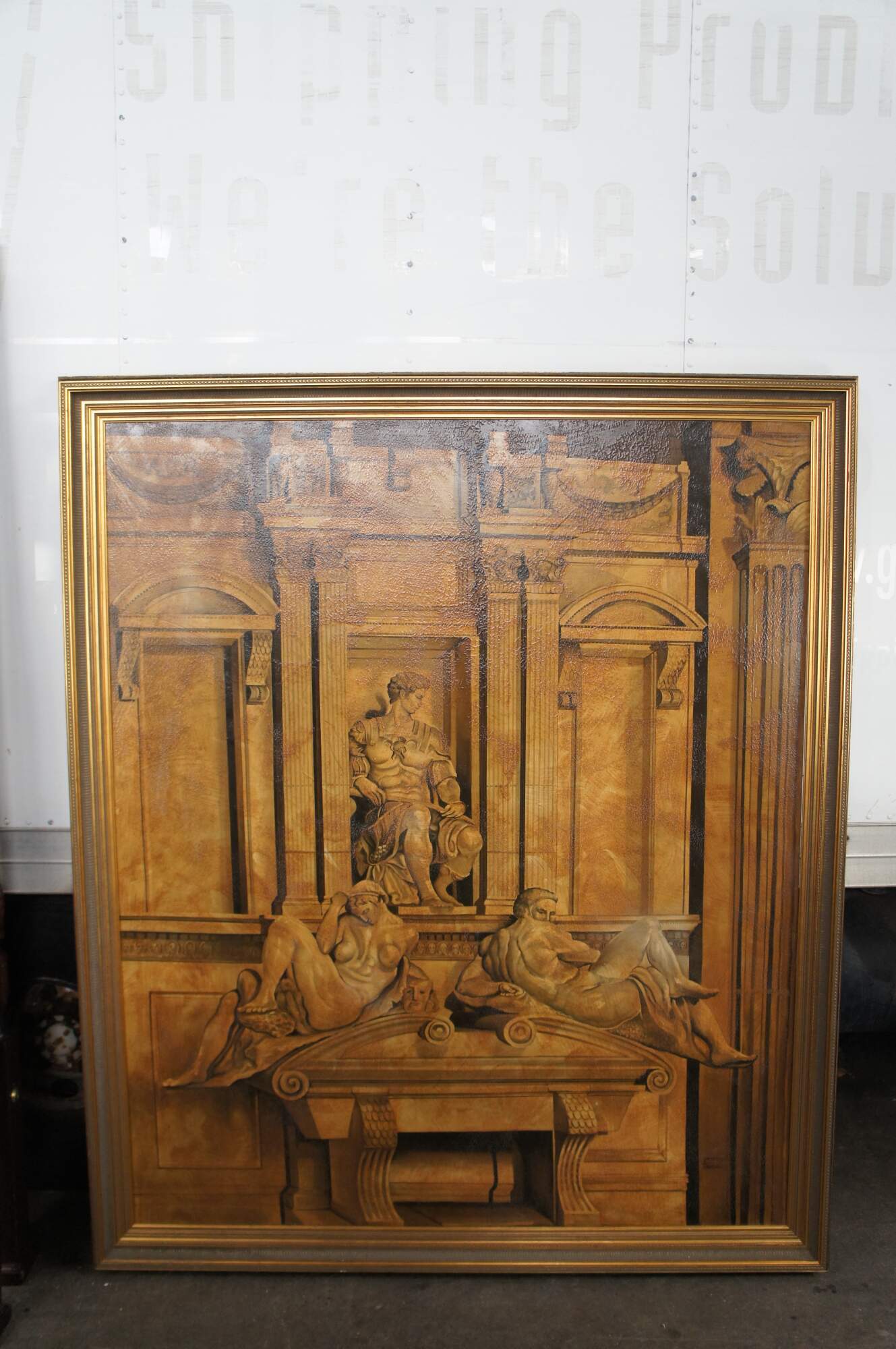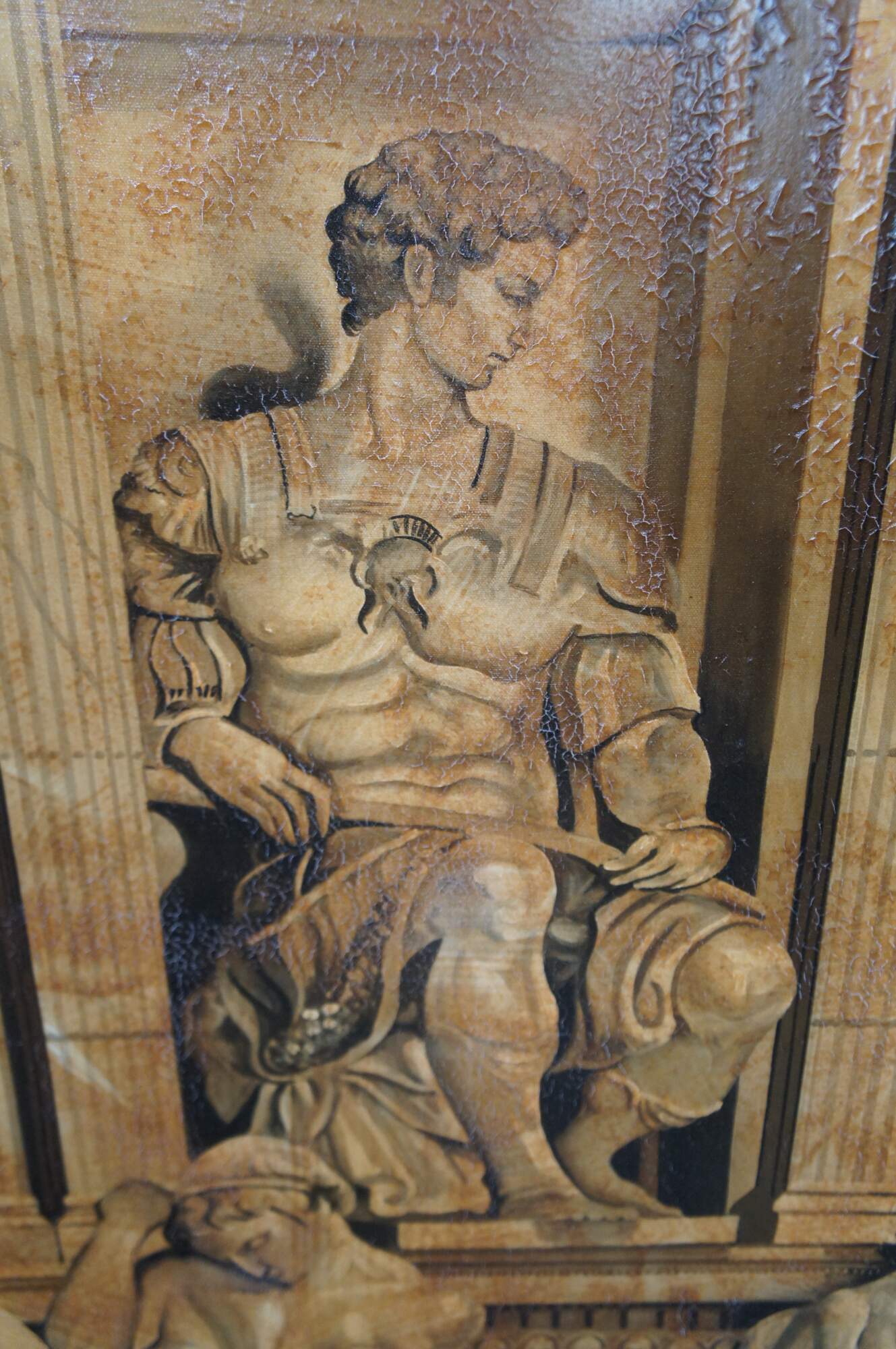 An Italian Renaissance painting after Michelangelo Buonarroti's famous carving at the Tomb of Giuliano de’ Medici. The tomb of Giuliano de' Medici is the companion to the tomb of Lorenzo, and stands on the opposite side of the altar which separates them. This illustration shows the entire work, the statue being in the niche above, and the sarcophagus standing below with two reclining figures on it. The painting is signed Ferrore.