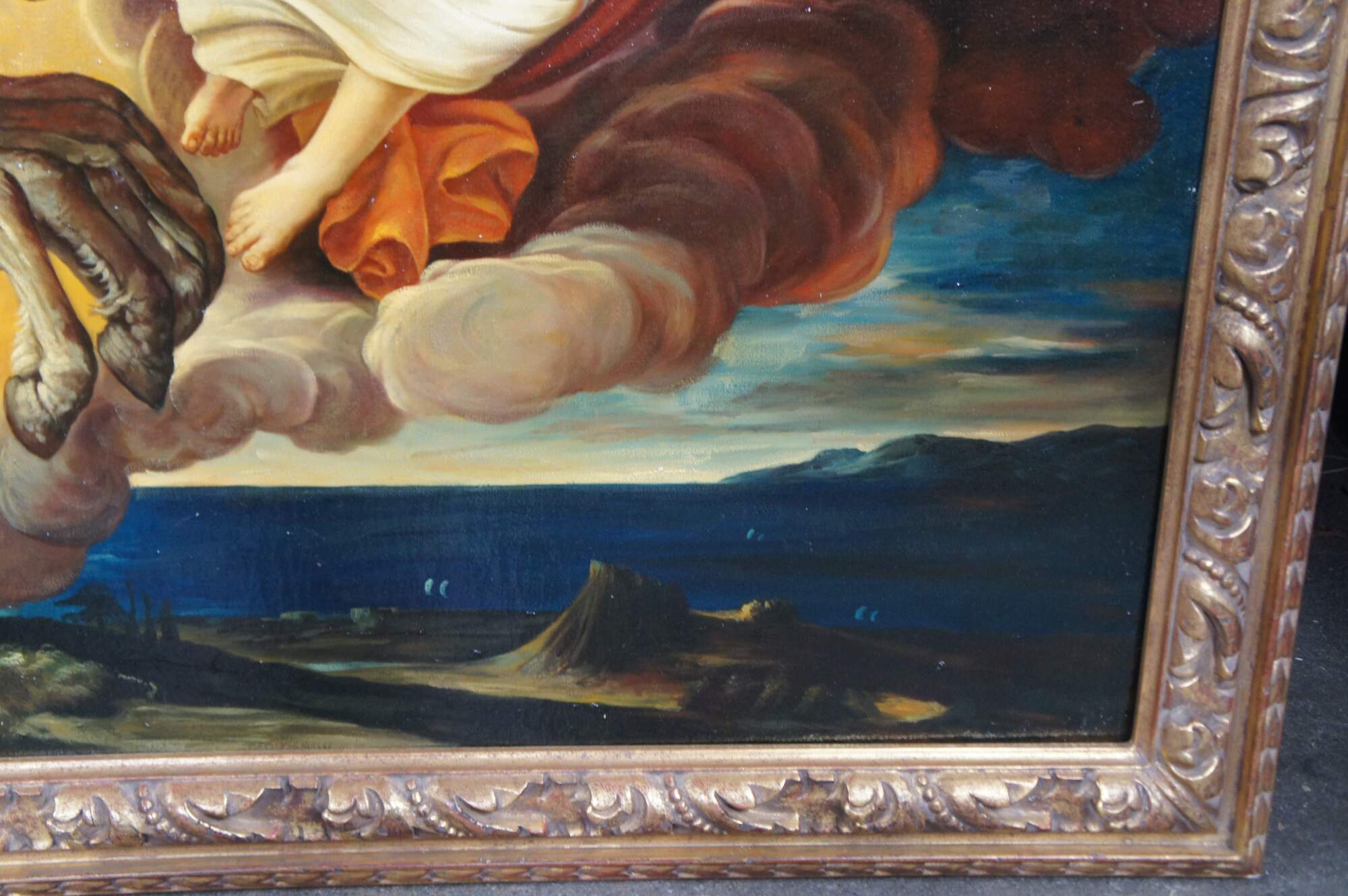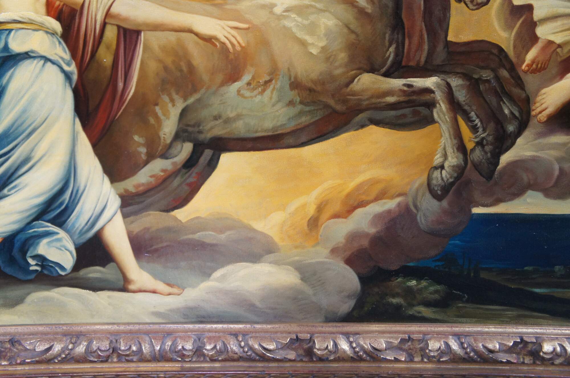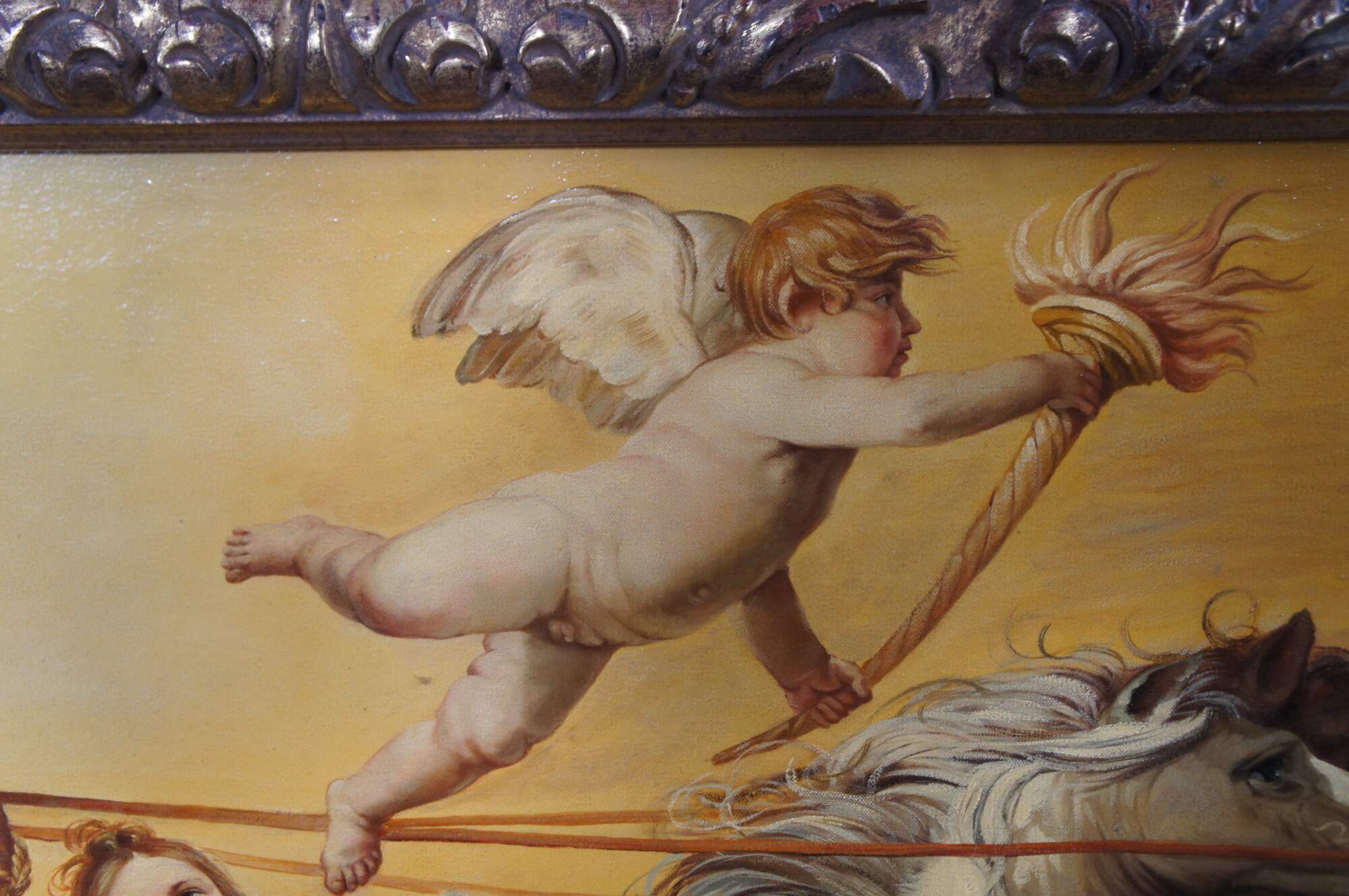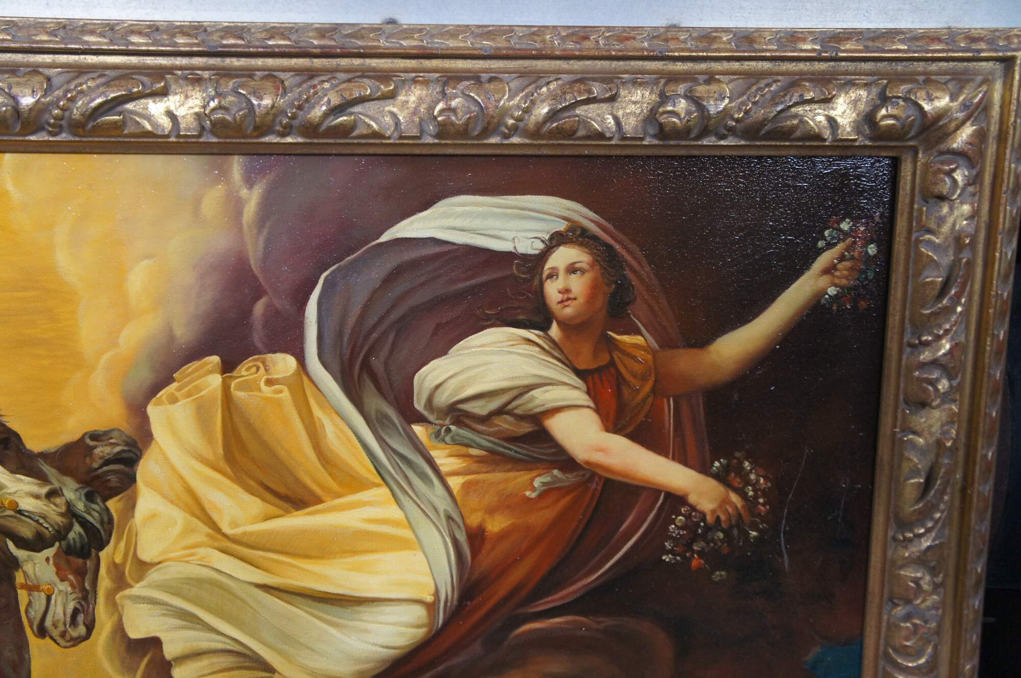 In Greco-Roman mythology, Aurora is the goddess of dawn and the sister of the sun and moon. She is often depicted in art as a beautiful woman with wings, riding a chariot across the sky to announce the start of a new day. The original L'Aurora was painted in 1614 by Guido Reni for the casino, or garden house that was adjacent to the Palazzo Pallavicini-Rospigliosi, in Rome. The original Fresco is 9 feet tall and 23 feet wide. This example dates to the late 20th century and is unsigned. The painting is framed in wood with a low-relief foliate design in gold.