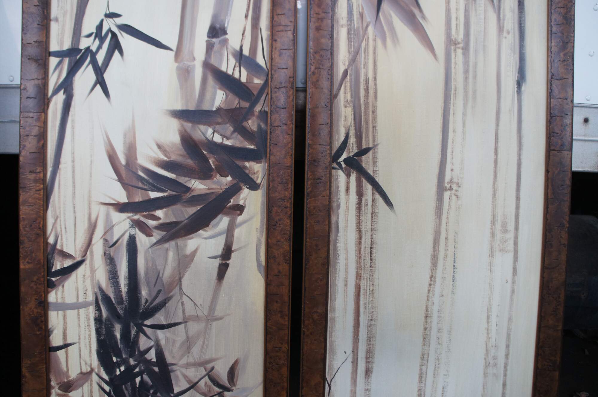 Pair of Bamboo canvas paintings. Each is framed in burlwood and can hang separately or combined to be used as a folding screen or room divider. Each frame has hinges on the outside allowing for them to be used as a traditional folding screen with the addition of a pin.