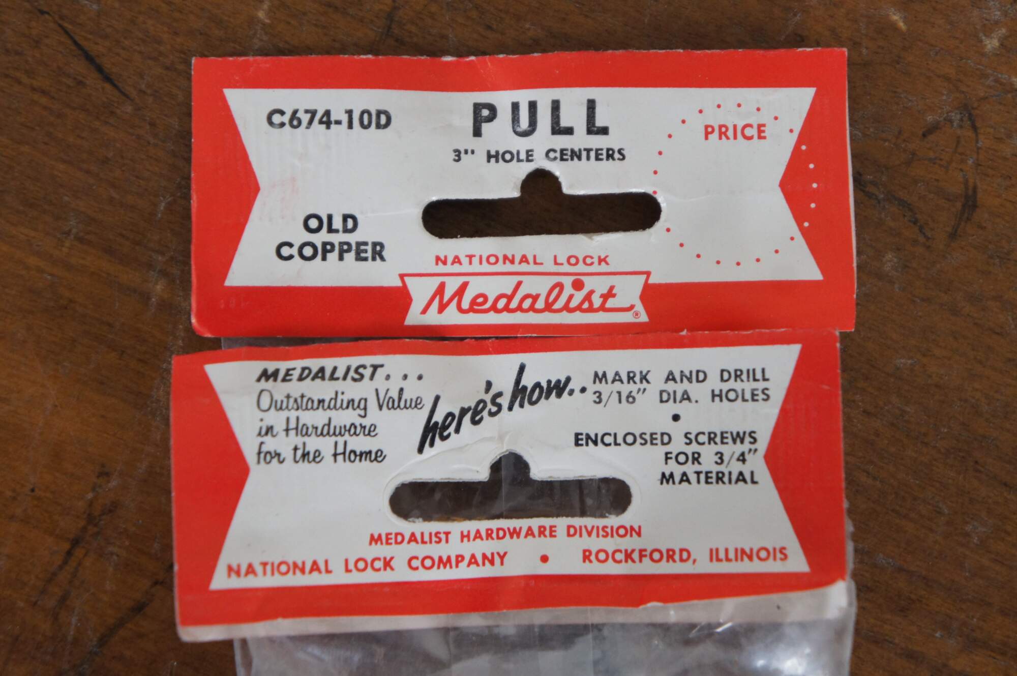 7 Available - Mid to late 20th century old-stock die cast drawer / cabinet pulls. National Lock Company - Medalist, item number C674-10D Pull, Old Copper finish. Curved fixed bail design with ends reminiscent of a leaf and berry. Hole Centers - 3