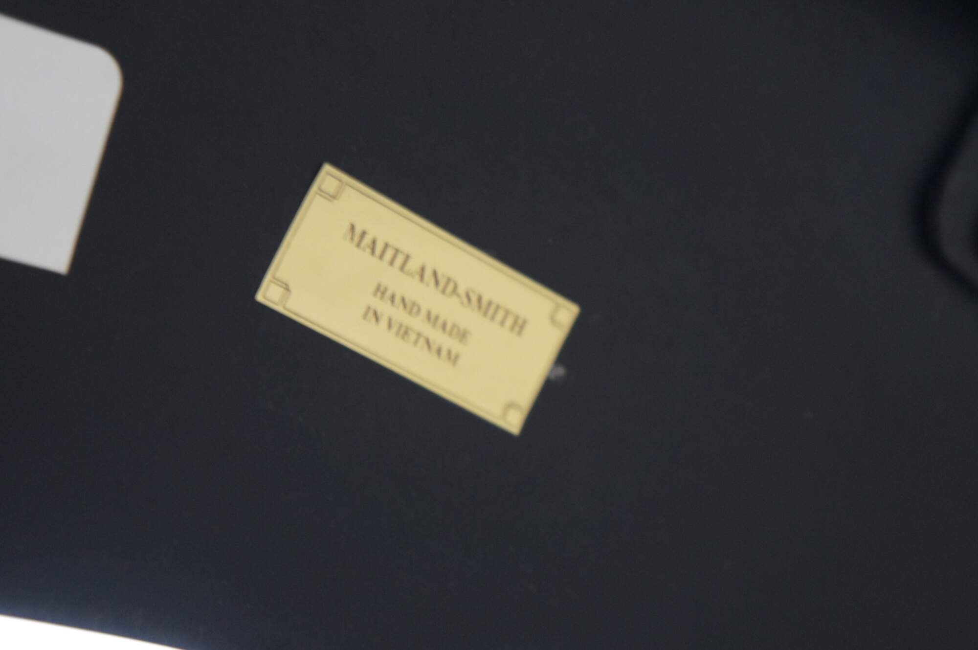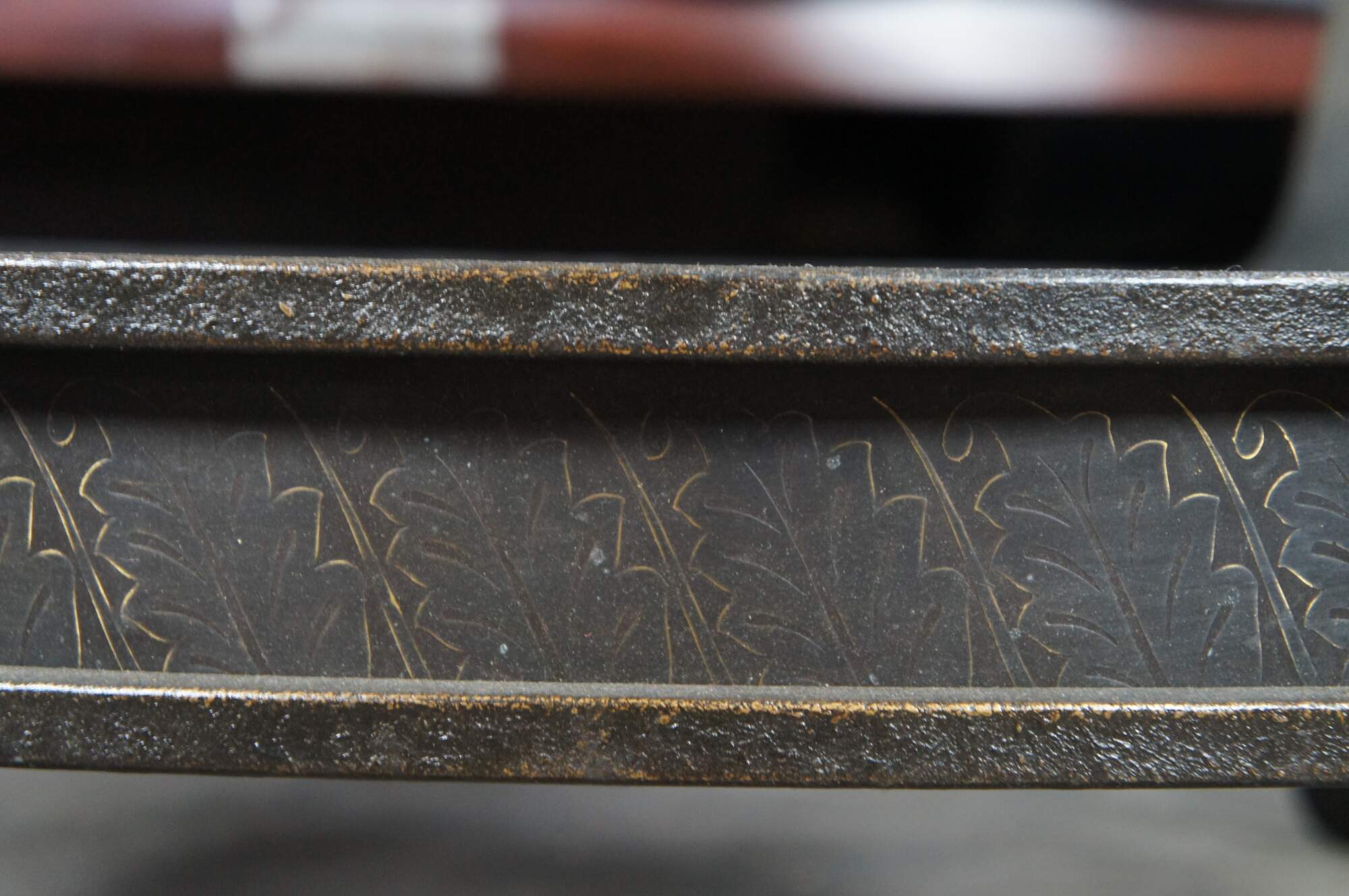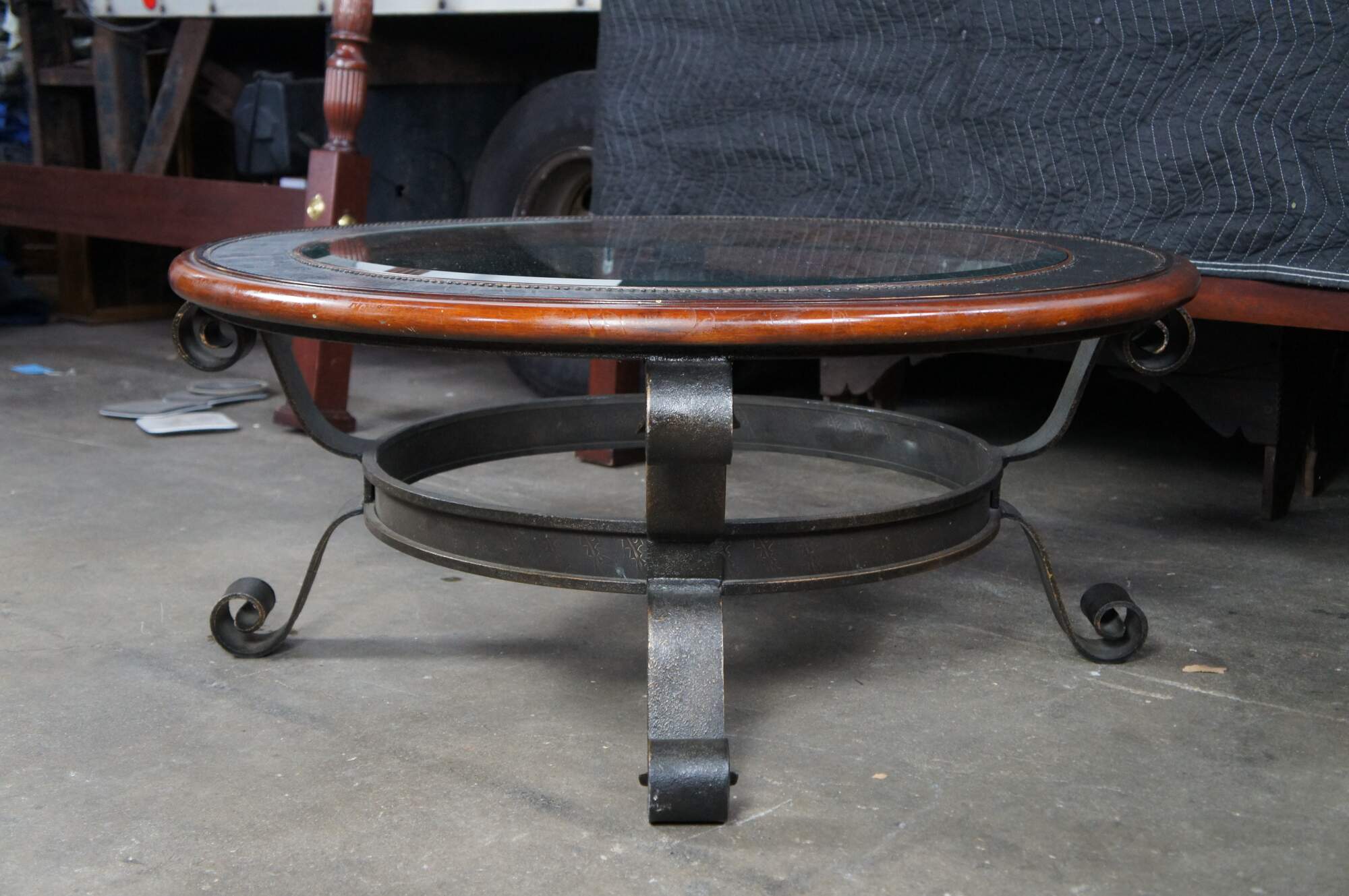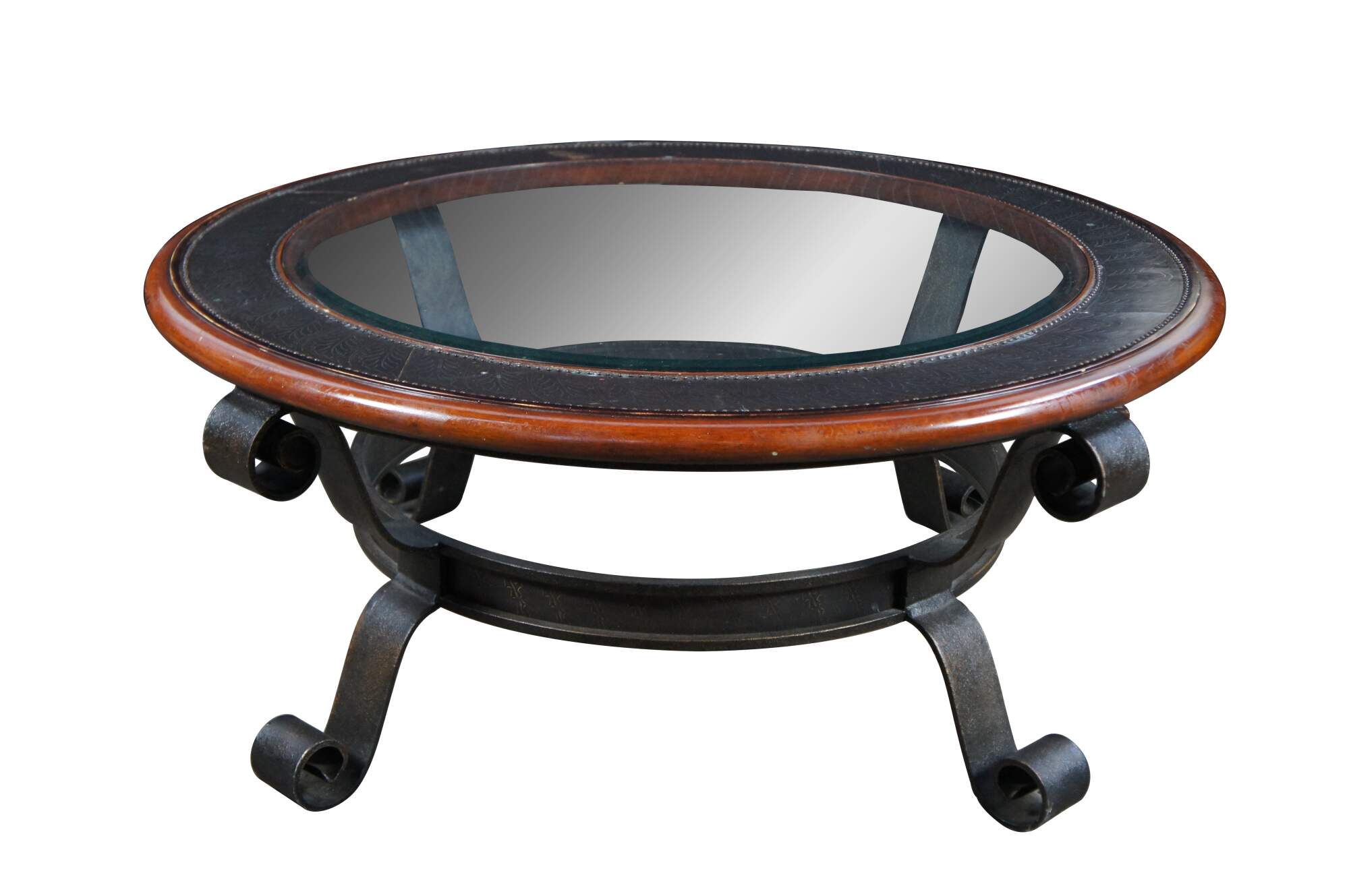An exquisite early 21st-century Maitland Smith modern coffee table. Features a round top made from mahogany and engraved brass with a beveled glass center. The top is supported by a scrolled iron base. The table is accented by engraved brass along the top with a beautiful leaf motif centered between a riveted edge. This motif is also displayed along the round iron band of the base. An exceptional design lending a blend of rustic, modern, Spanish, and contemporary styling.