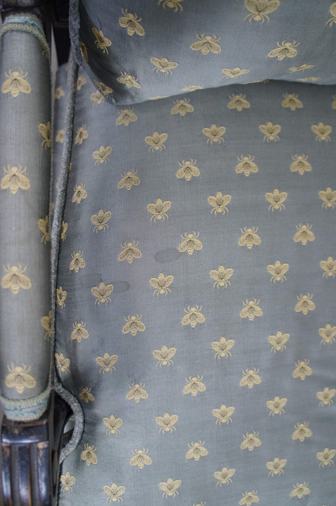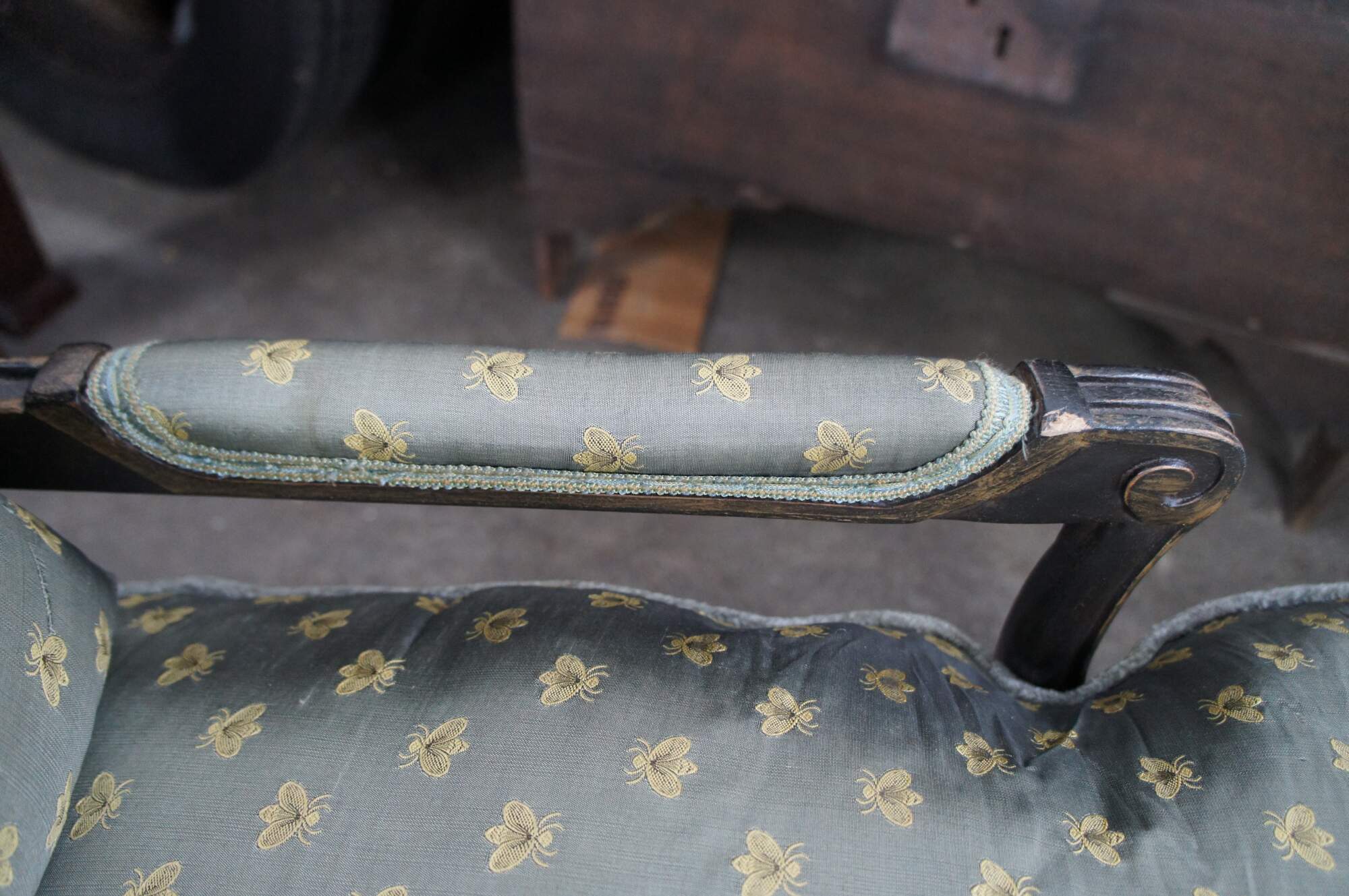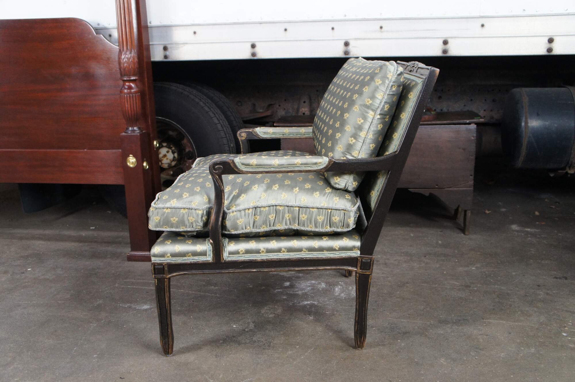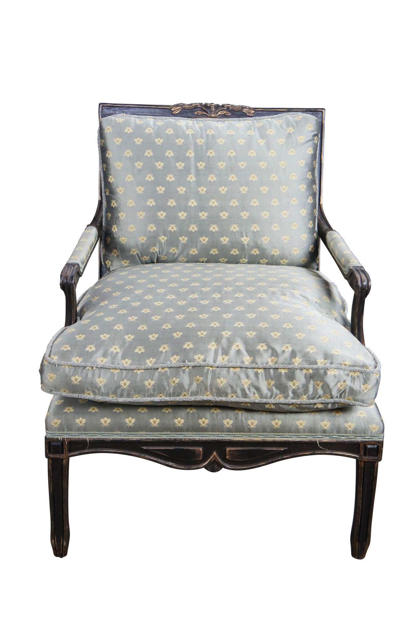 Early 21st Century Minton Spidell Cressant French Louis XVI Fauteuil Arm Chair. Features an ebonized frame with gold accents. The seat and cushions are upholstered in Scalamandre silk with a bee pattern.