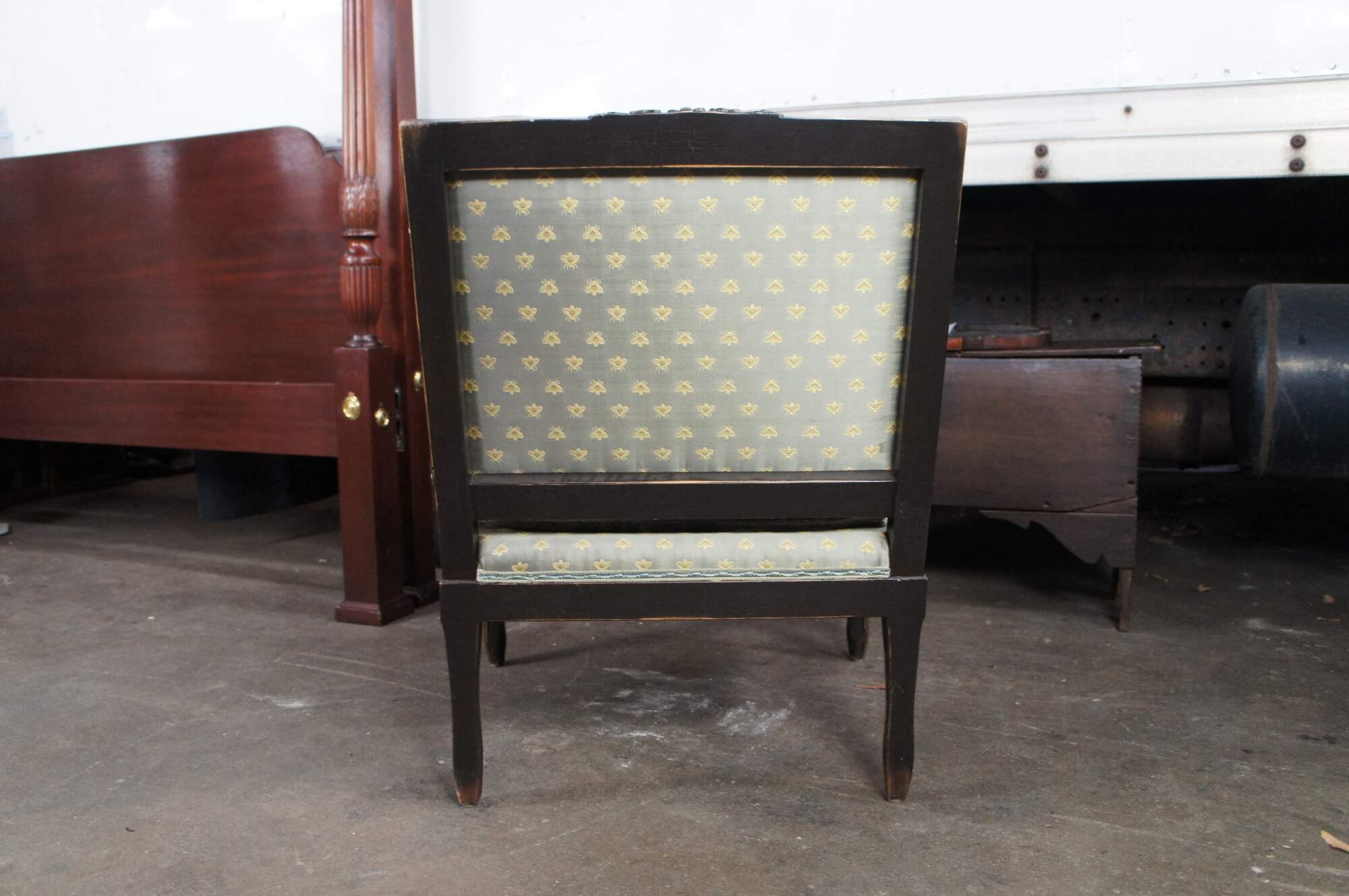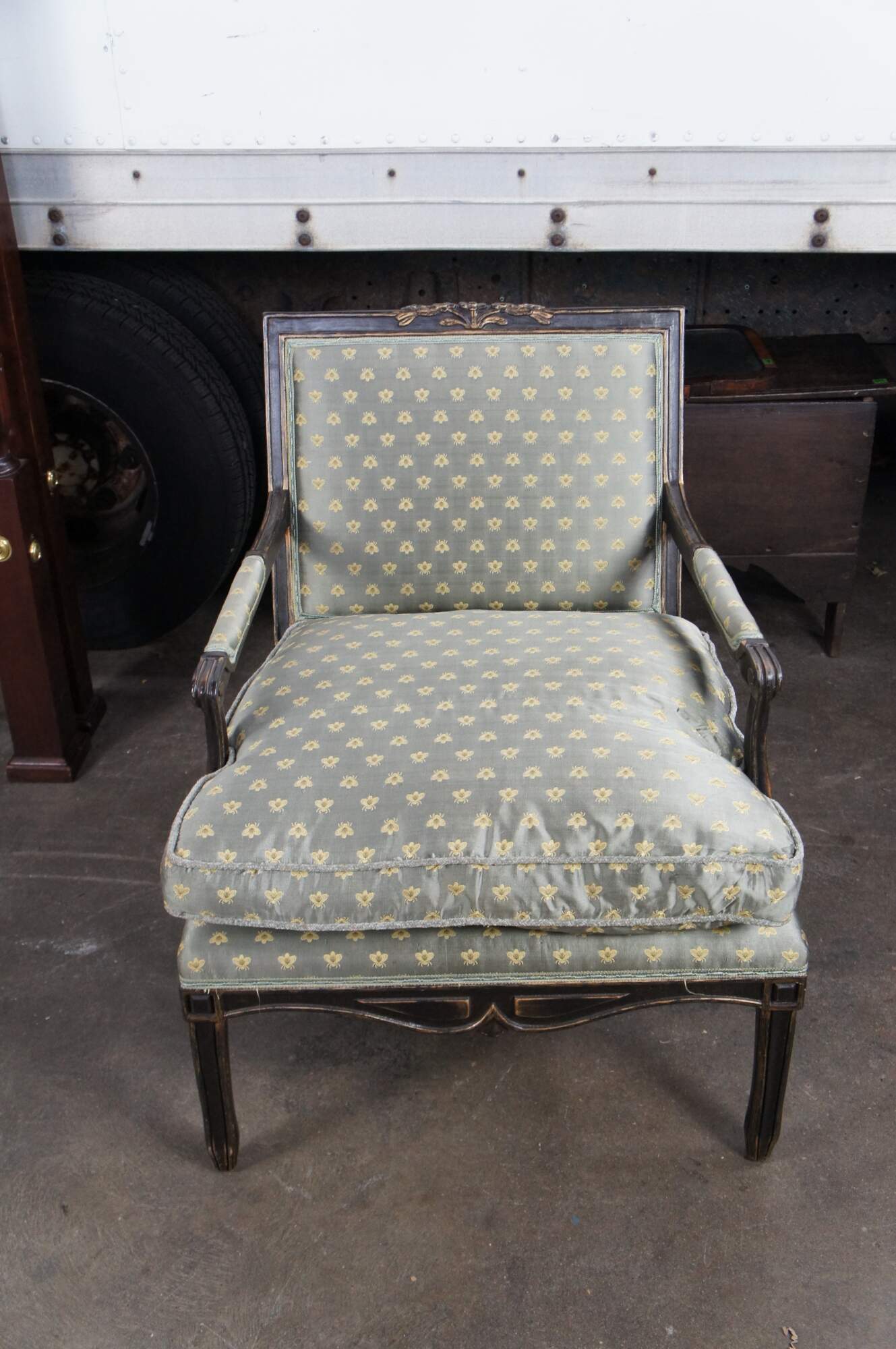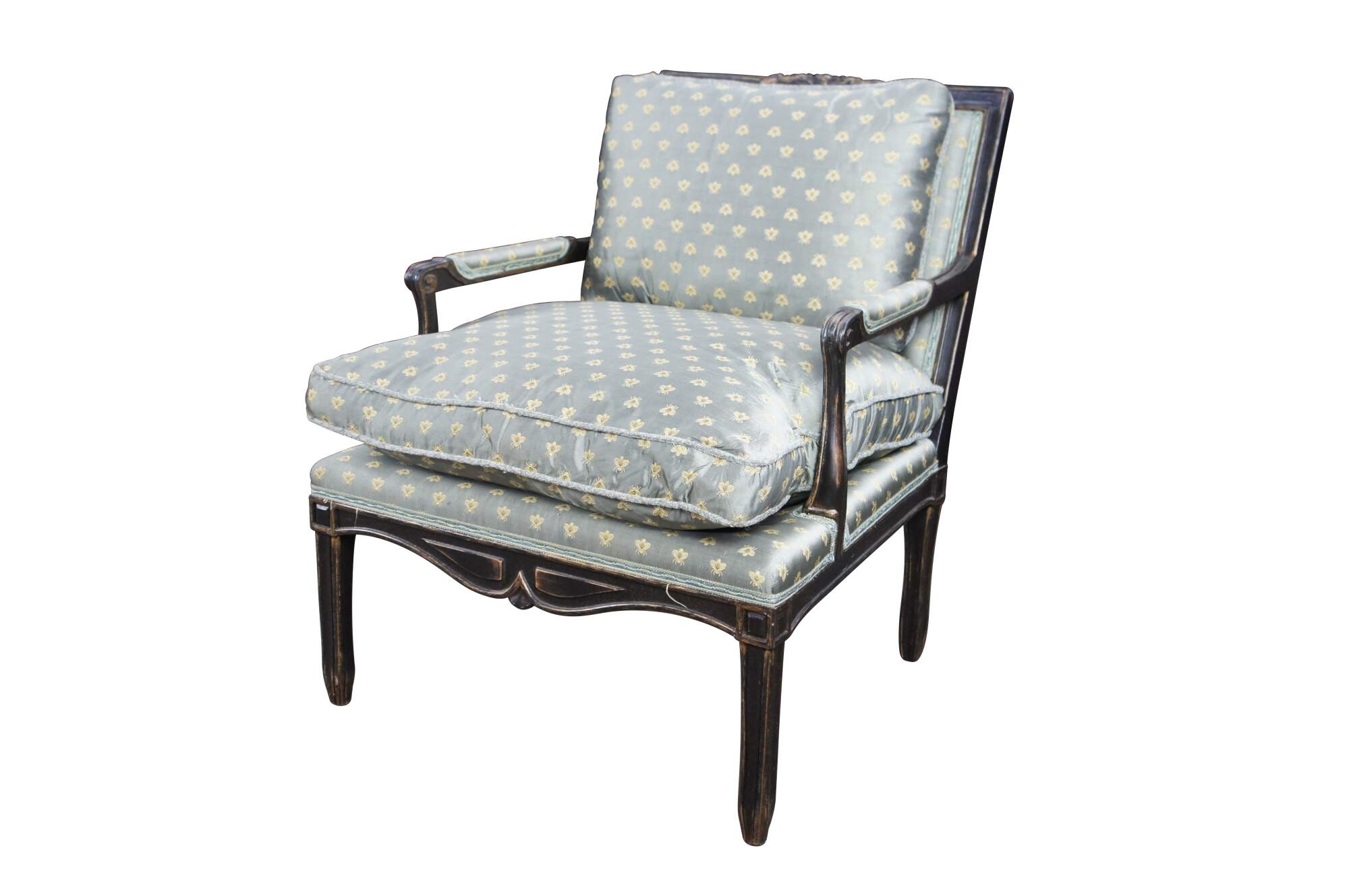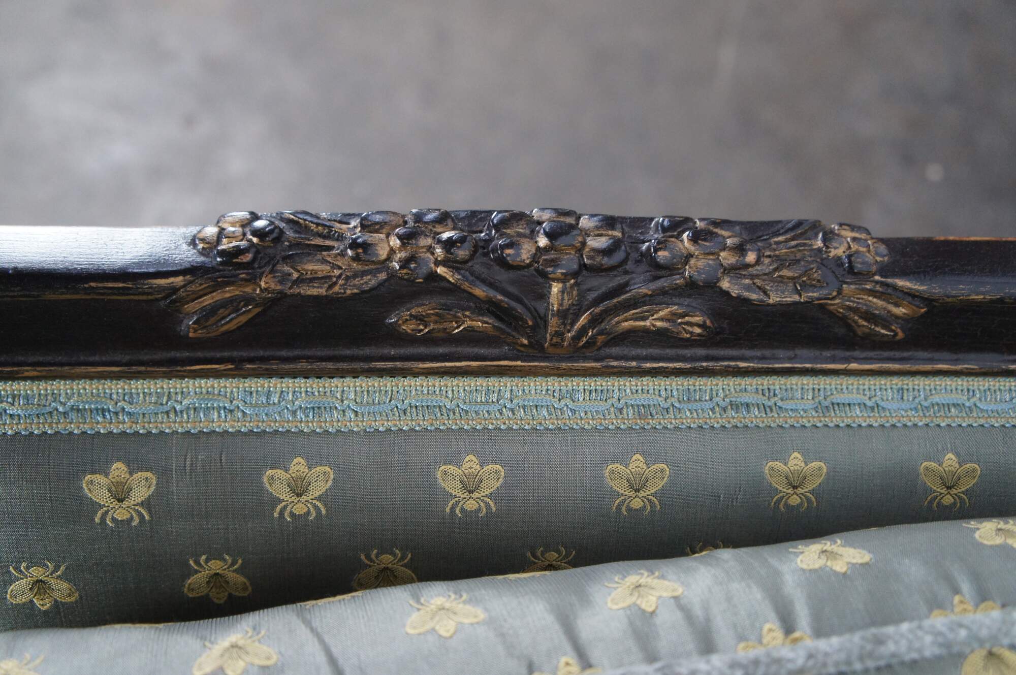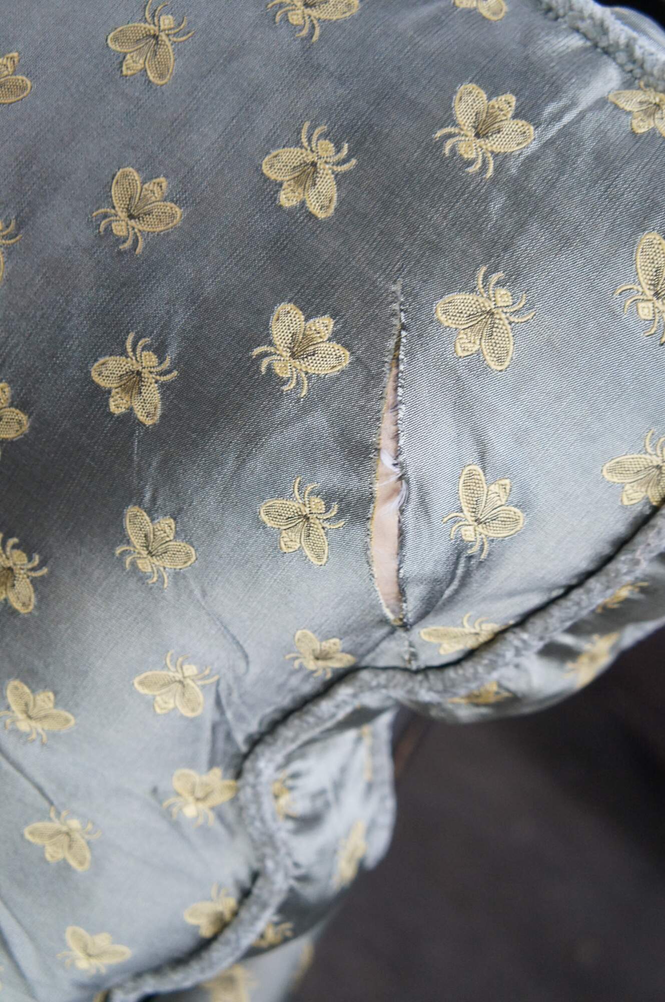 Early 21st Century Minton Spidell Cressant French Louis XVI Fauteuil Arm Chair. Features an ebonized frame with gold accents. The seat and cushions are upholstered in Scalamandre silk with a bee pattern.