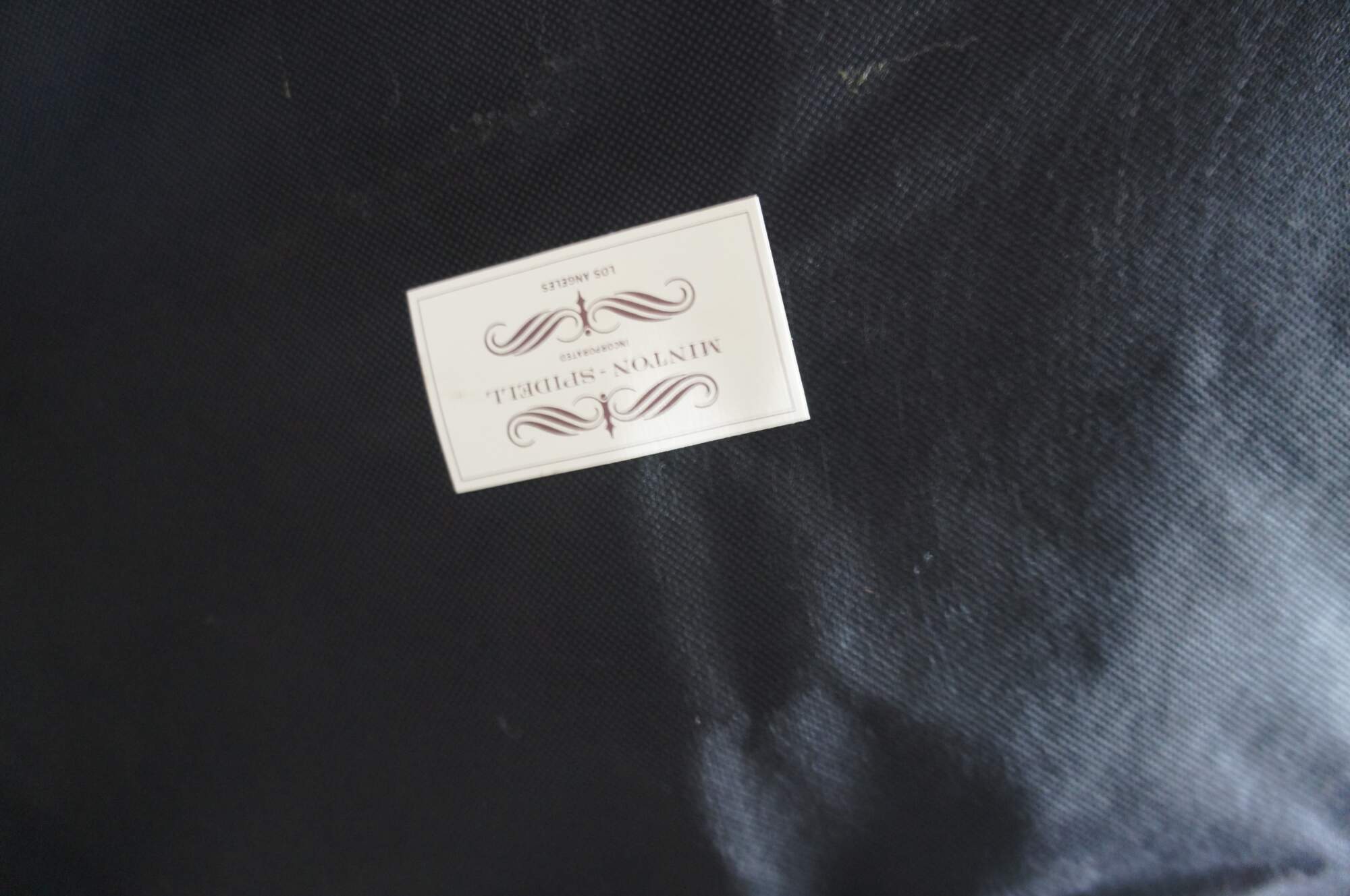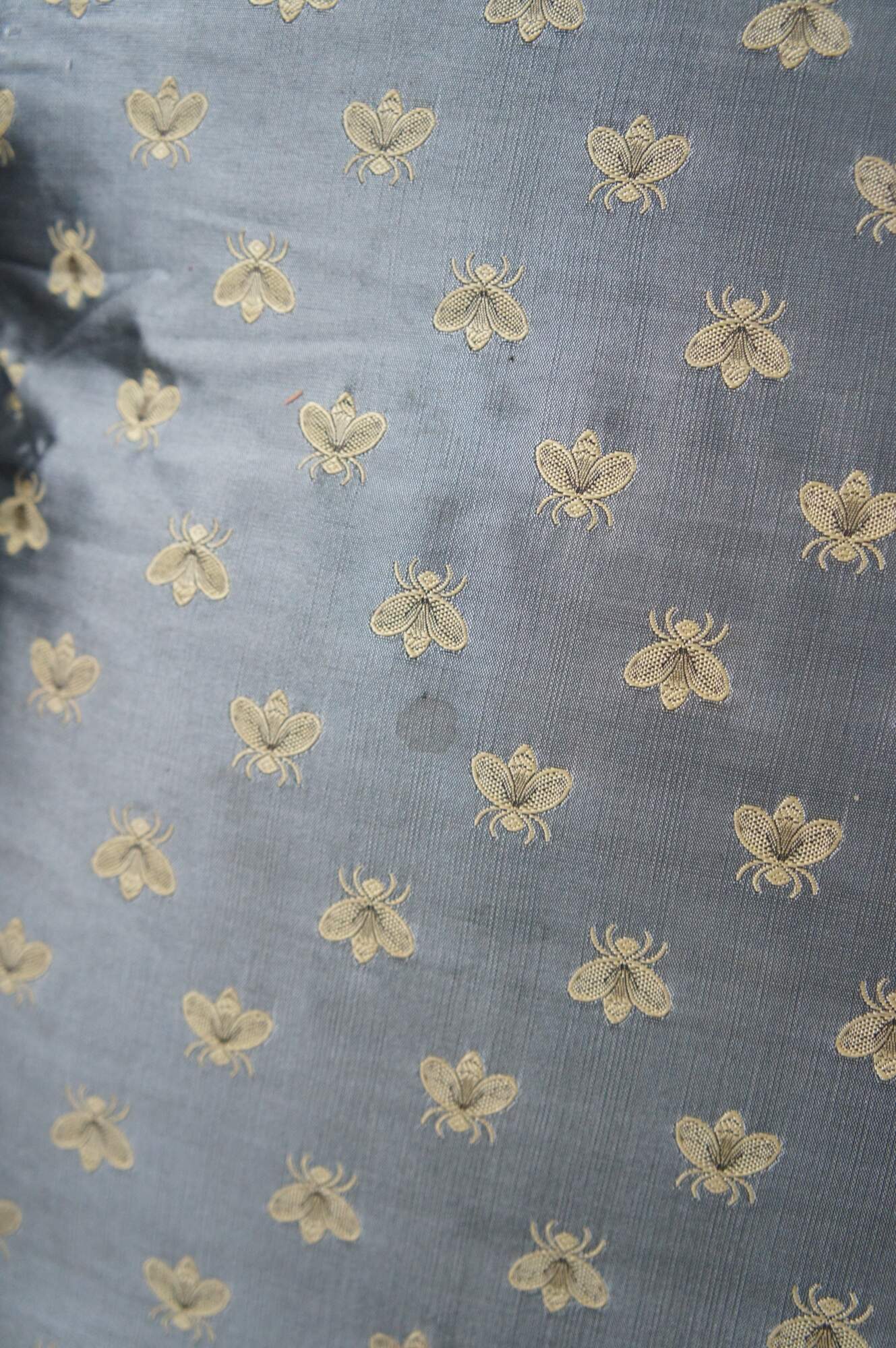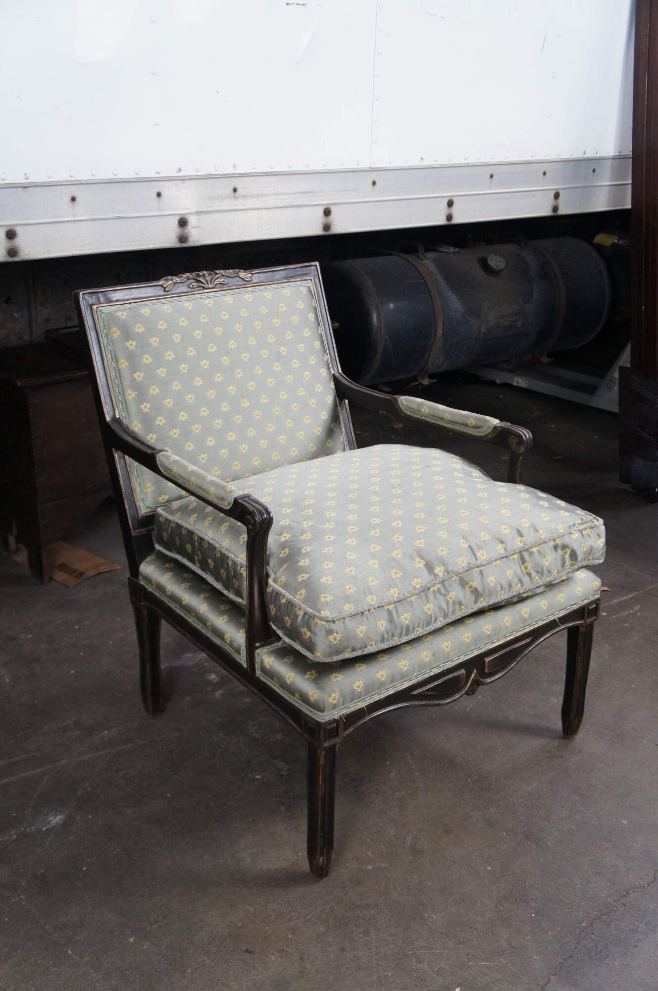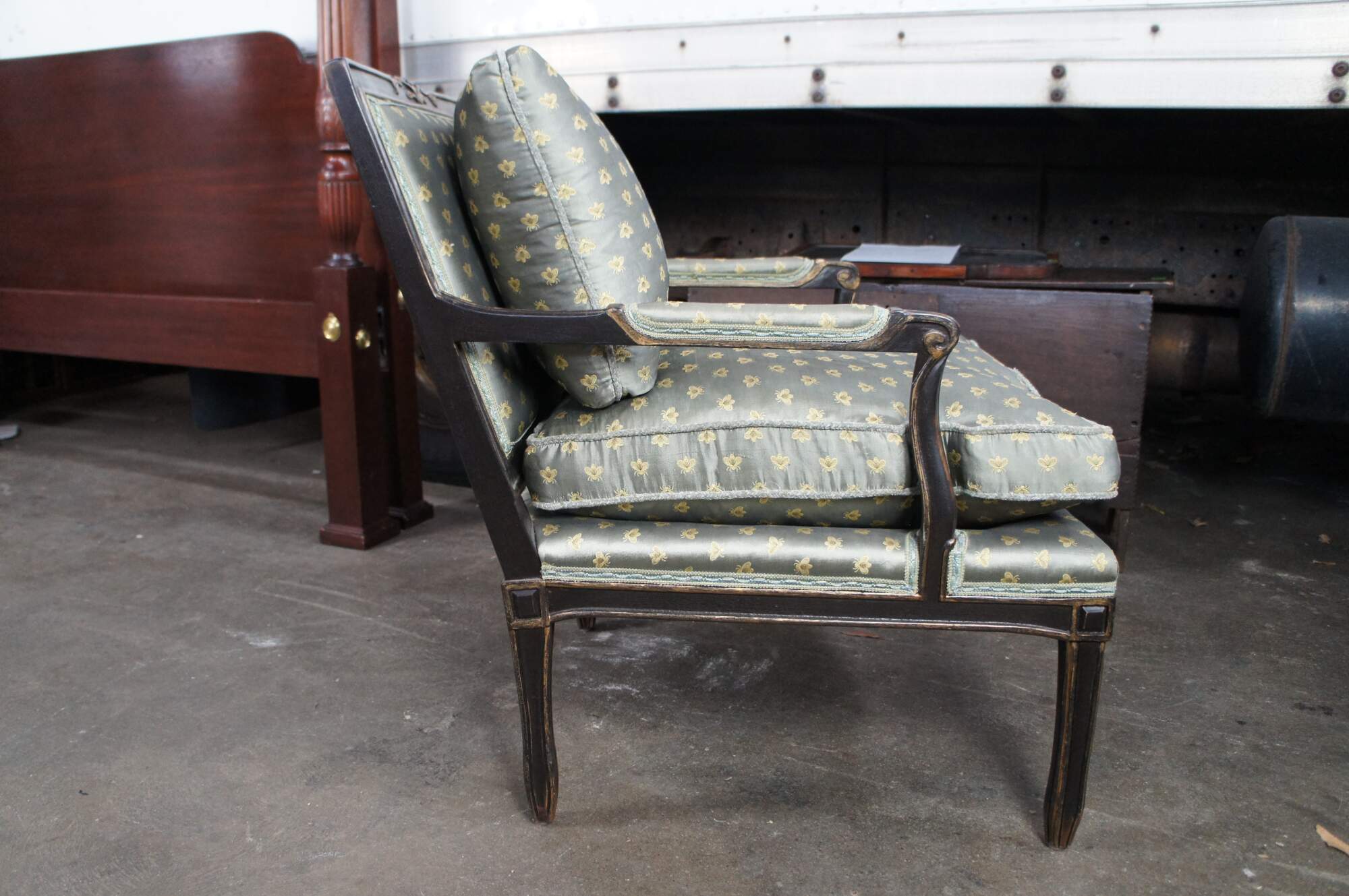 Early 21st Century Minton Spidell Cressant French Louis XVI Fauteuil Arm Chair. Features an ebonized frame with gold accents. The seat and cushions are upholstered in Scalamandre silk with a bee pattern.