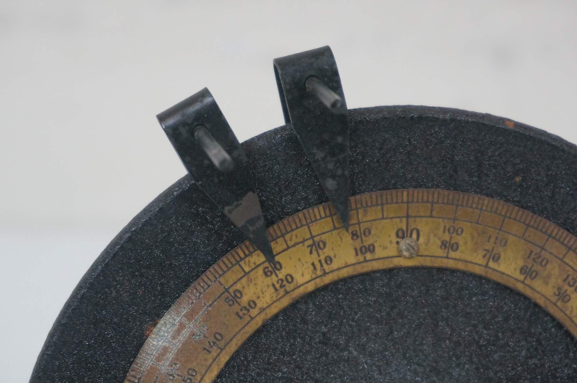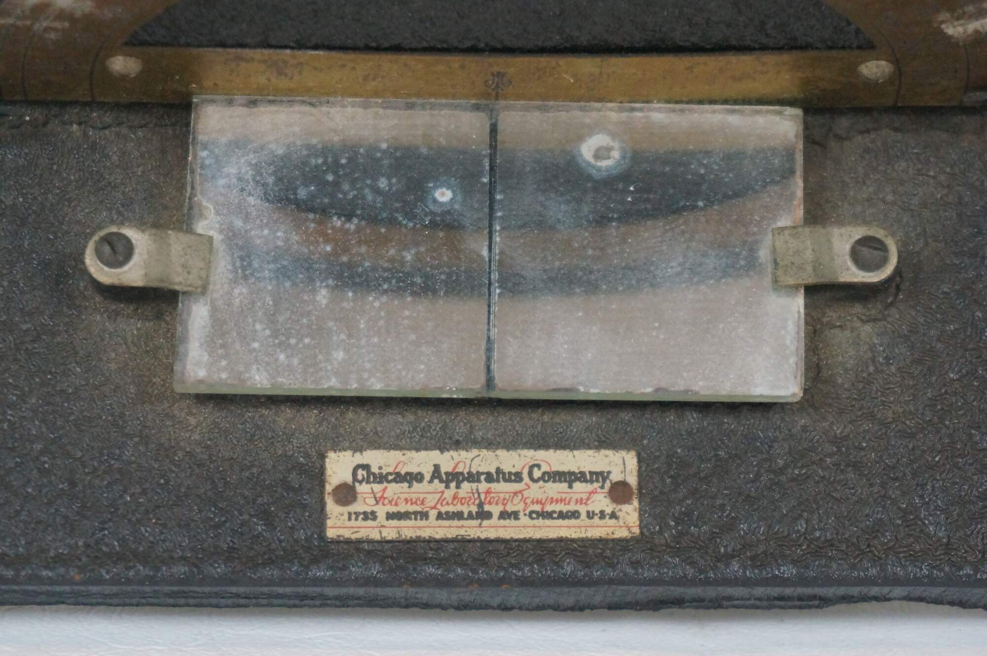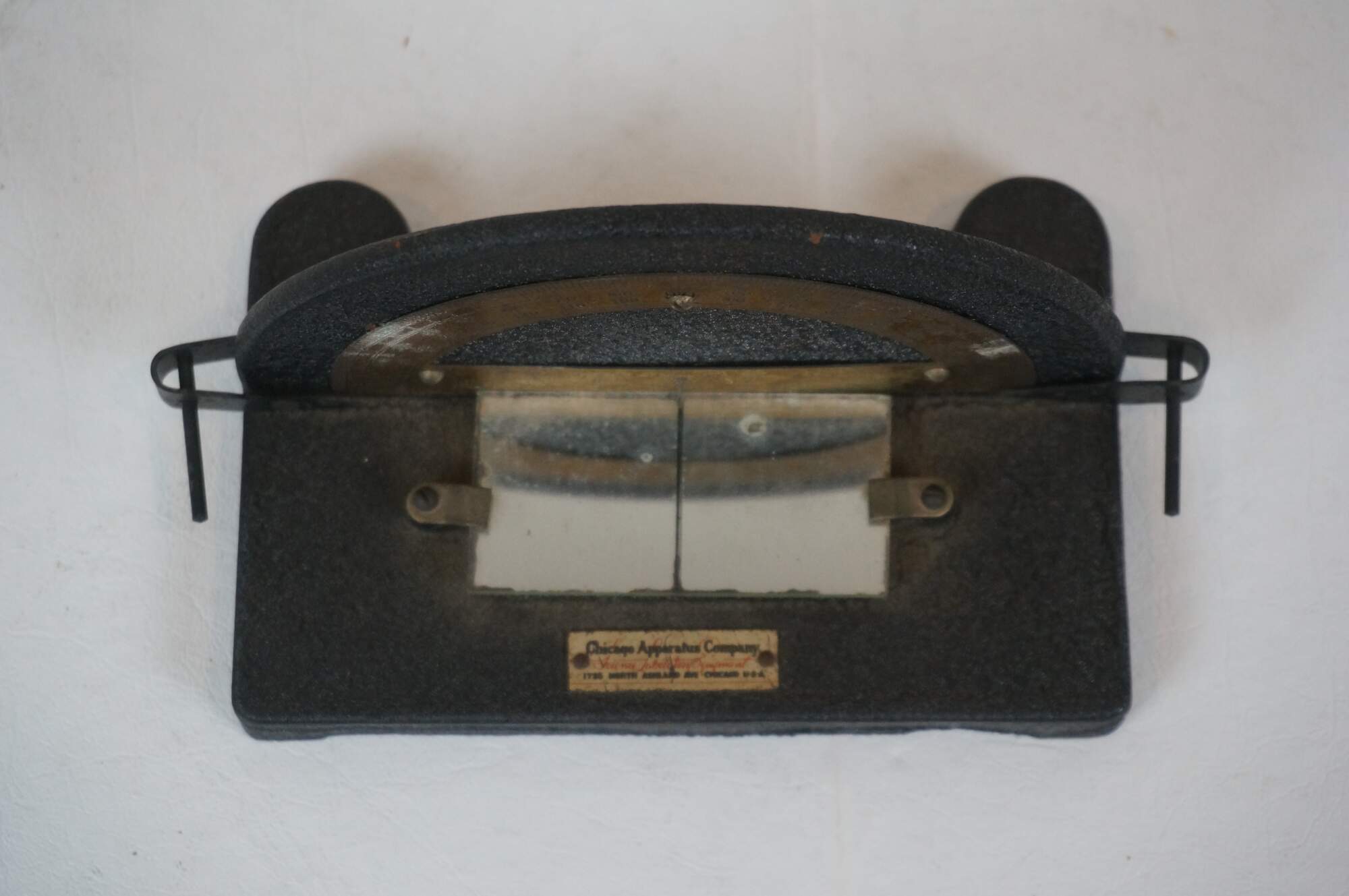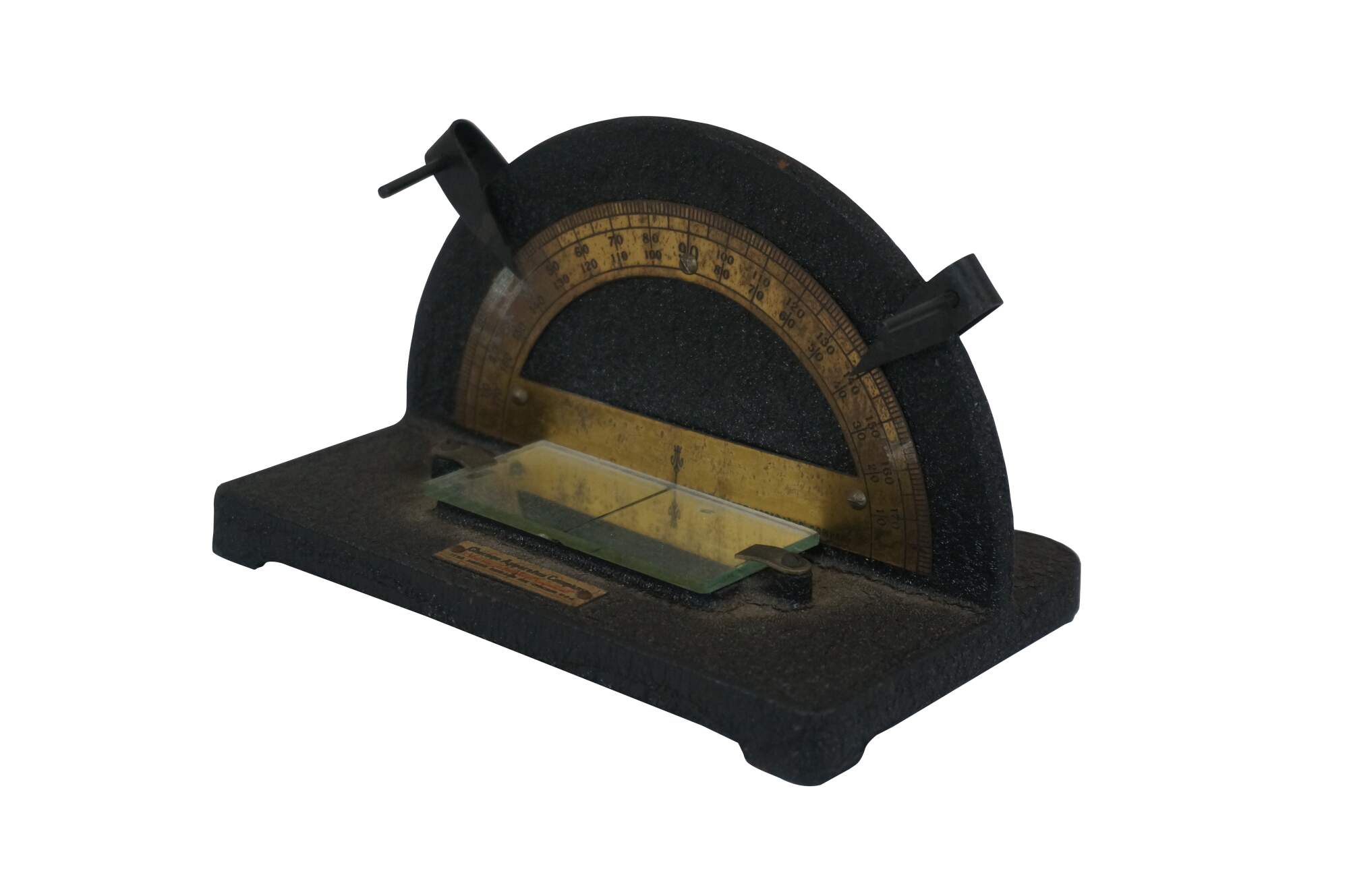 Early 20th century scientific apparatus consisting of an L shaped iron base set with a small mirror below a brass protractor and two rotating indicators. Likely for use in demonstarting / measuring the angle oof incidence and reflection of a beam of light. Produced by the Chicago Apparatus Company of Chicago, USA. Faience Laboratory Equipment.