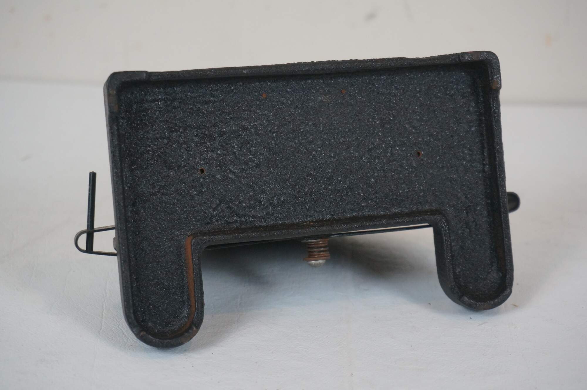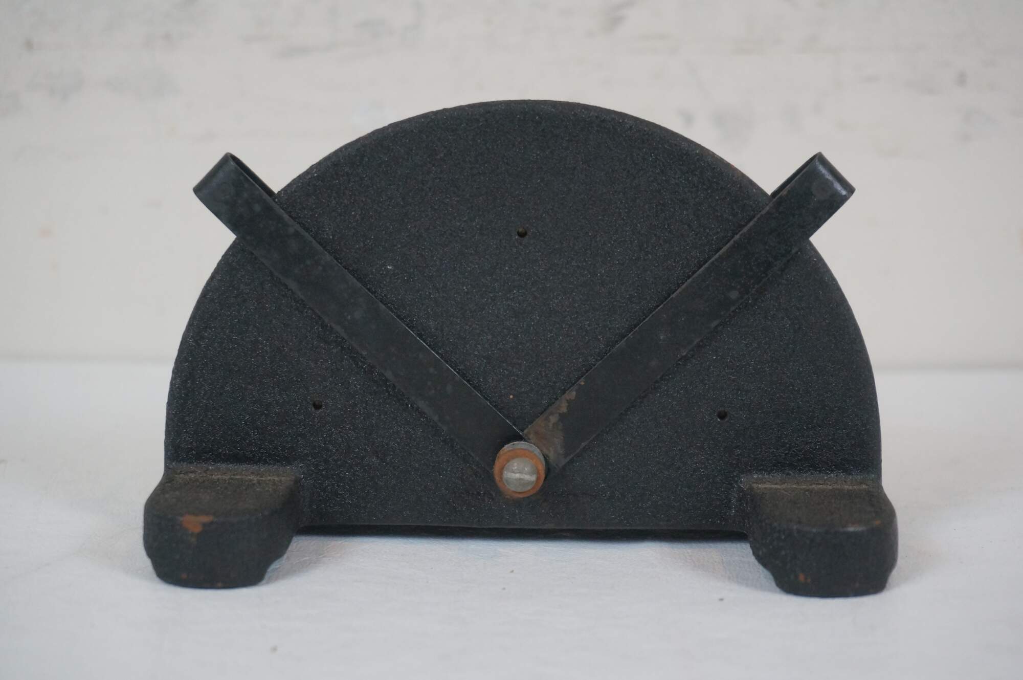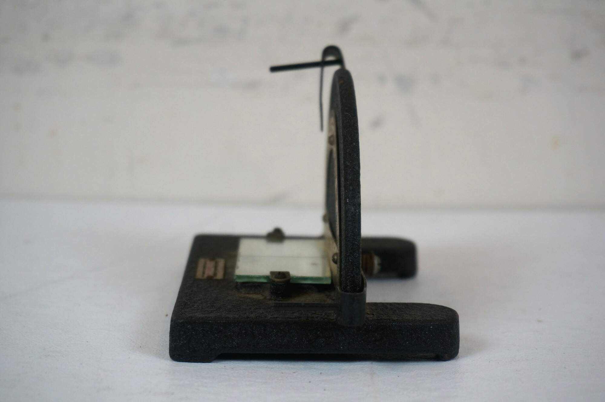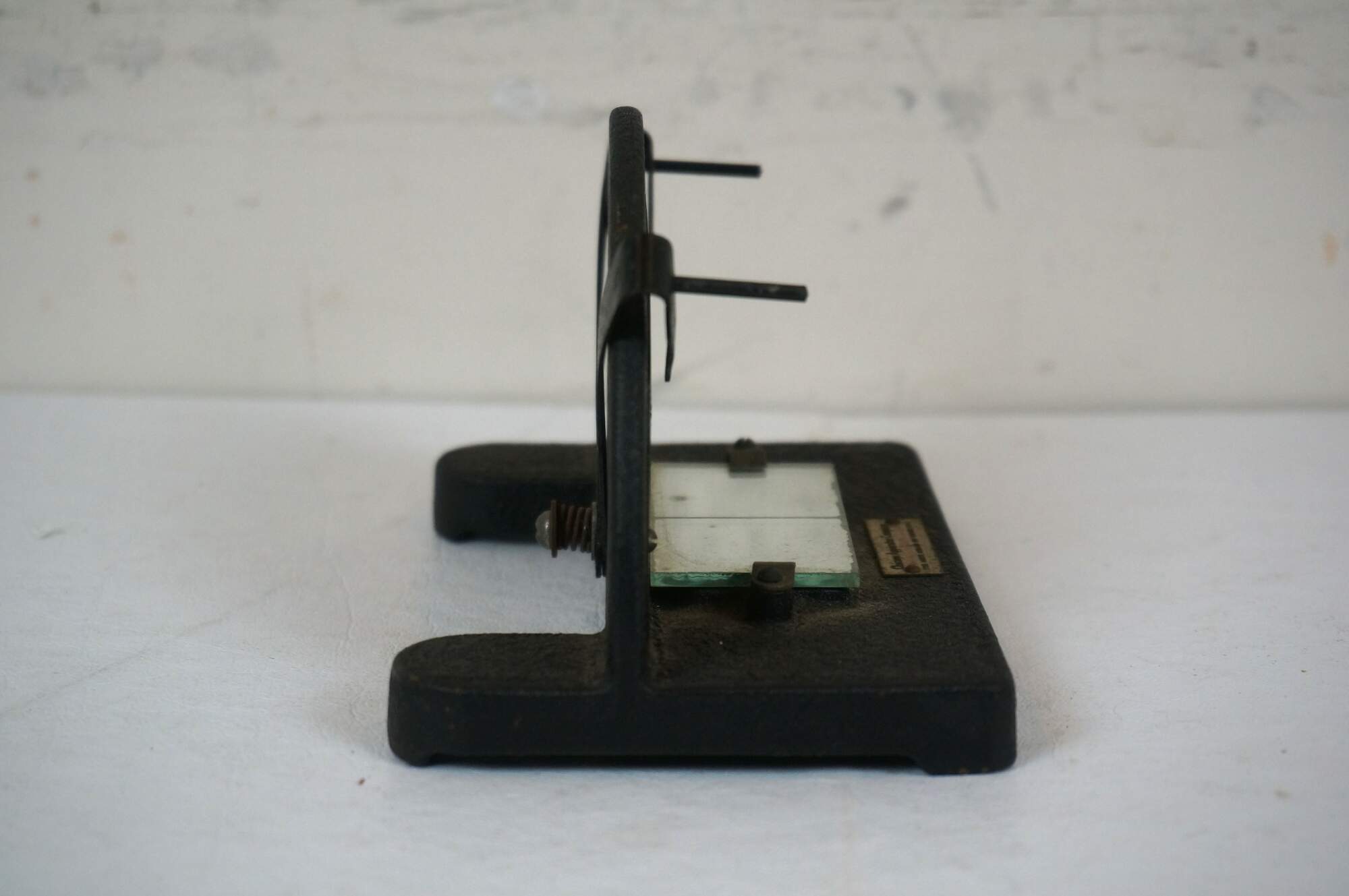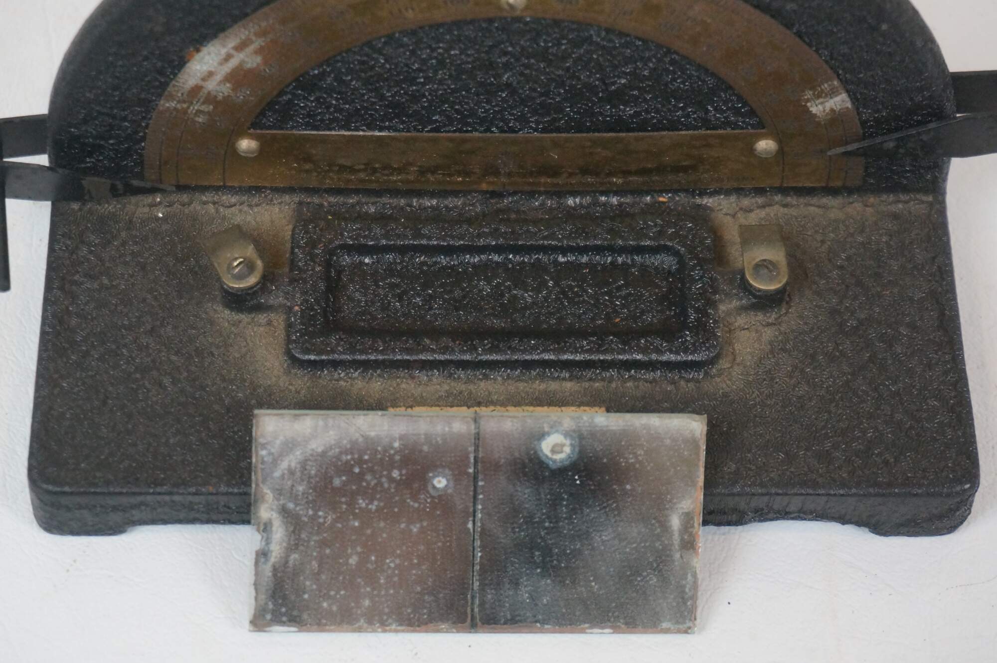 Early 20th century scientific apparatus consisting of an L shaped iron base set with a small mirror below a brass protractor and two rotating indicators. Likely for use in demonstarting / measuring the angle oof incidence and reflection of a beam of light. Produced by the Chicago Apparatus Company of Chicago, USA. Faience Laboratory Equipment.