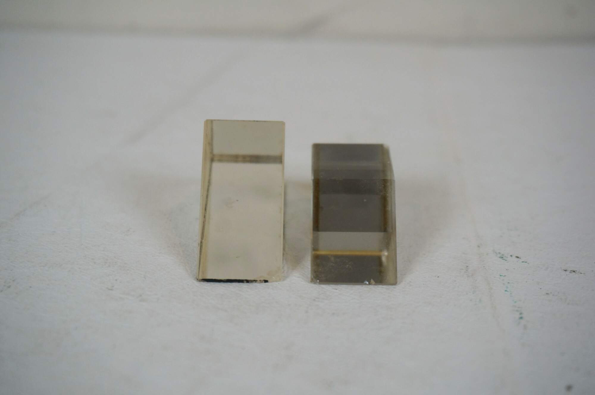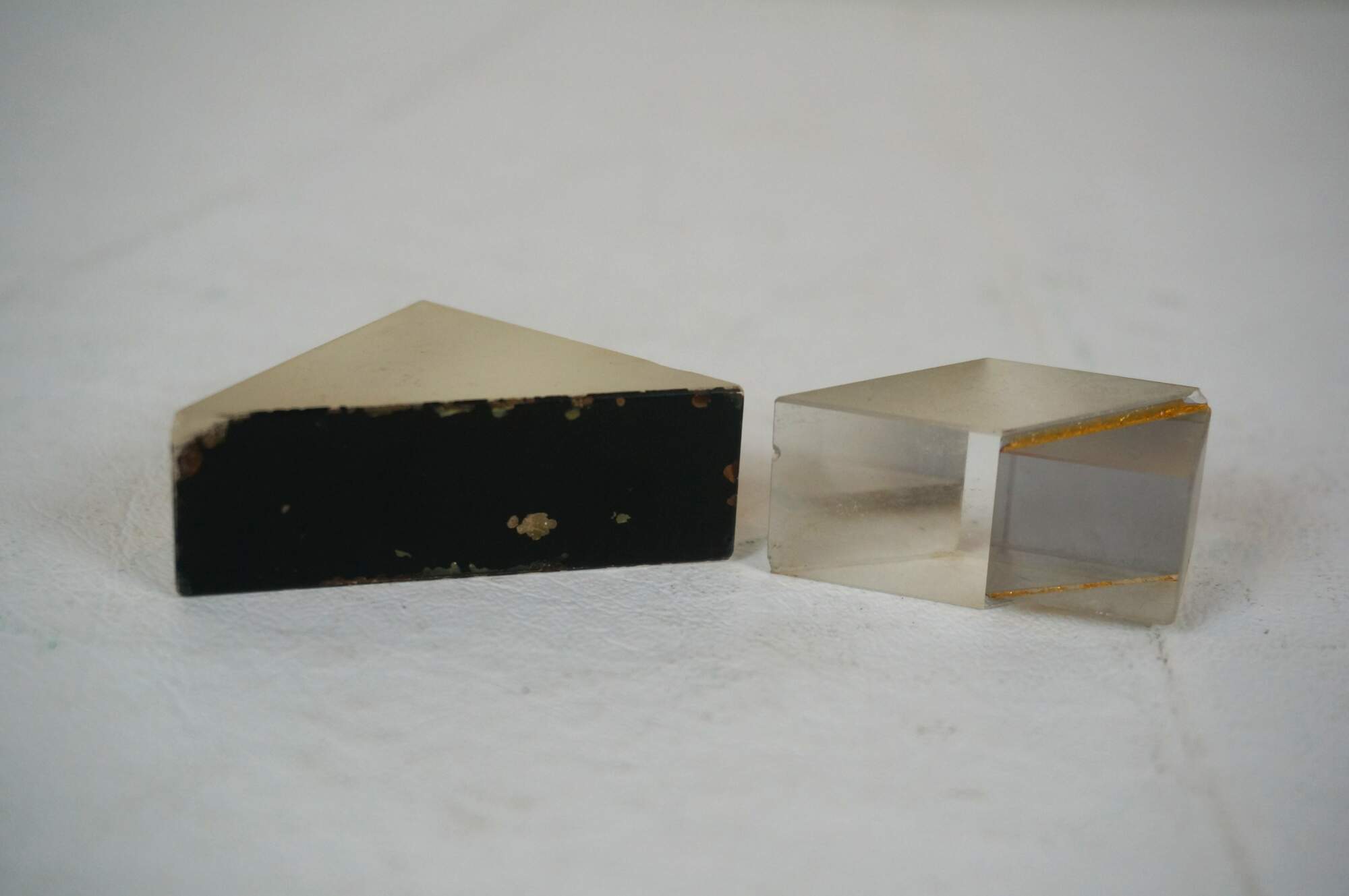 Pair of vintage optical glass prisms - one pyramidal and one trapezoidal - and Activity Guide by United Scientific Supplies, Inc.