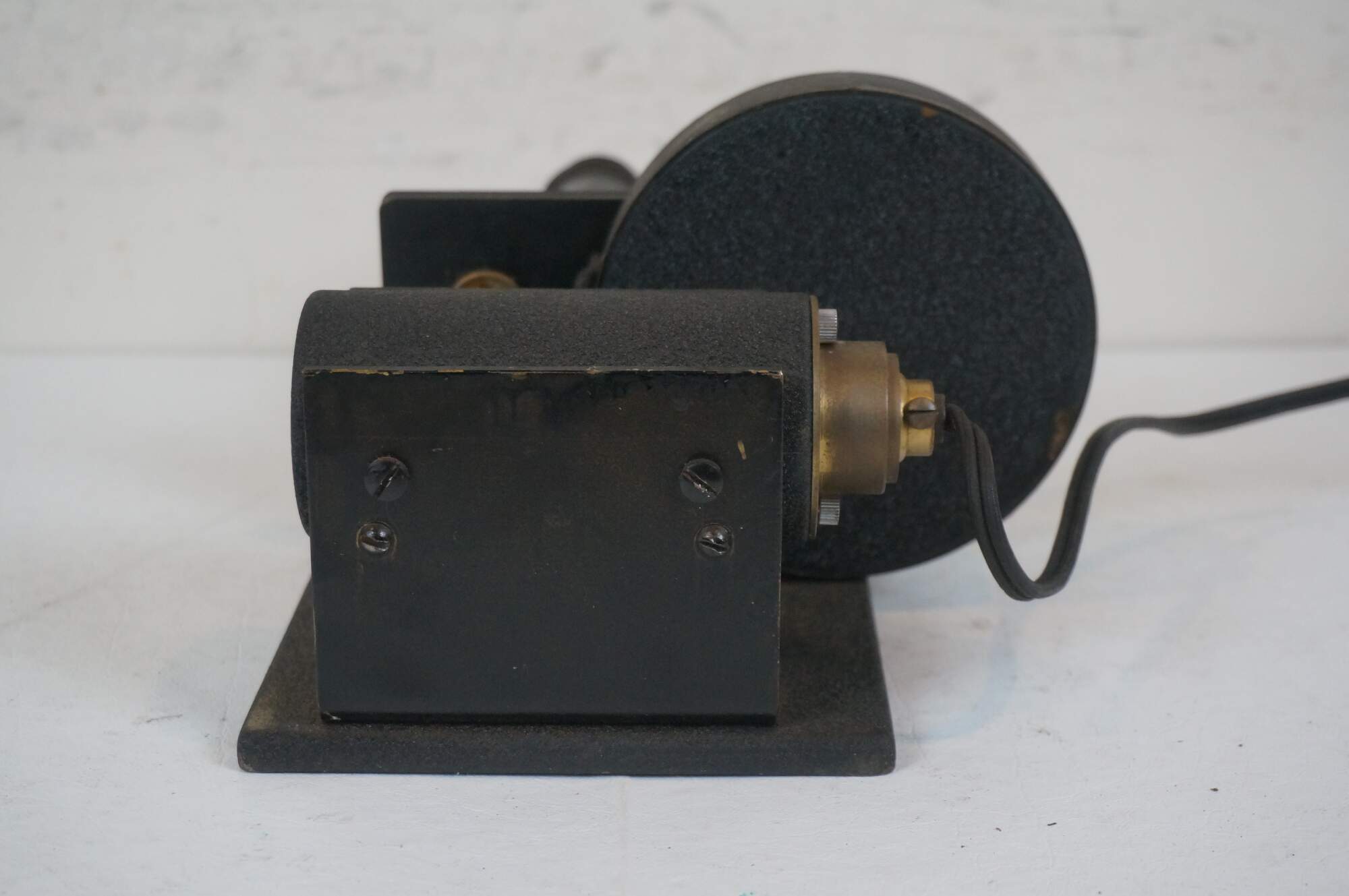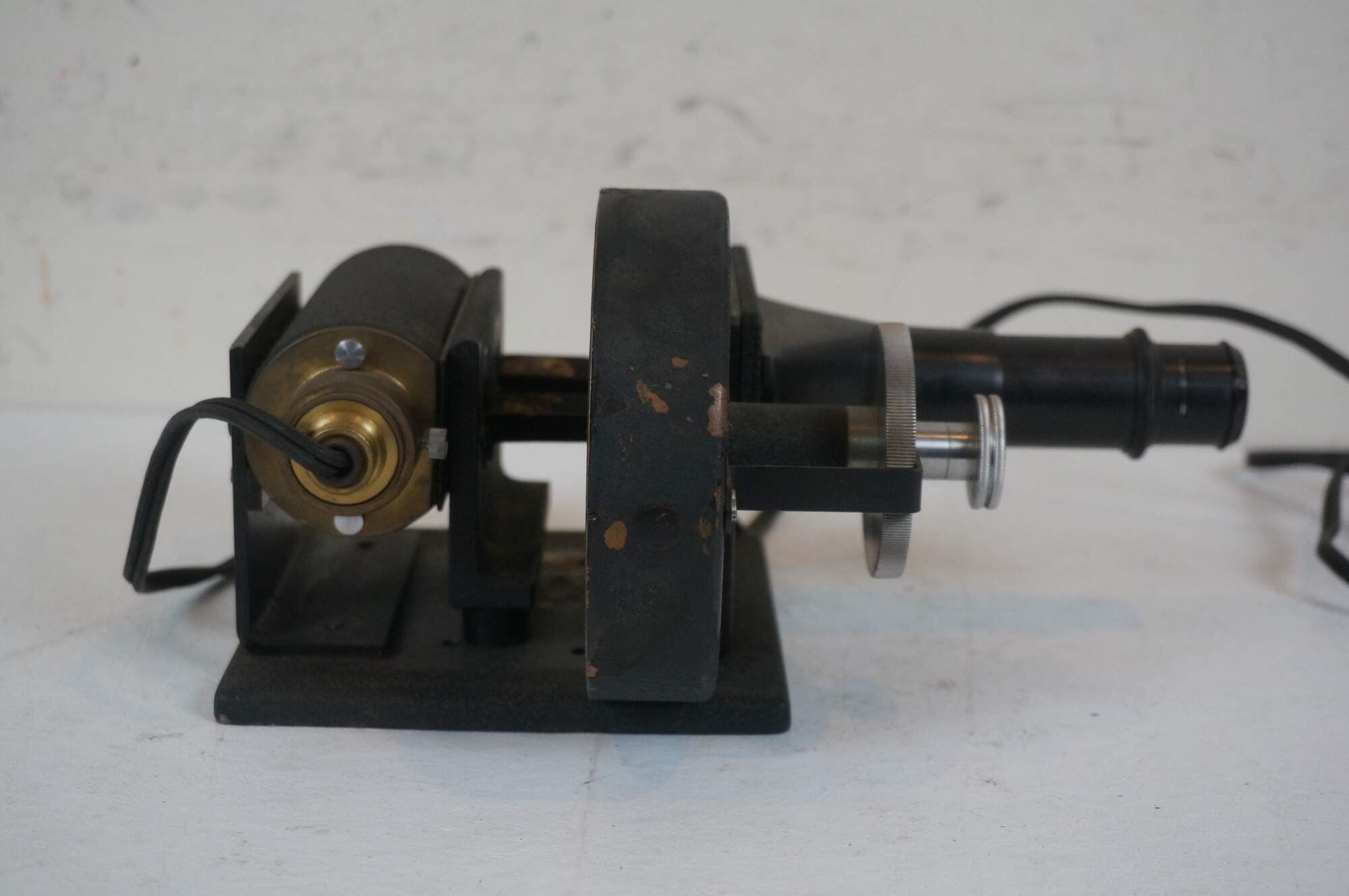 Mid to early century optical measuring device. "This device features a light which shines a beam of light through two openings, one of which passes through the assembly with two nested dials, then rejoining them with prisms at the eyepiece. By turning the dials and comparing the light on each side, measurements can be made.