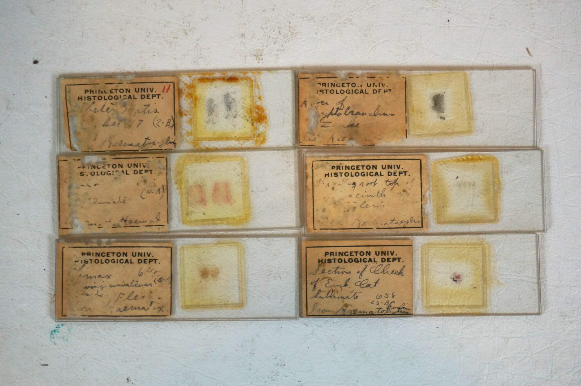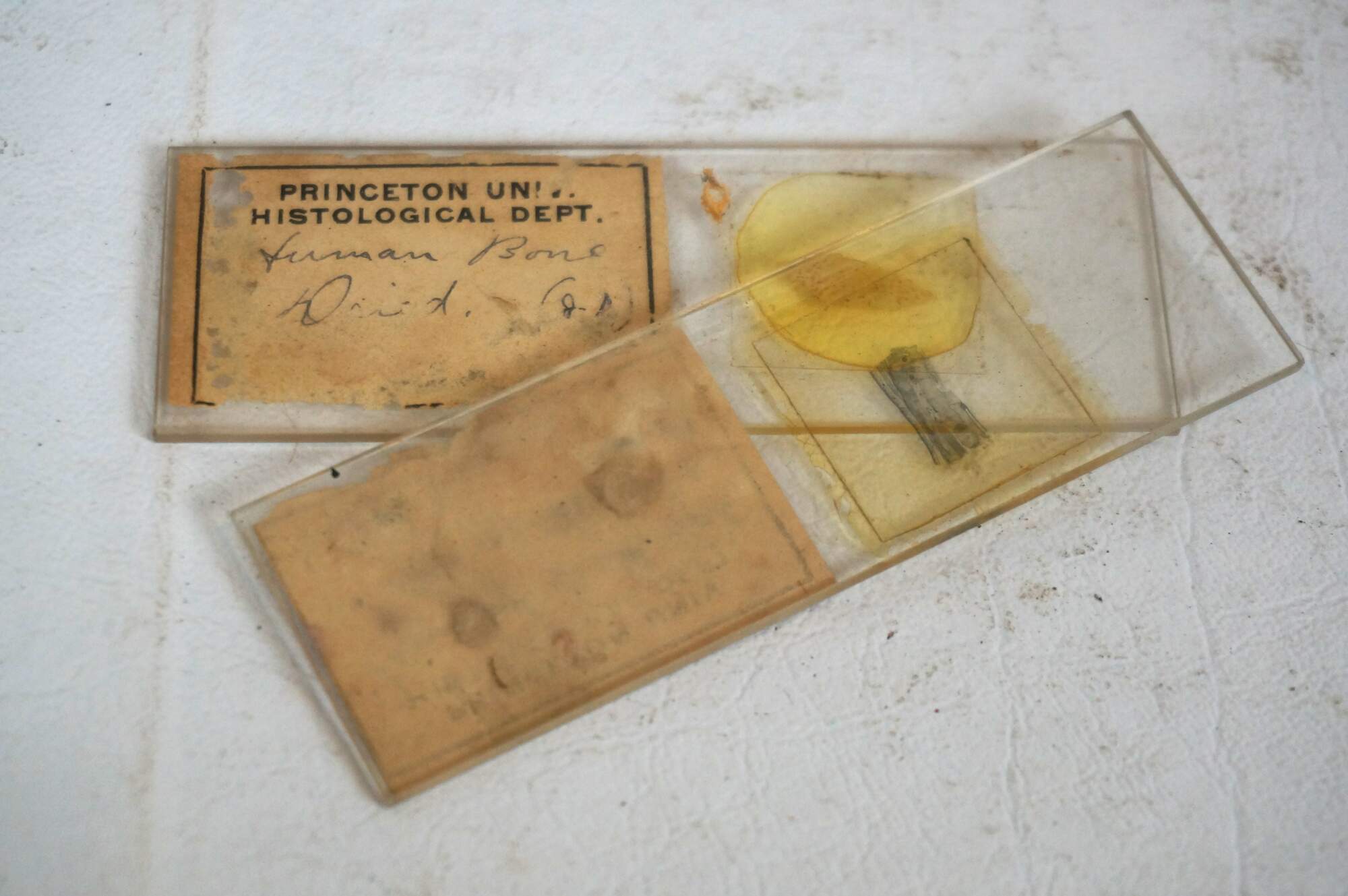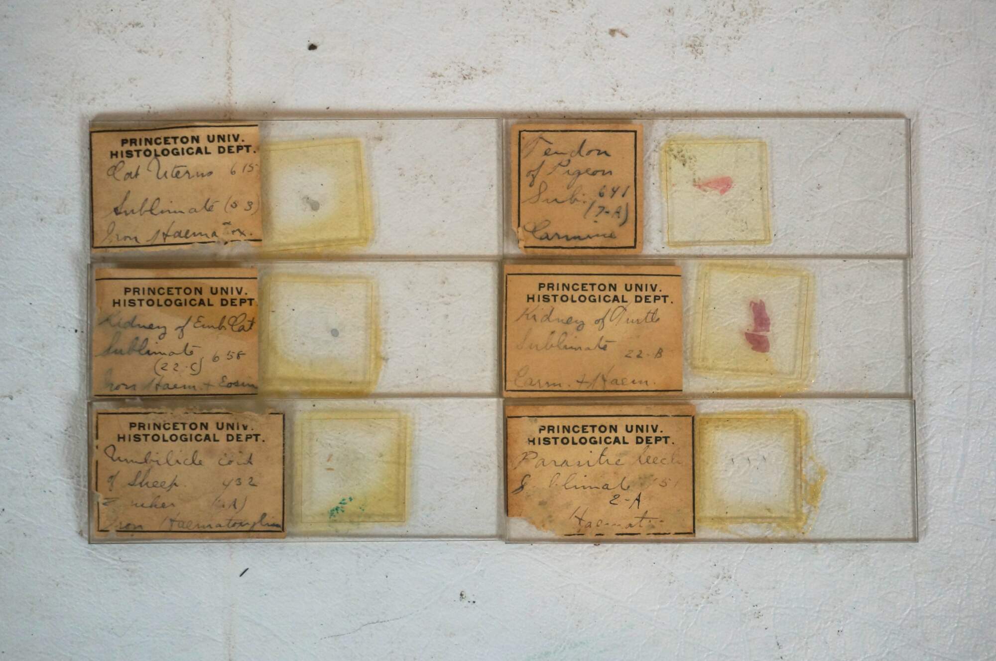 Rare antique circa 1904 set of 30 early prepared specimen glass microscope slides. Hand-written paper labels from the Princeton University Histological Department. Includes two wooden storage boxes with loose lids; interiors feature labeled slots for 25 slides each. Lids marked W.S. Schultz 1904.